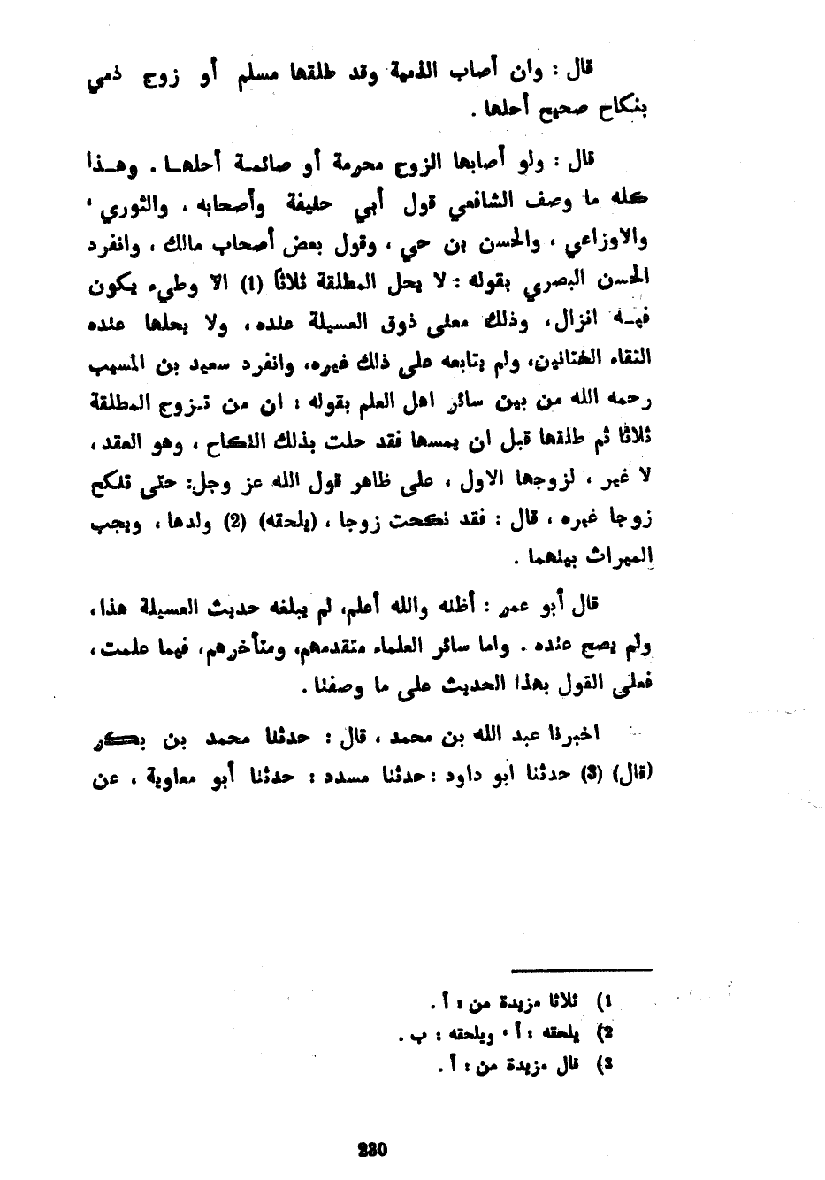 قَالَ وَإِنْ أَصَابَ الذِّمِّيَّةَ وَقَدْ طَلَّقَهَا مُسْلِمٌ أَوْ زَوْجٌ ذِمِّيٌّ بِنِكَاحٍ صَحِيحٍ أَحَلَّهَا قَالَ وَلَوْ أَصَابَهَا الزَّوْجُ مُحْرِمَةً أَوْ صَائِمَةً أَحَلَّهَا وَهَذَا كُلُّهُ مَا وَصَفَ الشَّافِعِيُّ قَوْلُ أَبِي حَنِيفَةَ وَأَصْحَابُهُ وَالثَّوْرِيُّ وَالْأَوْزَاعِيُّ وَالْحُسْنُ بْنُ حَيٍّ وَقَوْلُ بَعْضِ أَصْحَابِ مَالِكٍ وَانْفَرَدَ الْحَسَنُ الْبَصْرِيُّ بقوله لا يحل المطلقة ثلاثا إلا وطئ يَكُونُ فِيهِ إِنْزَالٌ وَذَلِكَ مَعْنَى ذَوْقُ الْعُسَيْلَةَ عِنْدَهُ وَلَا يُحِلُّهَا عِنْدَهُ الْتِقَاءُ الْخِتَانَيْنِ وَلَمْ يُتَابِعْهُ عَلَى ذَلِكَ غَيْرُهُ وَانْفَرَدَ سَعِيدُ بْنُ الْمُسَيَّبِ رَحِمَهُ اللَّهُ مِنْ بَيْنِ سَائِرِ أَهْلِ الْعِلْمِ بِقَوْلِهِ إِنَّ مَنْ تَزَوَّجَ الْمُطَلَّقَةَ ثَلَاثًا ثُمَّ طَلَّقَهَا قَبْلَ أَنْ يَمَسَّهَا فَقَدْ حَلَّتْ بِذَلِكَ النِّكَاحِ وَهُوَ الْعَقْدُ لَا غَيْرَ لِزَوْجِهَا الْأَوَّلِ عَلَى ظَاهِرِ قَوْلِ اللَّهِ عَزَّ وَجَلَّ حَتَّى تَنْكِحَ زَوْجًا غَيْرَهُ قَالَ فَقَدْ نَكَحَتْ زَوْجًا (يَلْحَقُهُ) وَلَدُهَا وَيَجِبُ الْمِيرَاثُ بَيْنَهُمَا قَالَ أَبُو عُمَرَ أَظُنُّهُ وَاللَّهُ أَعْلَمُ لَمْ يَبْلُغْهُ حَدِيثُ الْعُسَيْلَةِ هَذَا وَلَمْ يَصِحَّ عِنْدَهُ وَأَمَّا سَائِرُ الْعُلَمَاءِ مُتَقَدِّمُهُمْ وَمُتَأَخِّرُهُمْ فِيمَا عَلِمْتُ فَعَلَى الْقَوْلِ بِهَذَا الْحَدِيثِ عَلَى مَا وَصَفْنَا أَخْبَرَنَا عَبْدُ اللَّهِ بْنُ مُحَمَّدٍ قَالَ حَدَّثَنَا مُحَمَّدُ بْنُ بَكْرٍ (قَالَ) حَدَّثَنَا أَبُو دَاوُدَ حَدَّثَنَا مُسَدَّدٌ حَدَّثَنَا أَبُو مُعَاوِيَةَ عَنِ