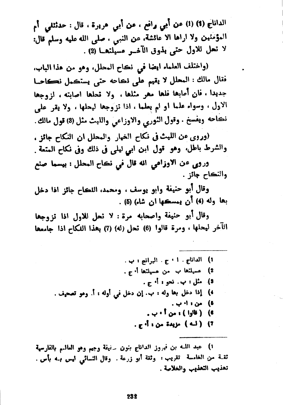 الدَّانَاجُ عَنْ أَبِي رَافِعٍ عَنْ أَبِي هُرَيْرَةَ قَالَ حَدَّثَتْنِي أُمُّ الْمُؤْمِنِينَ وَلَا أَرَاهَا إِلَّا عَائِشَةَ عَنِ النَّبِيِّ صَلَّى اللَّهُ عَلَيْهِ وَسَلَّمَ قَالَ لَا تَحِلُّ لِلْأَوَّلِ حَتَّى يَذُوقَ الْآخَرُ عُسَيْلَتَهَا (وَاخْتَلَفَ الْعُلَمَاءُ أَيْضًا فِي نِكَاحِ الْمُحَلِّلِ وَهُوَ مِنْ هَذَا الْبَابِ فَقَالَ مَالِكٌ الْمُحَلِّلُ لَا يُقِيمُ عَلَى نِكَاحِهِ حَتَّى يَسْتَكْمِلَ نِكَاحًا جَدِيدًا فَإِنْ أَصَابَهَا فَلَهَا مَهْرُ مِثْلِهَا وَلَا تُحِلُّهَا إِصَابَتُهُ لِزَوْجِهَا الْأَوَّلِ وَسَوَاءٌ عَلِمَا أَوْ لَمْ يَعْلَمَا إِذَا تَزَوَّجَهَا لِيُحِلَّهَا وَلَا يُقَرُّ عَلَى نِكَاحِهِ وَيُفْسَخُ وَقَوْلُ الثَّوْرِيِّ وَالْأَوْزَاعِيِّ وَاللَّيْثِ مِثْلُ قَوْلِ مَالِكٍ (وَرُوِيَ عَنِ اللَّيْثِ فِي نِكَاحِ الْخِيَارِ وَالْمُحَلِّلِ أَنَّ النِّكَاحَ جَائِزٌ وَالشَّرْطَ بَاطِلٌ وَهُوَ قَوْلُ ابْنِ أَبِي لَيْلَى فِي ذَلِكَ وَفِي نِكَاحِ الْمُتْعَةِ وَرُوِيَ عَنِ الْأَوْزَاعِيِّ أنه قال في نكاح المحلل بيسما صَنَعَ وَالنِّكَاحُ جَائِزٌ وَقَالَ أَبُو حَنِيفَةَ وَأَبُو يُوسُفَ وَمُحَمَّدٌ النِّكَاحُ جَائِزٌ إِذَا دَخَلَ بِهَا وَلَهُ (4) أَنْ يُمْسِكَهَا إِنْ شَاءَ) وَقَالَ أَبُو حَنِيفَةَ وَأَصْحَابُهُ مَرَّةً لَا تَحِلُّ لِلْأَوَّلِ إِذَا تزوجها الآخر ليحلها وَمَرَّةً قَالُوا تَحِلُّ (لَهُ) بِهَذَا النِّكَاحِ إِذَا جامعها