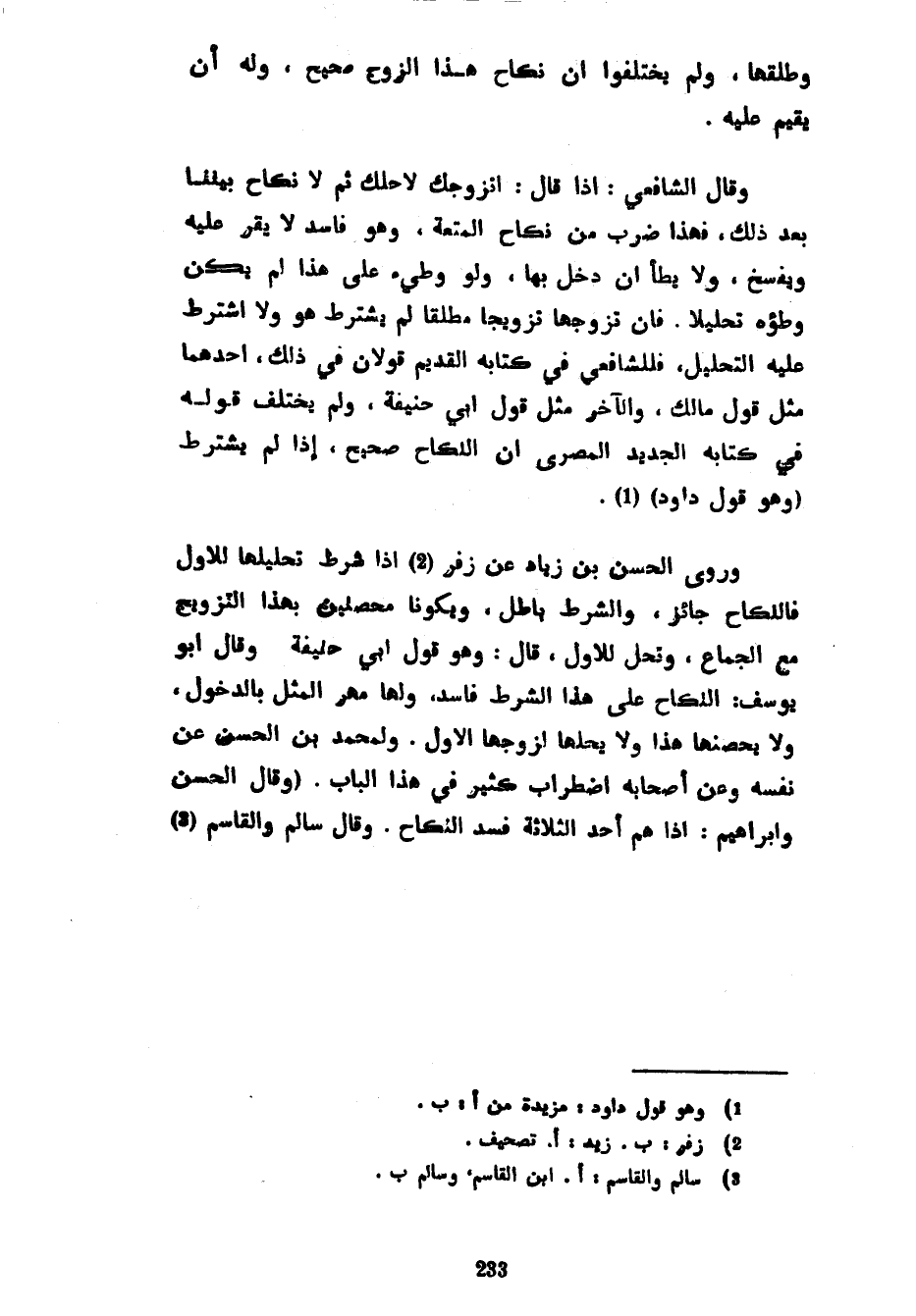 وَطَلَّقَهَا وَلَمْ يَخْتَلِفُوا أَنَّ نِكَاحَ هَذَا الزَّوْجِ صَحِيحٌ وَلَهُ أَنْ يُقِيمَ عَلَيْهِ وَقَالَ الشَّافِعِيُّ إِذَا قَالَ أَتَزَوَّجُكِ لِأُحِلَّكِ ثُمَّ لَا نِكَاحَ بَيْنَنَا بَعْدَ ذَلِكَ فَهَذَا ضَرْبٌ مِنْ نِكَاحِ الْمُتْعَةِ وَهُوَ فَاسِدٌ لَا يُقَرُّ عَلَيْهِ وَيُفْسَخُ وَلَا يَطَأُ إِنْ دَخَلَ بِهَا وَلَوْ وَطِئَ عَلَى هَذَا لَمْ يَكُنْ وَطْؤُهُ تَحْلِيلًا فَإِنْ تَزَوَّجَهَا تَزْوِيجًا مُطْلَقًا لَمْ يَشْتَرِطْ هُوَ وَلَا اشْتُرِطَ عَلَيْهِ التَّحْلِيلُ فَلِلشَّافِعِيِّ فِي كِتَابِهِ الْقَدِيمِ قَوْلَانِ فِي ذَلِكَ أَحَدُهُمَا مِثْلُ قَوْلِ مَالِكٍ وَالْآخَرُ مِثْلُ قَوْلِ أَبِي حَنِيفَةَ وَلَمْ يَخْتَلِفْ قَوْلُهُ فِي كِتَابِهِ الْجَدِيدِ الْمِصْرِيِّ أَنَّ النِّكَاحَ صَحِيحٌ إِذَا لَمْ يَشْتَرِطْ (وَهُوَ قَوْلُ دَاوُدَ) وَرَوَى الْحَسَنُ بْنُ زِيَادٍ عَنْ زُفَرٍ إِذَا شُرِطَ تَحْلِيلِهَا لِلْأَوَّلِ فَالنِّكَاحُ جَائِزٌ وَالشَّرْطُ بَاطِلٌ وَيَكُونَا مُحْصَنَيْنِ بِهَذَا التَّزْوِيجِ مَعَ الْجِمَاعِ وَتَحِلُّ لِلْأَوَّلِ قَالَ وَهُوَ قَوْلُ أَبِي حَنِيفَةَ وَقَالَ أَبُو يُوسُفَ النِّكَاحُ عَلَى هَذَا الشَّرْطِ فَاسِدٌ وَلَهَا مَهْرُ الْمِثْلِ بِالدُّخُولِ وَلَا يُحْصِنُهَا هَذَا وَلَا يُحِلُّهَا لِزَوْجِهَا الْأَوَّلِ وَلِمُحَمَّدِ بْنِ الْحَسَنِ عَنْ نَفْسِهِ وَعَنْ أَصْحَابِهِ اضْطِرَابٌ كَثِيرٌ فِي هَذَا الْبَابِ (وَقَالَ الْحَسَنُ وَإِبْرَاهِيمُ إِذَا هَمَّ أَحَدُ الثَّلَاثَةِ فَسَدَ النِّكَاحُ وَقَالَ سَالِمٌ وَالْقَاسِمُ (3)