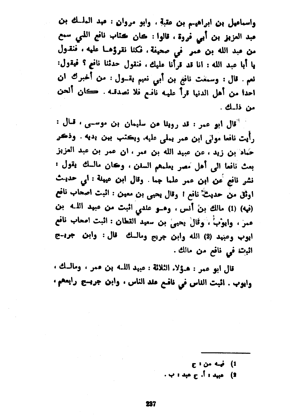 وَإِسْمَاعِيلُ بْنُ إِبْرَاهِيمَ بْنِ عُقْبَةَ وَأَبُو مَرْوَانَ عَبْدُ الْمَلِكِ بْنُ عَبْدِ الْعَزِيزِ بْنِ أَبِي فَرْوَةَ قَالُوا كَانَ كِتَابُ نَافِعٍ الَّذِي سَمِعَ مِنْ عَبْدِ اللَّهِ بْنِ عُمَرَ فِي صَحِيفَةٍ فَكُنَّا نَقْرَؤُهَا عَلَيْهِ فَنَقُولُ يَا أَبَا عَبْدِ اللَّهِ إِنَّا قَدْ قَرَأْنَا عَلَيْكَ فَنَقُولُ حَدَّثَنَا نَافِعٌ فَيَقُولُ نَعَمْ قَالَ وَسَمِعْتُ نَافِعَ بْنَ أَبِي نُعَيْمٍ يَقُولُ مَنْ أَخْبَرَكَ أَنَّ أَحَدًا مِنْ أَهْلِ الدُّنْيَا قَرَأَ عَلَيْهِ نَافِعٌ فَلَا تُصَدِّقْهُ كَانَ أَلْحَنَ مِنْ ذَلِكَ قَالَ أَبُو عُمَرَ قَدْ رُوِّينَا عَنْ سُلَيْمَانَ بْنِ مُوسَى قَالَ رَأَيْتُ نَافِعًا مَوْلَى ابْنِ عُمَرَ يُمْلِي عَلَيْهِ وَيَكْتُبُ بَيْنَ يَدَيْهِ وَذَكَرَ حَمَّادُ بْنُ زَيْدٍ عَنْ عُبَيْدِ اللَّهِ بْنِ عُمَرَ أَنَّ عُمَرَ بْنَ عَبْدِ الْعَزِيزِ بَعَثَ نَافِعًا إِلَى أَهْلِ مِصْرَ يُعَلِّمُهُمُ السُّنَنَ وَكَانَ مَالِكٌ يَقُولُ نَشَرَ نَافِعٌ عَنِ ابْنِ عُمَرَ عِلْمًا جَمًّا وَقَالَ ابْنُ عُيَيْنَةَ أَيُّ حَدِيثٍ أَوْثَقُ مِنْ حَدِيثِ نَافِعٍ وَقَالَ يَحْيَى بْنُ مَعِينٍ أَثْبَتُ أَصْحَابِ نَافِعٍ (فِيهِ) مَالِكُ بْنُ أَنَسٍ وَهُوَ عِنْدِي أَثْبَتُ مِنْ عُبَيْدِ اللَّهِ بْنِ عُمَرَ وَأَيُّوبَ وَقَالَ يَحْيَى بْنُ سَعِيدٍ الْقَطَّانُ أَثْبَتُ أَصْحَابِ نَافِعٍ أَيُّوبُ وَعُبَيْدُ اللَّهِ وَابْنُ جُرَيْجٍ وَمَالِكٌ قَالَ وَابْنُ جُرَيْجٍ أَثْبَتُ فِي نَافِعٍ مِنْ مَالِكٍ قَالَ أَبُو عُمَرَ هَؤُلَاءِ الثَّلَاثَةُ عُبَيْدُ اللَّهِ بْنُ عُمَرَ وَمَالِكٌ وَأَيُّوبُ أَثْبَتُ النَّاسِ فِي نَافِعٍ عِنْدَ النَّاسِ وَابْنُ جُرَيْجٍ رابعهم
