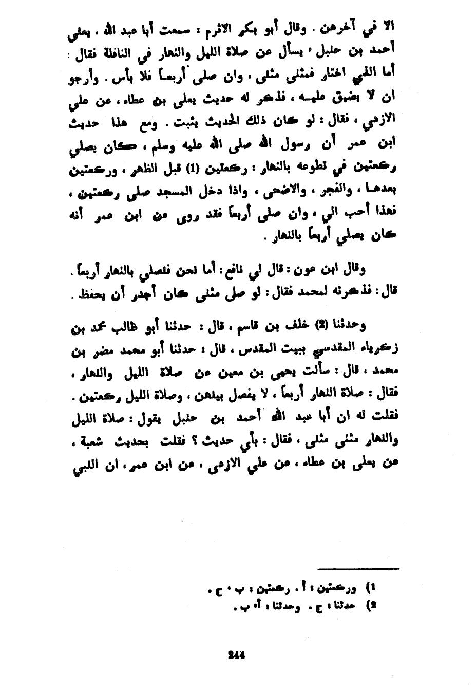 إِلَّا فِي آخِرِهِنَّ وَقَالَ أَبُو بَكْرٍ الْأَثْرَمُ سَمِعْتُ أَبَا عَبْدِ اللَّهِ يَعْنِي أَحْمَدَ بْنَ حَنْبَلٍ يَسْأَلُ عَنْ صَلَاةِ اللَّيْلِ وَالنَّهَارِ فِي النَّافِلَةِ فَقَالَ أَمَّا الَّذِي أَخْتَارُ فَمَثْنَى مَثْنَى وَإِنْ صَلَّى أَرْبَعًا فَلَا بَأْسَ وَأَرْجُو أَنْ لَا يُضَيَّقَ عَلَيْهِ فَذَكَرَ لَهُ حَدِيثَ يَعْلَى بْنِ عَطَاءٍ عَنْ عَلِيٍّ الْأَزْدِيِّ فَقَالَ لَوْ كَانَ ذَلِكَ الْحَدِيثُ يَثْبُتُ وَمَعَ هَذَا حَدِيثِ ابْنِ عُمَرَ أَنَّ رَسُولَ اللَّهِ صَلَّى اللَّهُ عَلَيْهِ وَسَلَّمَ كَانَ يُصَلِّي رَكْعَتَيْنِ فِي تَطَوُّعِهِ بِالنَّهَارِ رَكْعَتَيْنِ قَبْلَ الظُّهْرِ وَرَكْعَتَيْنِ بَعْدَهَا وَالْفَجْرِ وَالْأَضْحَى وَإِذَا دَخَلَ الْمَسْجِدَ صَلَّى رَكْعَتَيْنِ فَهَذَا أَحَبُّ إِلَيَّ وَإِنْ صَلَّى أَرْبَعًا فَقَدْ رُوِيَ عَنِ ابْنِ عُمَرَ أَنَّهُ كَانَ يُصَلِّي أَرْبَعًا بِالنَّهَارِ وَقَالَ ابْنُ عَوْنٍ قَالَ لِي نَافِعٌ أَمَّا نَحْنُ فَنُصَلِّي بِالنَّهَارِ أَرْبَعًا قَالَ فَذَكَرْتُهُ لِمُحَمَّدٍ فَقَالَ لَوْ صَلَّى مَثْنَى كَانَ أَجْدَرُ أَنْ يُحْفَظَ وَحَدَّثَنَا خَلَفُ بْنُ قَاسِمٍ قَالَ حَدَّثَنَا أَبُو طَالِبٍ مُحَمَّدُ بْنُ زَكَرِيَّاءَ الْمَقْدِسِيُّ بِبَيْتِ الْمَقْدِسِ قَالَ حَدَّثَنَا أَبُو مُحَمَّدٍ مُضَرُ بْنُ مُحَمَّدٍ قَالَ سَأَلْتُ يَحْيَى بْنَ مَعِينٍ عَنْ صَلَاةِ اللَّيْلِ وَالنَّهَارِ فَقَالَ صَلَاةُ النَّهَارِ أَرْبَعًا لَا يُفْصَلُ بَيْنَهُنَّ وَصَلَاةُ اللَّيْلِ رَكْعَتَيْنِ فَقُلْتُ لَهُ إِنَّ أَبَا عَبْدِ اللَّهِ أَحْمَدَ بْنَ حَنْبَلٍ يَقُولُ صَلَاةُ اللَّيْلِ وَالنَّهَارِ مَثْنَى مَثْنَى فَقَالَ بِأَيِّ حَدِيثٍ فَقُلْتُ بِحَدِيثِ شُعْبَةَ عَنْ يَعْلَى بْنِ عَطَاءٍ عَنْ عَلِيٍّ الْأَزْدِيِّ عَنِ ابْنِ عُمَرَ أَنَّ النَّبِيَّ