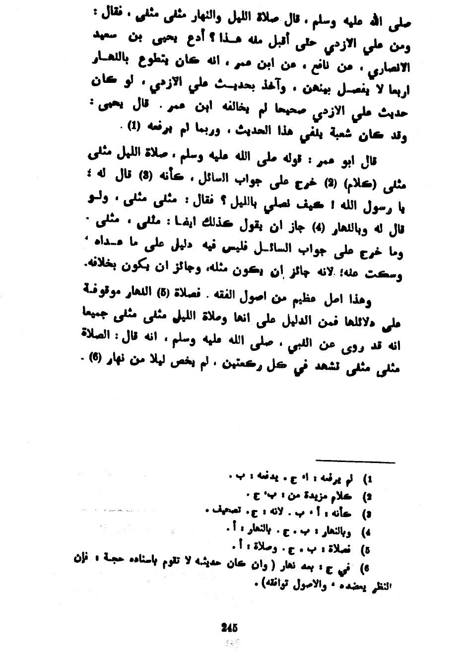 صَلَّى اللَّهُ عَلَيْهِ وَسَلَّمَ قَالَ صَلَاةُ اللَّيْلِ وَالنَّهَارِ مَثْنَى مَثْنَى فَقَالَ وَمَنْ عَلِيٌّ الْأَزْدِيُّ حَتَّى أَقْبَلَ مِنْهُ هَذَا أَدَعُ يَحْيَى بْنَ سعيد الأنصاري عَنْ نَافِعٍ عَنِ ابْنِ عُمَرَ أَنَّهُ كَانَ يَتَطَوَّعُ بِالنَّهَارِ أَرْبَعًا لَا يَفْصِلُ بَيْنَهُنَّ وَآخُذُ بِحَدِيثِ عَلِيٍّ الْأَزْدِيِّ لَوْ كَانَ حَدِيثُ عَلِيٍّ الْأَزْدِيُّ صَحِيحًا لَمْ يُخَالِفْهُ ابْنُ عُمَرَ قَالَ يَحْيَى وَقَدْ كَانَ شُعْبَةُ يَنْفِي هَذَا الْحَدِيثَ وَرُبَّمَا لَمْ يَرْفَعْهُ قَالَ أَبُو عُمَرَ قَوْلُهُ صَلَّى اللَّهُ عَلَيْهِ وَسَلَّمَ صَلَاةُ اللَّيْلِ مَثْنَى مَثْنَى (كَلَامٌ) خَرَجَ عَلَى جَوَابِ السَّائِلِ كَأَنَّهُ قَالَ لَهُ يَا رَسُولَ اللَّهِ كَيْفَ نُصَلِّي بِاللَّيْلِ فَقَالَ مَثْنَى مَثْنَى وَلَوْ قَالَ لَهُ وَبِالنَّهَارِ جَازَ أَنْ يَقُولَ كَذَلِكَ أَيْضًا مَثْنَى مَثْنَى وَمَا خَرَجَ عَلَى جَوَابِ السَّائِلِ فَلَيْسَ فِيهِ دَلِيلٌ عَلَى مَا عَدَاهُ وَسَكَتَ عَنْهُ لِأَنَّهُ جَائِزٌ أَنْ يَكُونَ مِثْلَهُ وَجَائِزٌ أَنْ يَكُونَ بِخِلَافِهِ وَهَذَا أَصْلٌ عَظِيمٌ مِنْ أُصُولِ الْفِقْهِ فَصَلَاةُ النَّهَارِ مَوْقُوفَةٌ عَلَى دَلَائِلِهَا فَمِنَ الدَّلِيلِ عَلَى أَنَّهَا وَصَلَاةَ اللَّيْلِ مَثْنَى مَثْنَى جَمِيعًا أَنَّهُ قَدْ رُوِيَ عَنِ النَّبِيِّ صَلَّى اللَّهُ عَلَيْهِ وَسَلَّمَ أَنَّهُ قَالَ الصَّلَاةُ مَثْنَى مَثْنَى تَشَهُّدٌ فِي كُلِّ رَكْعَتَيْنِ لَمْ يَخُصَّ لَيْلًا مِنْ نَهَارٍ