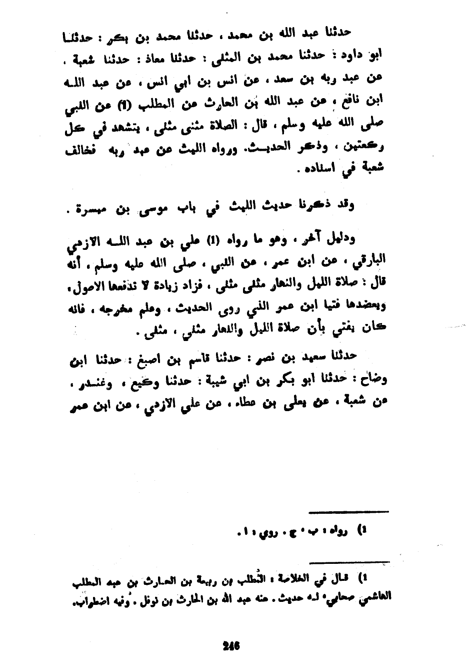 حَدَّثَنَا عَبْدُ اللَّهِ بْنُ مُحَمَّدٍ حَدَّثَنَا مُحَمَّدُ بْنُ بَكْرٍ حَدَّثَنَا أَبُو دَاوُدَ حَدَّثَنَا مُحَمَّدُ بْنُ الْمُثَنَّى حَدَّثَنَا مُعَاذٌ حَدَّثَنَا شُعْبَةُ عَنْ عَبْدِ رَبِّهِ بْنِ سَعْدٍ عَنْ أَنَسِ بْنِ أبي أنس عن عبد الله بن نافع عَنْ عَبْدِ اللَّهِ بْنِ الْحَارِثِ عَنِ الْمُطَّلِبِ عَنِ النَّبِيِّ صَلَّى اللَّهُ عَلَيْهِ وَسَلَّمَ قَالَ الصَّلَاةُ مَثْنَى مَثْنَى يُتَشَهَّدُ فِي كُلِّ رَكْعَتَيْنِ وَذَكَرَ الْحَدِيثَ وَرَوَاهُ اللَّيْثُ عَنْ عَبْدِ رَبِّهِ فَخَالَفَ شُعْبَةَ فِي إِسْنَادِهِ وَقَدْ ذَكَرْنَا حَدِيثَ اللَّيْثِ فِي بَابِ مُوسَى بْنِ مَيْسَرَةَ وَدَلِيلٌ آخَرُ وَهُوَ مَا رَوَاهُ عَلِيُّ بْنُ عَبْدِ اللَّهِ الْأَزْدِيُّ الْبَارِقِيُّ عَنِ ابْنِ عُمَرَ عَنِ النَّبِيِّ صَلَّى اللَّهُ عَلَيْهِ وَسَلَّمَ أَنَّهُ قَالَ صَلَاةُ اللَّيْلِ وَالنَّهَارِ مَثْنَى مَثْنَى فَزَادَ زِيَادَةً لَا تَدْفَعُهَا الْأُصُولُ وَيُعَضِّدُهَا فُتْيَا ابْنِ عُمَرَ الَّذِي رَوَى الْحَدِيثَ وَعَلِمَ مَخْرَجَهُ فَإِنَّهُ كَانَ يُفْتِي بِأَنَّ صَلَاةَ اللَّيْلِ وَالنَّهَارِ مَثْنَى مَثْنَى حَدَّثَنَا سَعِيدُ بْنُ نَصْرٍ حَدَّثَنَا قَاسِمُ بْنُ أَصْبَغَ حَدَّثَنَا ابْنُ وَضَّاحٍ حَدَّثَنَا أَبُو بَكْرِ بْنُ أَبِي شَيْبَةَ حَدَّثَنَا وَكِيعٌ وَغُنْدَرٌ عَنْ شُعْبَةَ عَنْ يَعْلَى بْنِ عَطَاءٍ عَنْ علي الْأَزْدِيِّ عَنِ ابْنِ عُمَرَ
