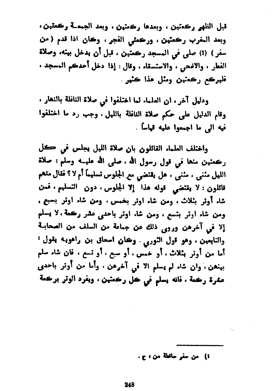 قَبْلَ الظُّهْرِ رَكْعَتَيْنِ وَبَعْدَهَا رَكْعَتَيْنِ وَبَعْدَ الْجُمُعَةِ رَكْعَتَيْنِ وَبَعْدَ الْمَغْرِبِ رَكْعَتَيْنِ وَرَكْعَتِي الْفَجْرِ وَكَانَ إِذَا قَدِمَ (مِنْ سَفَرٍ) صَلَّى فِي الْمَسْجِدِ رَكْعَتَيْنِ قَبْلَ أَنْ يَدْخُلَ بَيْتَهُ وَصَلَاةُ الْفِطَرِ وَالْأَضْحَى وَالِاسْتِسْقَاءِ وَقَالَ إِذَا دَخَلَ أَحَدُكُمُ الْمَسْجِدَ فَلْيَرْكَعْ رَكْعَتَيْنِ وَمِثْلُ هَذَا كَثِيرٌ وَدَلِيلٌ آخَرُ أَنَّ الْعُلَمَاءَ لَمَّا اخْتَلَفُوا فِي صَلَاةِ النَّافِلَةِ بِالنَّهَارِ وَقَامَ الدَّلِيلُ عَلَى حُكْمِ صَلَاةِ النَّافِلَةِ بِاللَّيْلِ وَجَبَ رَدُّ مَا اخْتَلَفُوا فِيهِ إِلَى مَا أَجْمَعُوا عَلَيْهِ قِيَاسًا وَاخْتَلَفَ الْعُلَمَاءُ الْقَائِلُونَ بِأَنَّ صَلَاةَ اللَّيْلِ يُجْلَسُ فِي كُلِّ رَكْعَتَيْنِ مِنْهَا فِي قَوْلِ رَسُولِ اللَّهِ صَلَّى اللَّهُ عَلَيْهِ وَسَلَّمَ صَلَاةُ اللَّيْلِ مَثْنَى مَثْنَى هَلْ يَقْتَضِي مَعَ الْجُلُوسِ تَسْلِيمًا أَمْ لَا فَقَالَ مِنْهُمْ قَائِلُونَ لَا يَقْتَضِي قَوْلُهُ هَذَا إِلَّا الْجُلُوسُ دُونَ التَّسْلِيمِ فَمَنْ شَاءَ أَوْتَرَ بِثَلَاثٍ وَمَنْ شَاءَ أَوْتَرَ بِخَمْسٍ وَمَنْ شَاءَ أَوْتَرَ بِسَبْعٍ وَمَنْ شَاءَ أَوْتَرَ بِتِسْعٍ وَمَنْ شَاءَ أَوْتَرَ بِإِحْدَى عَشَرَ رَكْعَةً لَا يُسَلِّمُ إِلَّا فِي آخِرِهِنَّ وَرُوِيَ ذَلِكَ عَنْ جَمَاعَةٍ مِنَ السَّلَفِ مِنَ الصَّحَابَةِ وَالتَّابِعِينَ وَهُوَ قَوْلُ الثَّوْرِيِّ وكان إسحاق بن راهويه يقول أما من أوتر بثلاث أَوْ خَمَّسَ أَوْ سَبَّعَ أَوْ تَسَّعَ فَإِنْ شَاءَ سَلَّمَ بَيْنَهُنَّ وَإِنْ شَاءَ لَمْ يُسَلِّمْ إِلَّا فِي آخِرِهِنَّ وَأَمَّا مَنْ أَوْتَرَ بِإِحْدَى عَشْرَةَ رَكْعَةً فَإِنَّهُ يُسَلِّمُ فِي كُلِّ رَكْعَتَيْنِ وَيُفْرِدُ الْوِتْرَ بِرَكْعَةٍ