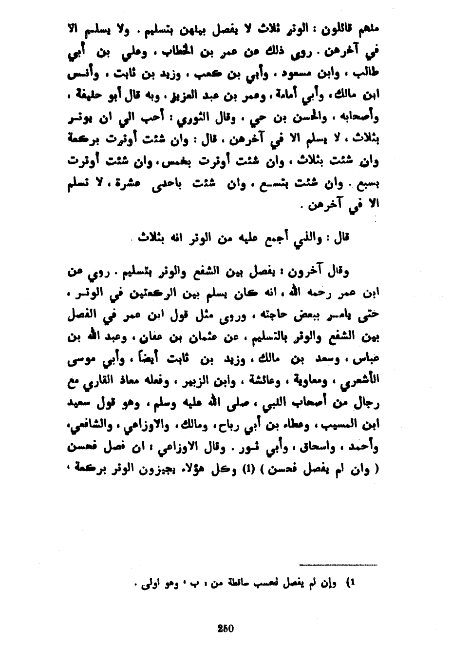مِنْهُمْ قَائِلُونَ الْوِتْرُ ثَلَاثٌ لَا يَفْصِلُ بَيْنَهُنَّ تَسْلِيمٌ وَلَا يُسَلَّمُ إِلَّا فِي آخِرِهِنَّ رُوِيَ ذَلِكَ عَنْ عُمَرَ بْنِ الْخَطَّابِ وَعَلِيِّ بْنِ أَبِي طَالِبٍ وَابْنِ مَسْعُودٍ وَأُبَيِّ بْنِ كَعْبٍ وَزَيْدِ بْنِ ثَابِتٍ وَأَنَسِ بْنِ مَالِكٍ وَأَبِي أُمَامَةَ وَعُمَرَ بْنِ عَبْدِ الْعَزِيزِ وَبِهِ قَالَ أَبُو حَنِيفَةَ وَأَصْحَابُهُ وَالْحَسَنُ بْنُ حَيٍّ وَقَالَ الثوري أحب إلي أن يوتر بثلاث لَا يُسَلِّمُ إِلَّا فِي آخِرِهِنَّ قَالَ وَإِنْ شِئْتَ أَوْتَرْتَ بِرَكْعَةٍ وَإِنْ شِئْتَ بِثَلَاثٍ وَإِنْ شِئْتَ أَوْتَرْتَ بِخَمْسٍ وَإِنْ شِئْتَ أَوْتَرْتَ بِسَبْعٍ وَإِنْ شِئْتَ بِتِسْعٍ وَإِنْ شِئْتَ بِإِحْدَى عَشْرَةَ لَا تُسَلِّمُ إِلَّا فِي آخِرِهِنَّ قَالَ وَالَّذِي أَجْمَعَ عَلَيْهِ مِنَ الْوِتْرِ أَنَّهُ بِثَلَاثٍ وَقَالَ آخَرُونَ يُفْصَلُ بَيْنَ الشَّفْعِ وَالْوَتْرِ بِتَسْلِيمٍ رُوِيَ عَنِ ابْنِ عُمَرَ رَحِمَهُ اللَّهُ أَنَّهُ كَانَ يُسَلِّمُ بَيْنَ الرَّكْعَتَيْنِ فِي الْوِتْرِ حَتَّى يَأْمُرَ بِبَعْضِ حَاجَتِهِ وَرُوِيَ مِثْلُ قَوْلِ ابْنِ عُمَرَ فِي الْفَصْلِ بَيْنَ الشَّفْعِ وَالْوِتْرِ بِالتَّسْلِيمِ عَنْ عُثْمَانَ بْنِ عَفَّانَ وَعَبْدِ اللَّهِ بْنِ عَبَّاسٍ وَسَعْدِ بْنِ مَالِكٍ وَزَيْدِ بْنِ ثَابِتٍ أَيْضًا وَأَبِي مُوسَى الْأَشْعَرِيِّ وَمُعَاوِيَةَ وَعَائِشَةَ وَابْنِ الزُّبَيْرِ وَفَعَلَهُ مُعَاذٌ الْقَارِي مَعَ رِجَالٍ مِنْ أَصْحَابِ النَّبِيِّ صَلَّى اللَّهُ عَلَيْهِ وَسَلَّمَ وَهُوَ قَوْلُ سَعِيدِ بْنِ الْمُسَيَّبِ وَعَطَاءِ بْنِ أَبِي رَبَاحٍ وَمَالِكٍ وَالْأَوْزَاعِيِّ وَالشَّافِعِيِّ وَأَحْمَدَ وَإِسْحَاقَ وَأَبِي ثَوْرٍ وَقَالَ الْأَوْزَاعِيُّ إِنْ فَصَلَ فَحَسَنٌ (وَإِنْ لَمْ يَفْصِلْ فَحَسَنٌ) وَكُلُّ هَؤُلَاءِ يُجِيزُونَ الْوِتْرَ بِرَكْعَةٍ