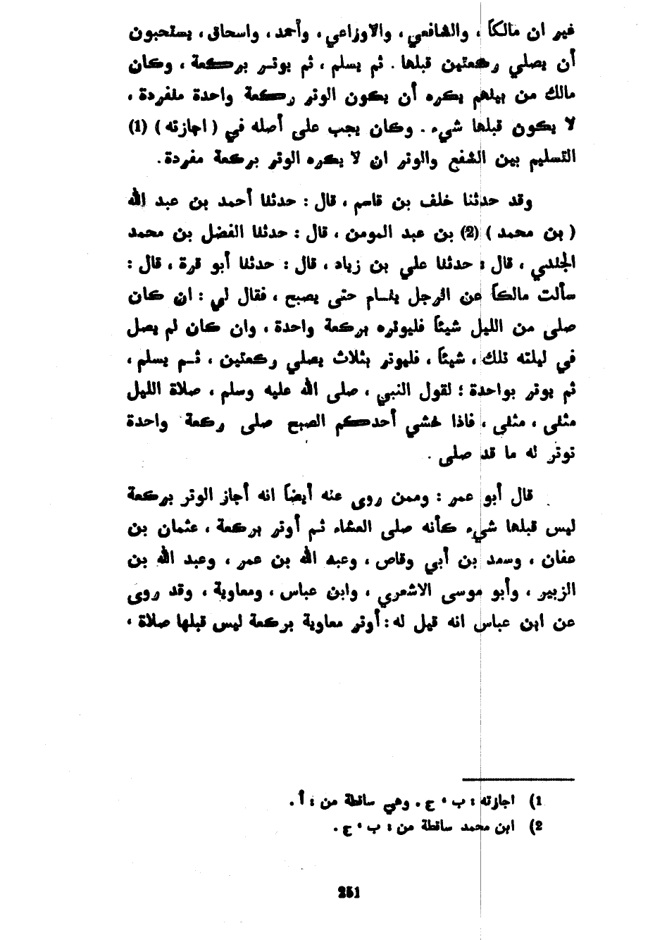 غَيْرَ أَنَّ مَالِكًا وَالشَّافِعِيَّ وَالْأَوْزَاعِيَّ وَأَحْمَدَ وَإِسْحَاقَ يَسْتَحِبُّونَ أَنْ يُصَلِّيَ رَكْعَتَيْنِ قَبْلَهَا ثُمَّ يُسَلِّمُ ثُمَّ يُوتِرُ بِرَكْعَةٍ وَكَانَ مَالِكٌ مِنْ بَيْنِهِمْ يَكْرَهُ أَنْ يَكُونَ الْوِتْرُ رَكْعَةً وَاحِدَةً مُنْفَرِدَةً لَا يَكُونُ قَبْلَهَا شَيْءٌ وَكَانَ يَجِبُ عَلَى أَصْلِهِ فِي (إِجَازَتِهِ) التَّسْلِيمُ بَيْنَ الشَّفْعِ وَالْوَتْرِ أَنْ لَا يَكْرَهَ الْوِتْرَ بِرَكْعَةٍ مُفْرَدَةٍ وَقَدْ حَدَّثَنَا خَلَفُ بْنُ قَاسِمٍ قَالَ حَدَّثَنَا أَحْمَدُ بْنُ عَبْدِ اللَّهِ (بْنِ مُحَمَّدِ) بْنِ عَبْدِ الْمُؤْمِنِ قَالَ حَدَّثَنَا الْفَضْلُ بْنُ مُحَمَّدٍ الْجُنْدِيُّ قَالَ حَدَّثَنَا عَلِيُّ بْنُ زِيَادٍ قَالَ حَدَّثَنَا أَبُو قُرَّةَ قَالَ سَأَلْتُ مَالِكًا عَنِ الرَّجُلِ يَنَامُ حَتَّى يُصْبِحَ فَقَالَ لِي إِنْ كَانَ صَلَّى مِنَ اللَّيْلِ شَيْئًا فَلْيُوتِرْهُ بِرَكْعَةٍ وَاحِدَةٍ وَإِنْ كَانَ لَمْ يُصَلِّ فِي لَيْلَتِهِ تِلْكَ شيئا فليوتر بثلاث يُصَلِّي رَكْعَتَيْنِ ثُمَّ يُسَلِّمُ ثُمَّ يُوتِرُ بِوَاحِدَةٍ لِقَوْلِ النَّبِيِّ صَلَّى اللَّهُ عَلَيْهِ وَسَلَّمَ صَلَاةُ اللَّيْلِ مَثْنَى مَثْنَى فَإِذَا خَشِيَ أَحَدُكُمُ الصُّبْحَ صَلَّى رَكْعَةً وَاحِدَةً تُوتِرُ لَهُ مَا قَدْ صَلَّى قَالَ أَبُو عُمَرَ وَمِمَّنْ رَوِيَ عَنْهُ أَيْضًا أَنَّهُ أَجَازَ الْوِتْرَ بِرَكْعَةٍ لَيْسَ قَبْلَهَا شَيْءٌ كَأَنَّهُ صَلَّى الْعِشَاءَ ثُمَّ أَوْتَرَ بِرَكْعَةٍ عُثْمَانُ بْنُ عَفَّانَ وَسَعْدُ بْنُ أَبِي وَقَّاصٍ وَعَبْدُ اللَّهِ بْنُ عُمَرَ وَعَبْدُ اللَّهِ بْنُ الزُّبَيْرِ وَأَبُو مُوسَى الْأَشْعَرِيُّ وَابْنُ عَبَّاسٍ وَمُعَاوِيَةُ وَقَدْ رُوِيَ عَنِ ابْنِ عَبَّاسٍ أَنَّهُ قِيلَ لَهُ أَوْتَرَ مُعَاوِيَةُ بِرَكْعَةٍ لَيْسَ قَبْلَهَا صَلَاةٌ