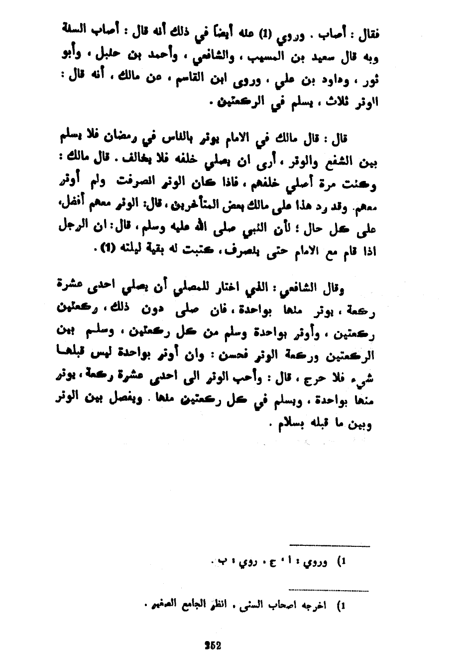 فَقَالَ أَصَابَ وَرُوِيَ عَنْهُ أَيْضًا فِي ذَلِكَ أَنَّهُ قَالَ أَصَابَ السُّنَّةَ وَبِهِ قَالَ سَعِيدُ بْنِ الْمُسَيَّبِ وَالشَّافِعِيُّ وَأَحْمَدُ بْنُ حَنْبَلٍ وَأَبُو ثَوْرٍ وَدَاوُدُ بْنُ عَلِيٍّ وَرَوَى ابْنُ الْقَاسِمِ عَنْ مَالِكٍ أَنَّهُ قَالَ الْوِتْرُ ثَلَاثٌ يُسَلِّمُ فِي الرَّكْعَتَيْنِ قَالَ قَالَ مَالِكٌ فِي الْإِمَامِ يُوتِرُ بِالنَّاسِ فِي رَمَضَانَ فَلَا يُسَلِّمُ بَيْنَ الشَّفْعِ وَالْوِتْرِ أَرَى أَنْ يُصَلَّى خَلْفَهُ فَلَا يُخَالِفُ قَالَ مَالِكٌ وَكُنْتُ مَرَّةً أُصَلِّي خَلْفَهُمْ فَإِذَا كَانَ الْوِتْرُ انْصَرَفْتُ وَلَمْ أُوتِرْ مَعَهُمْ وَقَدْ رَدَّ هَذَا عَلَى مَالِكٍ بَعْضُ الْمُتَأَخِّرِينَ قَالَ الْوِتْرُ مَعَهُمْ أَفْضَلُ عَلَى كُلِّ حَالٍ لِأَنَّ النَّبِيَّ صَلَّى اللَّهُ عَلَيْهِ وَسَلَّمَ قَالَ إِنَّ الرَّجُلَ إِذَا قَامَ مَعَ الْإِمَامِ حَتَّى يَنْصَرِفَ كُتِبَتْ لَهُ بَقِيَّةُ لَيْلَتِهِ وَقَالَ الشَّافِعِيُّ الَّذِي أَخْتَارُ لِلْمُصَلِّي أَنْ يُصَلِّيَ إِحْدَى عَشْرَةَ رَكْعَةً يُوتِرُ مِنْهَا بِوَاحِدَةٍ فَإِنْ صَلَّى دُونَ ذَلِكَ رَكْعَتَيْنِ رَكْعَتَيْنِ وَأَوْتَرَ بِوَاحِدَةٍ وَسَلَّمَ مِنْ كُلِّ رَكْعَتَيْنِ وَسَلَّمَ بَيْنَ الرَّكْعَتَيْنِ وَرَكْعَةِ الْوِتْرِ فَحَسَنٌ وَإِنْ أَوْتَرَ بِوَاحِدَةٍ لَيْسَ قَبْلَهَا شَيْءٌ فَلَا حَرَجَ قَالَ وَأَحَبُّ الْوِتْرِ إِلَيَّ إِحْدَى عَشْرَةَ رَكْعَةً يُوتِرُ مِنْهَا بِوَاحِدَةٍ وَيُسَلِّمُ فِي كُلِّ رَكْعَتَيْنِ مِنْهَا وَيَفْصِلُ بَيْنَ الْوِتْرِ وَبَيْنَ مَا قَبْلَهُ بِسَلَامٍ