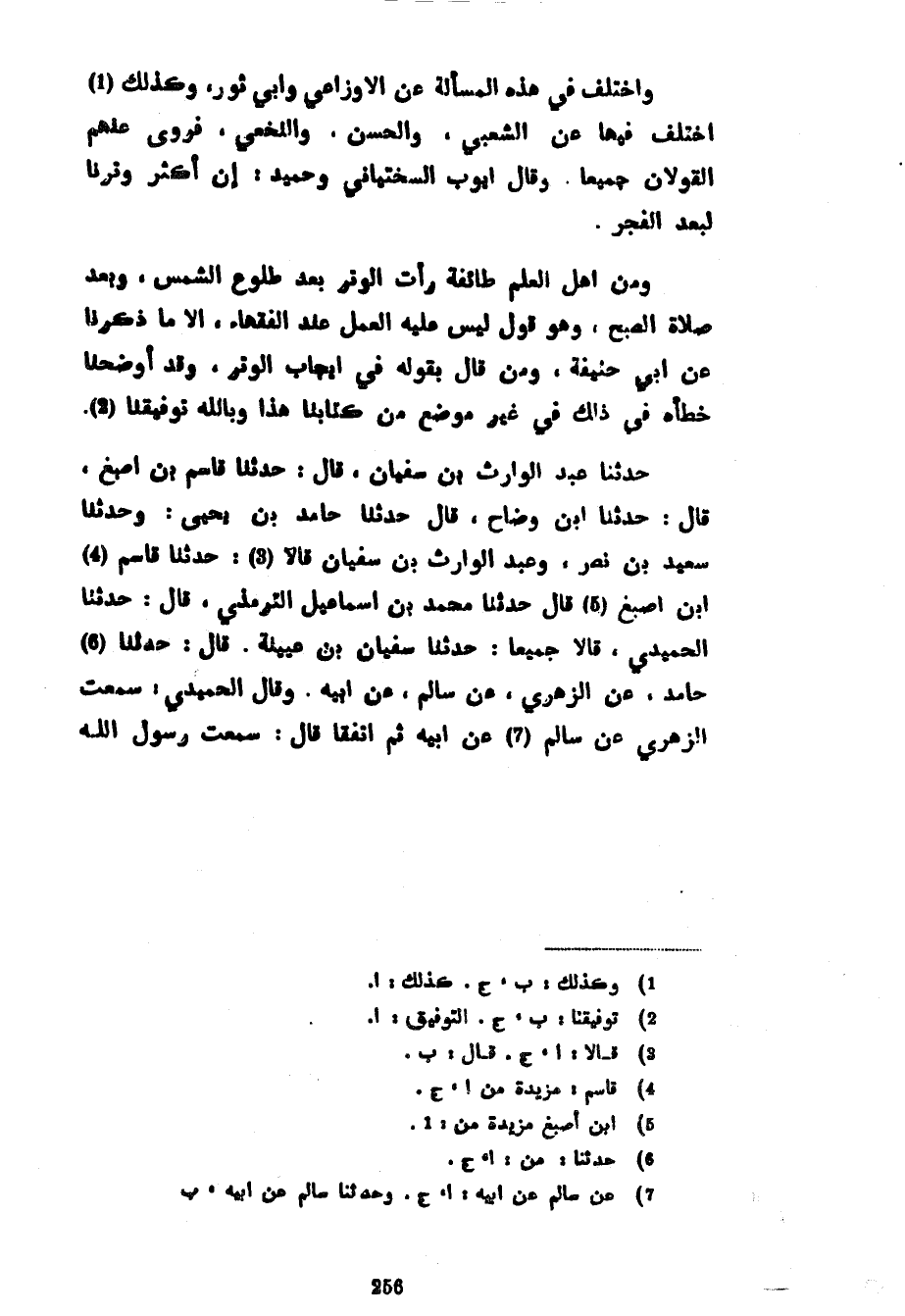 وَاخْتُلِفَ فِي هَذِهِ الْمَسْأَلَةِ عَنِ الْأَوْزَاعِيِّ وَأَبِي ثَوْرٍ وَكَذَلِكَ اخْتُلِفَ فِيهَا عَنِ الشَّعْبِيِّ وَالْحَسَنِ وَالنَّخَعِيِّ فَرُوِيَ عَنْهُمُ الْقَوْلَانِ جَمِيعًا وَقَالَ أَيُّوبُ السَّخْتِيَانِيُّ وَحُمَيْدٌ إِنَّ أَكْثَرَ وَتْرِنَا لِبُعْدِ الْفَجْرِ وَمِنْ أَهْلِ الْعِلْمِ طَائِفَةٌ رَأَتِ الْوِتْرَ بَعْدَ طُلُوعِ الشَّمْسِ وَبَعْدَ صَلَاةِ الصُّبْحِ وَهُوَ قَوْلٌ لَيْسَ عَلَيْهِ الْعَمَلُ عِنْدَ الْفُقَهَاءِ إِلَّا مَا ذَكَرْنَا عَنْ أَبِي حَنِيفَةَ وَمَنْ قَالَ بِقَوْلِهِ فِي إِيجَابِ الْوِتْرِ وَقَدْ أَوْضَحْنَا خَطَأَهُ فِي ذَلِكَ فِي غَيْرِ مَوْضِعٍ مِنْ كِتَابِنَا هَذَا وَبِاللَّهِ تَوْفِيقُنَا حَدَّثَنَا عَبْدُ الْوَارِثِ بْنُ سُفْيَانَ قَالَ حَدَّثَنَا قَاسِمُ بْنُ أَصْبَغَ قَالَ حَدَّثَنَا ابْنُ وَضَّاحٍ قَالَ حَدَّثَنَا حَامِدُ بْنُ يَحْيَى وَحَدَّثَنَا سَعِيدُ بْنُ نَصْرٍ وَعَبْدُ الْوَارِثِ بْنُ سُفْيَانَ قَالَا حَدَّثَنَا قَاسِمُ بْنُ أَصْبَغَ قَالَ حَدَّثَنَا مُحَمَّدُ بْنُ إِسْمَاعِيلَ التِّرْمِذِيُّ قَالَ حَدَّثَنَا الْحُمَيْدِيُّ قَالَا جَمِيعًا حَدَّثَنَا سُفْيَانُ بْنُ عُيَيْنَةَ قَالَ حَدَّثَنَا حَامِدٌ عَنِ الزُّهْرِيِّ عَنْ سَالِمٍ عن أبيه وقال الحميدي سمعت الزهري عن سالم عن أبيه ثم اتفقا قَالَ سَمِعْتُ رَسُولَ اللَّهِ