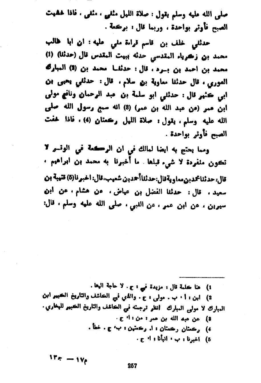 صلى الله عليه وسلم يقول اللَّيْلِ مَثْنَى مَثْنَى فَإِذَا خَشِيتَ الصُّبْحَ فَأَوْتِرْ بِوَاحِدَةٍ وَرُبَّمَا قَالَ بِرَكْعَةٍ حَدَّثَنِي خَلَفُ بْنُ قَاسِمٍ قِرَاءَةً مِنِّي عَلَيْهِ أَنَّ أَبَا طَالِبٍ مُحَمَّدَ بْنَ زَكَرِيَّاءَ الْمَقْدِسِيَّ حَدَّثَهُ بِبَيْتِ الْمَقْدِسِ قَالَ (حَدَّثَنَا) مُحَمَّدُ بْنُ أَحْمَدَ بْنِ بُرْدٍ قَالَ حَدَّثَنَا مُحَمَّدُ بْنُ الْمُبَارَكِ الصُّورِيُّ قَالَ حَدَّثَنَا مُعَاوِيَةُ بْنُ سَلَامٍ قَالَ حَدَّثَنِي يَحْيَى بْنُ أَبِي كَثِيرٍ قَالَ حَدَّثَنِي أَبُو سَلَمَةَ بن عبد الرحمان وَنَافِعٌ مَوْلَى ابْنِ عُمَرَ (عَنْ عَبْدِ اللَّهِ بْنِ عُمَرَ) أَنَّهُ سَمِعَ رَسُولَ اللَّهِ صَلَّى اللَّهُ عَلَيْهِ وَسَلَّمَ يَقُولُ صَلَاةُ اللَّيْلِ رَكْعَتَانِ فَإِذَا خِفْتَ الصُّبْحَ فَأَوْتِرْ بِوَاحِدَةٍ وَمِمَّا يُحْتَجُّ به أيضا لمالك فِي أَنَّ الرَّكْعَةَ فِي الْوِتْرِ لَا تَكُونُ منفردة لا شي قَبْلَهَا مَا أَخْبَرَنَا بِهِ مُحَمَّدُ بْنُ إِبْرَاهِيمَ قَالَ حَدَّثَنَا مُحَمَّدُ بْنُ مُعَاوِيَةَ قَالَ حَدَّثَنَا أَحْمَدُ بْنُ شُعَيْبٍ قَالَ أَخْبَرَنَا قُتَيْبَةُ بْنُ سَعِيدٍ قَالَ حَدَّثَنَا الْفَضْلُ بْنُ عِيَاضٍ عَنْ هِشَامٍ عَنِ ابْنِ سِيرِينَ عَنِ ابْنِ عُمَرَ عَنِ النَّبِيِّ صَلَّى اللَّهُ عَلَيْهِ وَسَلَّمَ قَالَ