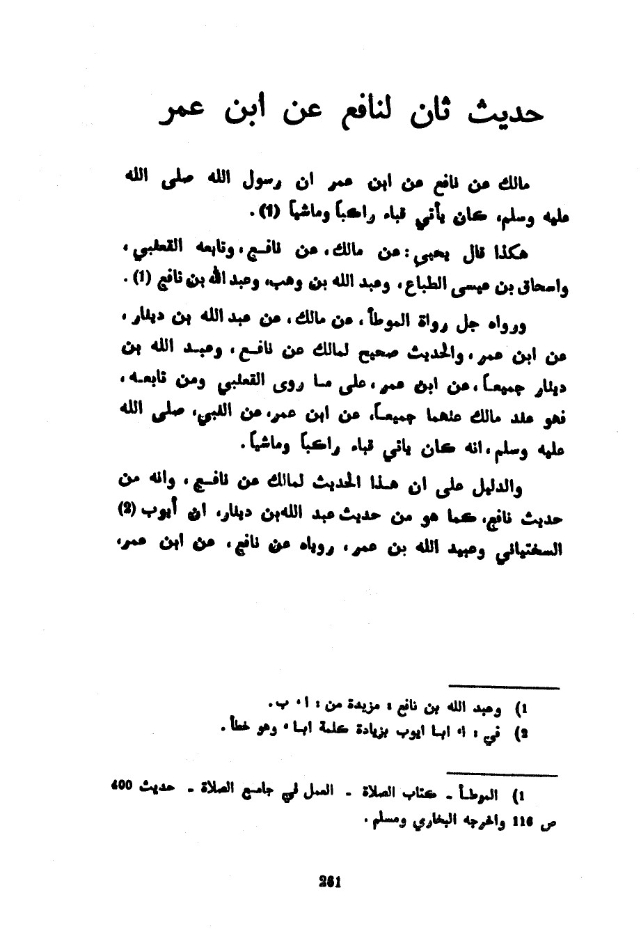 حَدِيثٌ ثَانٍ لِنَافِعٍ عَنِ ابْنِ عُمَرَ مَالِكٍ عَنْ نَافِعٍ عَنِ ابْنِ عُمَرَ أَنَّ رَسُولَ اللَّهِ صَلَّى اللَّهُ عَلَيْهِ وَسَلَّمَ كَانَ يَأْتِي قُبَاءً رَاكِبًا وَمَاشِيًا هَكَذَا قَالَ يَحْيَى عَنْ مَالِكٍ عَنْ نَافِعٍ وَتَابَعَهُ الْقَعْنَبِيُّ وَإِسْحَاقُ بْنُ عِيسَى الطِّبَاعُ وَعَبْدُ اللَّهِ بْنُ وَهْبٍ وَعَبْدُ اللَّهِ بْنُ نَافِعٍ وَرَوَاهُ جُلُّ رُوَاةِ الْمُوَطَّأِ عَنْ مَالِكٍ عَنْ عَبْدِ اللَّهِ بْنِ دِينَارٍ عَنِ ابْنِ عُمَرَ وَالْحَدِيثُ صَحِيحٌ لِمَالِكٍ عَنْ نَافِعٍ وَعَبْدِ اللَّهِ بْنِ دِينَارٍ جَمِيعًا عَنِ ابْنِ عُمَرَ عَلَى مَا رَوَى الْقَعْنَبِيُّ وَمَنْ تَابَعَهُ فَهُوَ عِنْدَ مَالِكٍ عَنْهُمَا جَمِيعًا عَنِ ابْنِ عُمَرَ عَنِ النَّبِيِّ صَلَّى اللَّهُ عليه وَسَلَّمَ أَنَّهُ كَانَ يَأْتِي قُبَاءً رَاكِبًا وَمَاشِيًا وَالدَّلِيلُ عَلَى أَنَّ هَذَا الْحَدِيثَ لِمَالِكٍ عَنْ نَافِعٍ وَأَنَّهُ مِنْ حَدِيثِ نَافِعٍ كَمَا هُوَ مِنْ حَدِيثِ عَبْدِ اللَّهِ بْنِ دِينَارٍ أَنَّ أَيُّوبَ السَّخْتِيَانِيَّ وَعُبَيْدَ اللَّهِ بْنَ عُمَرَ رَوَيَاهُ عَنْ نَافِعٍ عَنِ ابْنِ عُمَرَ