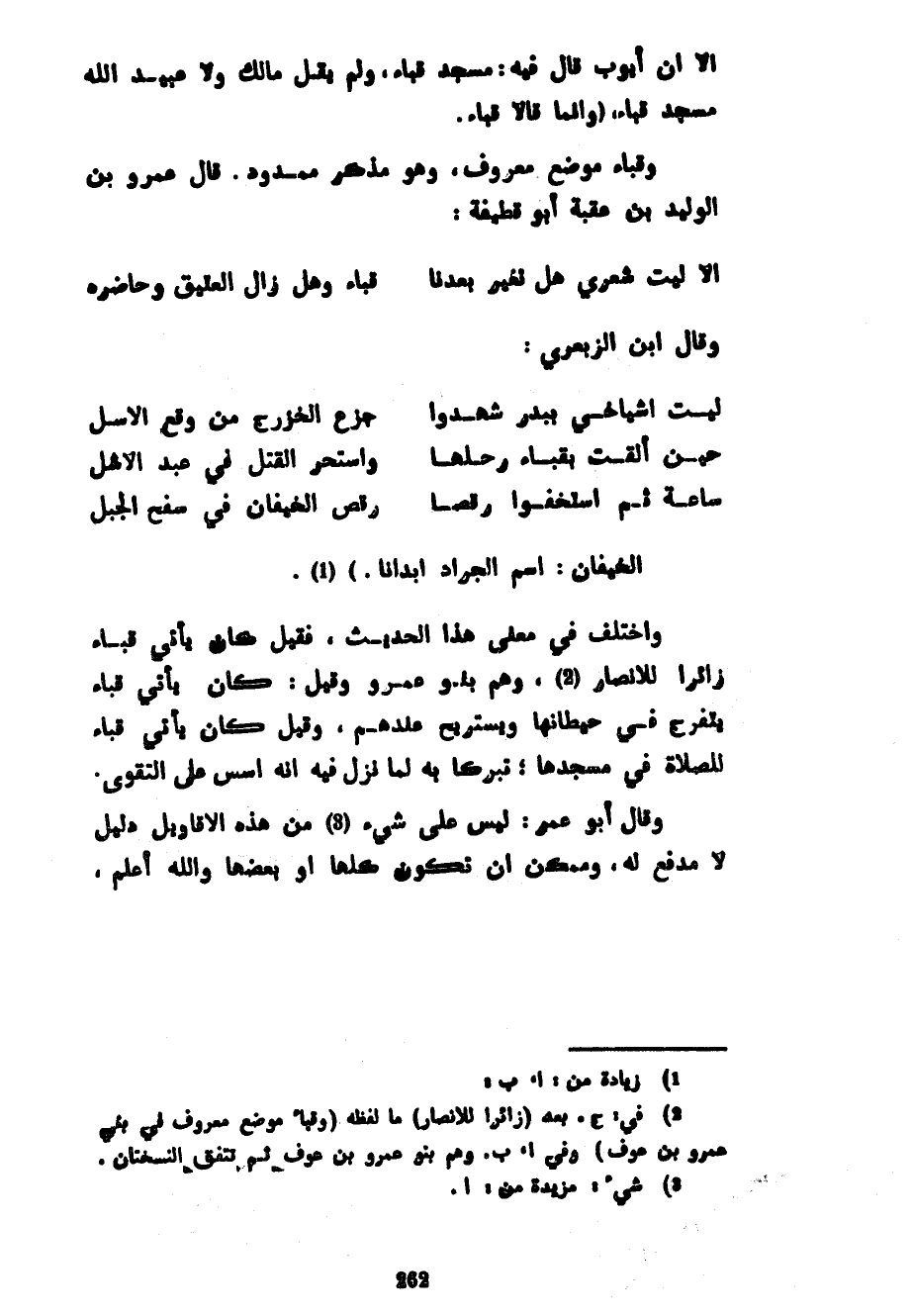 إِلَّا أَنَّ أَيُّوبَ قَالَ فِيهِ مَسْجِدَ قُبَاءٍ وَلَمْ يَقُلْ مَالِكٌ وَلَا عُبَيْدُ اللَّهِ مَسْجِدَ قُبَاءٍ (وَإِنَّمَا قَالَا قُبَاءً) وَقُبَاءٌ مَوْضِعٌ مَعْرُوفٌ وَهُوَ مُذَكَّرٌ مَمْدُودٌ قَالَ عَمْرُو بْنُ الْوَلِيدِ بن عقبةأبو قَطِيفَةَ ... أَلَا لَيْتَ شِعْرِي هَلْ تَغَيَّرَ بَعْدَنَا ... قُبَاءٌ وَهَلْ زَالَ الْعَتِيقُ وَحَاضِرُهُ ... وَقَالَ ابْنُ الزَّبْعَرِيِّ ... لَيْتَ أَشْيَاخِي بِبَدْرٍ شَهِدُوا ... جَزَعَ الْخَزْرَجِ مِنْ وَقْعِ الْأَسَلْ ... ... حِينَ أَلْقَتْ بِقُبَاءٍ رَحْلَهَا ... وَاسْتَحَرَّ الْقَتْلُ فِي عَبْدِ الْأَشَلْ ... ... سَاعَةً ثُمَّ اسْتَخَفُّوا رُقَّصًا ... رَقْصَ الْخِيفَانِ فِي سَفْحِ الْجَبَلْ ... الْخِيفَانُ اسْمُ الْجَرَادِ أَبْدَانًا) وَاخْتُلِفَ فِي مَعْنَى هَذَا الْحَدِيثِ فَقِيلَ كَانَ يَأْتِي قُبَاءً زَائِرًا لِلْأَنْصَارِ وَهُمْ بَنُو عَمْرٍو وَقِيلَ كَانَ يَأْتِي قُبَاءً يَتَفَرَّجُ فِي حِيطَانِهَا وَيَسْتَرِيحُ عِنْدَهُمْ وَقِيلَ كَانَ يَأْتِي قُبَاءً لِلصَّلَاةِ فِي مَسْجِدِهَا تَبَرُّكًا بِهِ لَمَّا نَزَلْ فِيهِ أَنَّهُ أُسِّسَ عَلَى التَّقْوَى وَقَالَ أَبُو عُمَرَ لَيْسَ عَلَى شَيْءٍ مِنْ هَذِهِ الْأَقَاوِيلِ دَلِيلٌ لَا مَدْفَعَ لَهُ وَمُمْكِنٌ أَنْ تَكُونَ كُلُّهَا أَوْ بَعْضُهَا وَاللَّهُ أعلم