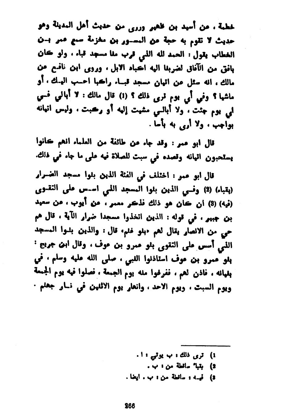 خَطْمَةَ عَنْ أُسَيْدِ بْنِ ظُهَيْرٍ وَرُوِيَ مِنْ حَدِيثِ أَهْلِ الْمَدِينَةِ وَهُوَ حَدِيثٌ لَا تَقُومُ به حجة عن المسور بن مخرمة سَمِعَ عُمَرَ بْنَ الْخَطَّابِ يَقُولُ الْحَمْدُ لِلَّهِ الَّذِي قَرَّبَ مِنَّا مَسْجِدَ قُبَاءٍ وَلَوْ كَانَ بِأُفُقٍ مِنَ الْآفَاقِ لَضَرَبْنَا إِلَيْهِ أَكْبَادَ الْإِبِلِ وَرَوَى ابْنُ نَافِعٍ عَنْ مَالِكٍ أَنَّهُ سُئِلَ عَنْ إِتْيَانِ مَسْجِدِ قُبَاءٍ رَاكِبًا أَحَبُّ إِلَيْكَ أَوْ مَاشِيًا وَفِي أَيِّ يَوْمٍ تَرَى ذَلِكَ قَالَ مَالِكٌ لَا أُبَالِي فِي أَيِّ يَوْمٍ جِئْتُ وَلَا أُبَالِي مَشَيْتُ إِلَيْهِ أَوْ رَكِبْتُ وَلَيْسَ إِتْيَانُهُ بِوَاجِبٍ وَلَا أَرَى بِهِ بَأْسًا قَالَ أَبُو عُمَرَ وَقَدْ جَاءَ عَنْ طَائِفَةٍ مِنَ الْعُلَمَاءِ أَنَّهُمْ كَانُوا يَسْتَحِبُّونَ إِتْيَانَهُ وَقَصْدَهُ فِي سَبْتٍ لِلصَّلَاةِ فِيهِ عَلَى مَا جَاءَ فِي ذَلِكَ قَالَ أَبُو عُمَرَ اخْتُلِفَ فِي الْفِئَةِ الَّذِينَ بَنَوْا مَسْجِدَ الضِّرَارِ (بِقُبَاءٍ) وَفِي الَّذِينَ بَنَوُا الْمَسْجِدَ الَّذِي أُسِّسَ عَلَى التَّقْوَى (فِيهِ) إِنْ كَانَ هُوَ ذَلِكَ فَذَكَرَ مَعْمَرٌ عَنْ أَيُّوبَ عَنْ سَعِيدِ بْنِ جُبَيْرٍ فِي قوله الذين اتَّخَذُوا مَسْجِدًا ضِرَارًا الْآيَةَ قَالَ هُمْ حَيٌّ مِنَ الْأَنْصَارِ يُقَالُ لَهُمْ بَنُو غَنْمٍ قَالَ وَالَّذِينَ بَنَوُا الْمَسْجِدَ الَّذِي أُسِّسَ عَلَى التَّقْوَى بَنُو عَمْرِو بْنِ عَوْفٍ وَقَالَ ابْنُ جُرَيْجٍ بَنُو عَمْرِو بْنِ عَوْفٍ اسْتَأْذَنُوا النَّبِيَّ صَلَّى اللَّهُ عَلَيْهِ وَسَلَّمَ فِي بُنْيَانِهِ فَأَذِنَ لَهُمْ فَفَرَغُوا مِنْهُ يَوْمَ الْجُمُعَةِ فَصَّلُوا فِيهِ يَوْمَ الْجُمُعَةِ وَيَوْمَ السَّبْتِ وَيَوْمَ الْأَحَدِ وَانْهَارَ يَوْمَ الِاثْنَيْنِ فِي نَارِ جَهَنَّمَ