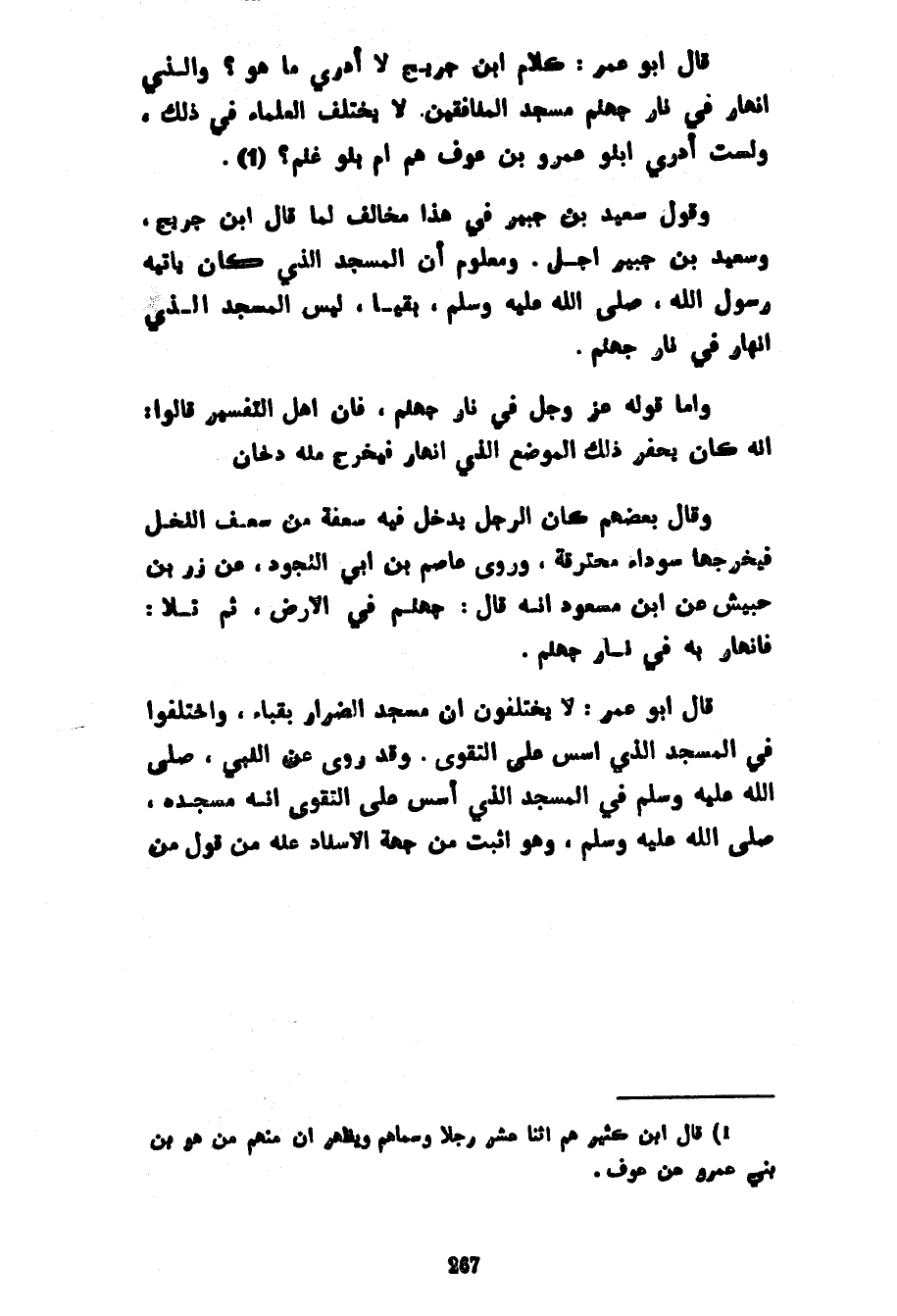 قَالَ أَبُو عُمَرَ كَلَامُ ابْنِ جُرَيْجٍ لَا أَدْرِي مَا هُوَ وَالَّذِي انْهَارَ فِي نَارِ جَهَنَّمَ مَسْجِدُ الْمُنَافِقِينَ لَا يَخْتَلِفُ الْعُلَمَاءُ فِي ذَلِكَ وَلَسْتُ أَدْرِي أَبَنُو عَمْرِو بْنِ عَوْفٍ هُمْ أَمْ بَنُو غَنْمٍ وَقَوْلُ سَعِيدِ بْنِ جُبَيْرٍ فِي هَذَا مُخَالِفٌ لِمَا قَالَ ابْنُ جُرَيْجٍ وَسَعِيدُ بْنِ جُبَيْرٍ أَجَلُّ وَمَعْلُومٌ أَنَّ الْمَسْجِدَ الَّذِي كَانَ يَأْتِيهِ رَسُولُ اللَّهِ صَلَّى اللَّهُ عَلَيْهِ وَسَلَّمَ بَقِيَا لَيْسَ الْمَسْجِدَ الَّذِي انْهَارَ فِي نَارِ جَهَنَّمَ وَأَمَّا قَوْلُهُ عَزَّ وَجَلَّ فِي نَارِ جَهَنَّمَ فَإِنَّ أَهْلَ التَّفْسِيرِ قَالُوا إِنَّهُ كَانَ يُحْفَرُ ذَلِكَ الْمَوْضِعُ الَّذِي انْهَارَ فَيَخْرُجُ مِنْهُ دُخَانٌ وَقَالَ بَعْضُهُمْ كَانَ الرَّجُلُ يُدْخِلُ فِيهِ سَعْفَةً مِنْ سَعَفِ النَّخْلِ فيخرجها سوداء محترقة وورى عَاصِمِ بْنِ أَبِي النَّجُودِ عَنْ زِرِّ بْنِ حُبَيْشٍ عَنِ ابْنِ مَسْعُودٍ أَنَّهُ قَالَ جَهَنَّمُ فِي الْأَرْضِ ثُمَّ تَلَا فَانْهَارَ بِهِ فِي نَارِ جَهَنَّمَ قَالَ أَبُو عُمَرَ لَا يَخْتَلِفُونَ أَنَّ مَسْجِدَ الضِّرَارِ بِقُبَاءٍ وَاخْتَلَفُوا فِي الْمَسْجِدِ الَّذِي أُسِّسَ عَلَى التَّقْوَى وَقَدْ رُوِيَ عَنِ النَّبِيِّ صَلَّى اللَّهُ عَلَيْهِ وَسَلَّمَ فِي الْمَسْجِدِ الَّذِي أُسِّسَ عَلَى التَّقَوِّي أَنَّهُ مَسْجِدُهُ صَلَّى اللَّهُ عَلَيْهِ وَسَلَّمَ وَهُوَ أَثْبَتُ مِنْ جِهَةِ الْإِسْنَادِ عَنْهُ مِنْ قَوْلِ مَنْ