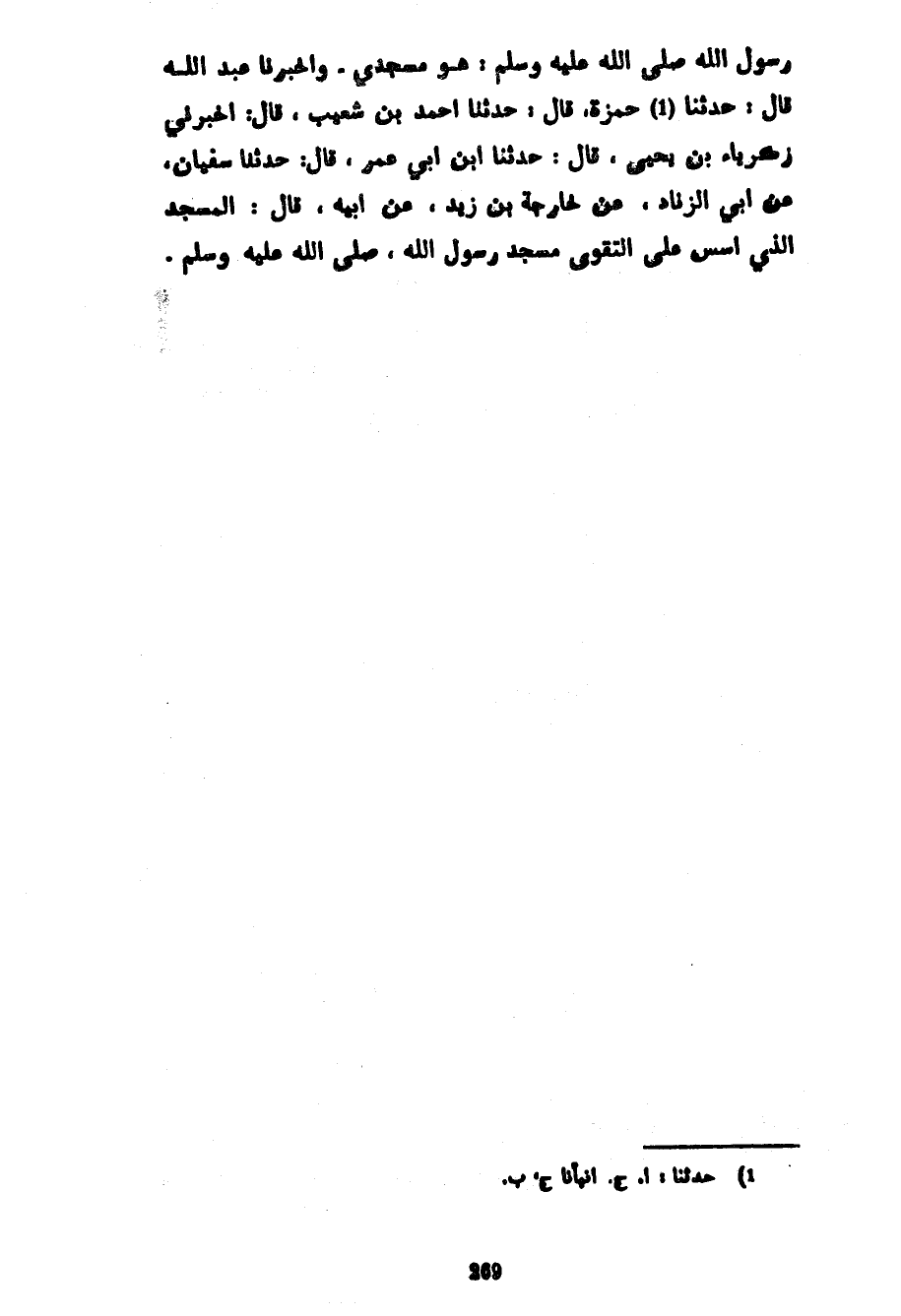 رَسُولُ اللَّهِ صَلَّى اللَّهُ عَلَيْهِ وَسَلَّمَ هُوَ مَسْجِدِي وَأَخْبَرَنَا عَبْدُ اللَّهِ قَالَ حَدَّثَنَا حَمْزَةُ قَالَ حَدَّثَنَا أَحْمَدُ بْنُ شُعَيْبٍ قَالَ أَخْبَرَنِي زَكَرِيَّاءُ بْنُ يَحْيَى قَالَ حَدَّثَنَا ابْنُ أَبِي عُمَرَ قَالَ حَدَّثَنَا سُفْيَانُ عَنْ أَبِي الزِّنَادِ عَنِ خَارِجَةَ بْنِ زَيْدٍ عَنْ أَبِيهِ قَالَ الْمَسْجِدُ الَّذِي أُسِّسَ عَلَى التَّقْوَى مَسْجِدِ رَسُولِ اللَّهِ صَلَّى اللَّهُ عَلَيْهِ وَسَلَّمَ