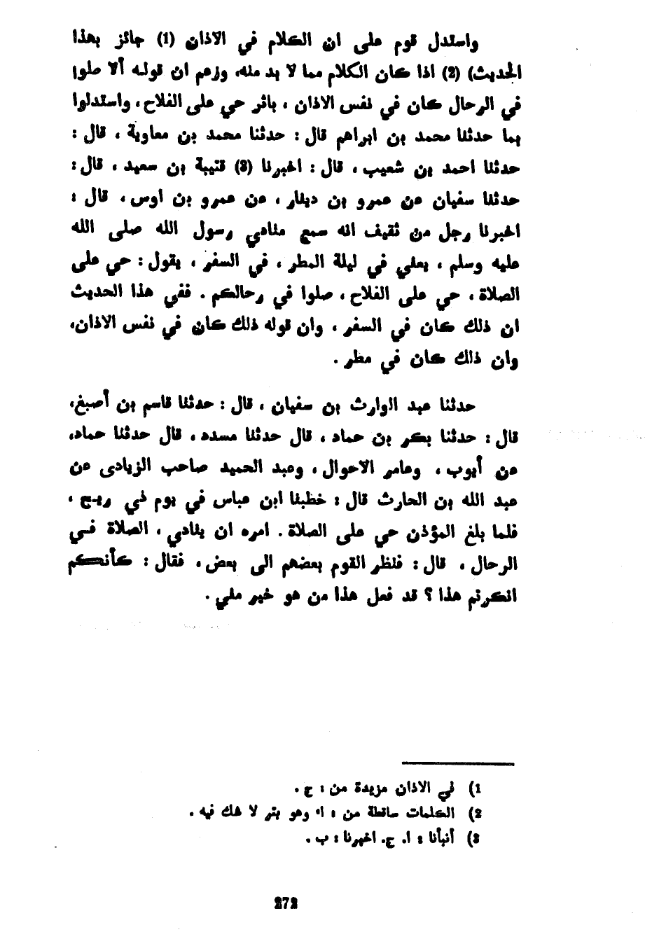 وَاسْتَدَلَّ قَوْمٌ عَلَى أَنَّ الْكَلَامَ فِي الْأَذَانِ جَائِزٌ بِهَذَا الْحَدِيثِ) إِذَا كَانَ الْكَلَامُ مِمَّا لَا بُدَّ مِنْهُ وَزَعَمَ أَنَّ قَوْلَهُ أَلَا صَلُّوا فِي الرِّحَالِ كَانَ فِي نَفْسِ الْأَذَانِ بِأَثَرِ حَيَّ عَلَى الْفَلَاحِ وَاسْتَدَلُّوا بِمَا حَدَّثَنَا مُحَمَّدُ بْنُ إِبْرَاهِيمَ قَالَ حَدَّثَنَا مُحَمَّدُ بْنُ مُعَاوِيَةَ قَالَ حَدَّثَنَا أَحْمَدُ بْنُ شُعَيْبٍ قَالَ أَخْبَرَنَا قُتَيْبَةُ بْنُ سَعِيدٍ قَالَ حَدَّثَنَا سُفْيَانُ عَنْ عَمْرِو بْنِ دِينَارٍ عَنْ عَمْرِو بْنِ أَوْسٍ قَالَ أَخْبَرَنَا رَجُلٌ مِنْ ثَقِيفٍ أَنَّهُ سَمِعَ مُنَادِيَ رَسُولِ اللَّهِ صَلَّى اللَّهُ عَلَيْهِ وَسَلَّمَ يَعْنِي فِي لَيْلَةِ الْمَطَرِ فِي السَّفَرِ يَقُولُ حَيَّ عَلَى الصَّلَاةِ حَيَّ عَلَى الْفَلَاحِ صَلُّوا فِي رِحَالِكُمْ فَفِي هَذَا الْحَدِيثِ أَنَّ ذَلِكَ كَانَ فِي السَّفَرِ وَأَنَّ قَوْلَهُ كَانَ فِي نَفْسِ الْأَذَانِ وَأَنَّ ذَلِكَ كَانَ فِي مَطَرٍ حَدَّثَنَا عَبْدُ الْوَارِثِ بْنُ سُفْيَانَ قَالَ حَدَّثَنَا قَاسِمُ بْنُ أَصْبَغَ قَالَ حَدَّثَنَا بَكْرُ بْنُ حَمَّادٍ قَالَ حَدَّثَنَا مُسَدَّدٌ قَالَ حَدَّثَنَا حَمَّادُ عن أيوب وعامر الأحوال وَعَبْدِ الْحَمِيدِ صَاحِبِ الزِّيَادِيِّ عَنْ عَبْدِ اللَّهِ بْنِ الْحَارِثِ قَالَ خَطَبَنَا ابْنُ عَبَّاسٍ فِي يَوْمٍ ذِي رِيحٍ فَلَمَّا بَلَغَ الْمُؤَذِّنُ حَيَّ عَلَى الصَّلَاةِ أَمَرَهُ أَنْ يُنَادِيَ الصَّلَاةُ فِي الرِّحَالِ قَالَ فَنَظَرَ الْقَوْمُ بَعْضُهُمْ إِلَى بَعْضٍ فَقَالَ كَأَنَّكُمْ أَنْكَرْتُمْ هَذَا قَدْ فَعَلَ هَذَا مِنْ هُوَ خَيْرٌ مِنِّي