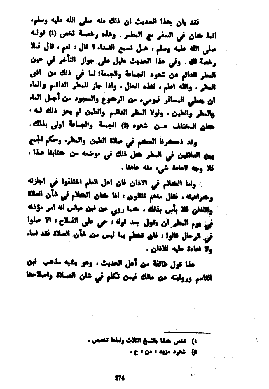 فَقَدْ بَانَ بِهَذَا الْحَدِيثِ أَنَّ ذَلِكَ مِنْهُ صَلَّى اللَّهُ عَلَيْهِ وَسَلَّمَ إِنَّمَا كَانَ فِي السَّفَرِ مَعَ الْمَطَرِ وَهَذِهِ رُخْصَةٌ تَخُصُّ قَوْلَهُ صَلَّى اللَّهُ عَلَيْهِ وَسَلَّمَ هَلْ تَسْمَعُ النِّدَاءَ قَالَ نَعَمْ قَالَ فَلَا رُخْصَةَ لَكَ وَفِي هَذَا الْحَدِيثِ دَلِيلٌ عَلَى جَوَازِ التَّأَخُّرِ فِي حِينِ الْمَطَرِ الدَّائِمِ عَنْ شُهُودِ الْجَمَاعَةِ وَالْجُمُعَةِ لِمَا فِي ذَلِكَ مِنْ أَذَى الْمَطَرِ وَاللَّهُ أَعْلَمُ لِهَذِهِ الْحَالِ وَإِذَا جَازَ لِلْمَطَرِ الدَّائِمِ والماء أَنْ يُصَلِّيَ الْمُسَافِرُ فَيُومِئُ مِنَ الرُّكُوعِ وَالسُّجُودِ مِنْ أَجْلِ الْمَاءِ وَالْمَطَرِ وَالطِّينِ وَلَوْلَا الْمَطَرُ الدَّائِمُ وَالطِّينُ لَمْ يَجُزْ ذَلِكَ لَهُ كَانَ الْمُخْتَلِفُ عَنْ شُهُودِ الْجُمُعَةِ وَالْجَمَاعَةِ أَوْلَى بِذَلِكَ وَقَدْ ذَكَرْنَا الْحُكْمَ فِي صَلَاةِ الطِّينِ وَالْمَطَرِ وَحُكْمَ الْجَمْعِ بَيْنَ الصَّلَاتَيْنِ فِي الْمَطَرِ كُلَّ ذَلِكَ فِي مَوْضِعِهِ مِنْ كِتَابِنَا هَذَا فَلَا وَجْهَ لِإِعَادَةِ شَيْءٍ مِنْهُ هَاهُنَا وَأَمَّا الْكَلَامُ فِي الْأَذَانِ فَإِنَّ أَهْلَ الْعِلْمِ اخْتَلَفُوا فِي إِجَازَتِهِ وَكَرَاهِيَتِهِ فَقَالَ مِنْهُمْ قَائِلُونَ إِذَا كَانَ الْكَلَامُ فِي شَأْنِ الصَّلَاةِ وَالْأَذَانِ فَلَا بَأْسَ بِذَلِكَ كَمَا رُوِيَ عَنِ ابْنِ عَبَّاسٍ أَنَّهُ أَمَرَ مُؤَذِّنَهُ فِي يَوْمِ الْمَطَرِ أَنْ يَقُولَ بَعْدَ قَوْلِهِ حَيَّ عَلَى الْفَلَاحِ أَلَا صَلُّوا فِي الرِّحَالِ قَالُوا فَإِنْ تَكَلَّمَ بِمَا لَيْسَ مِنْ شَأْنِ الصَّلَاةِ فَقَدْ أَسَاءَ وَلَا إِعَادَةَ عَلَيْهِ لِلْأَذَانِ هَذَا قَوْلُ طَائِفَةٍ مِنْ أَهْلِ الْحَدِيثِ وَهُوَ يُشْبِهُ مَذْهَبَ ابْنِ الْقَاسِمِ وَرِوَايَتُهُ عَنْ مَالِكٍ فِيمَنْ تَكَلَّمَ فِي شَأْنِ الصَّلَاةِ وإصلاحها