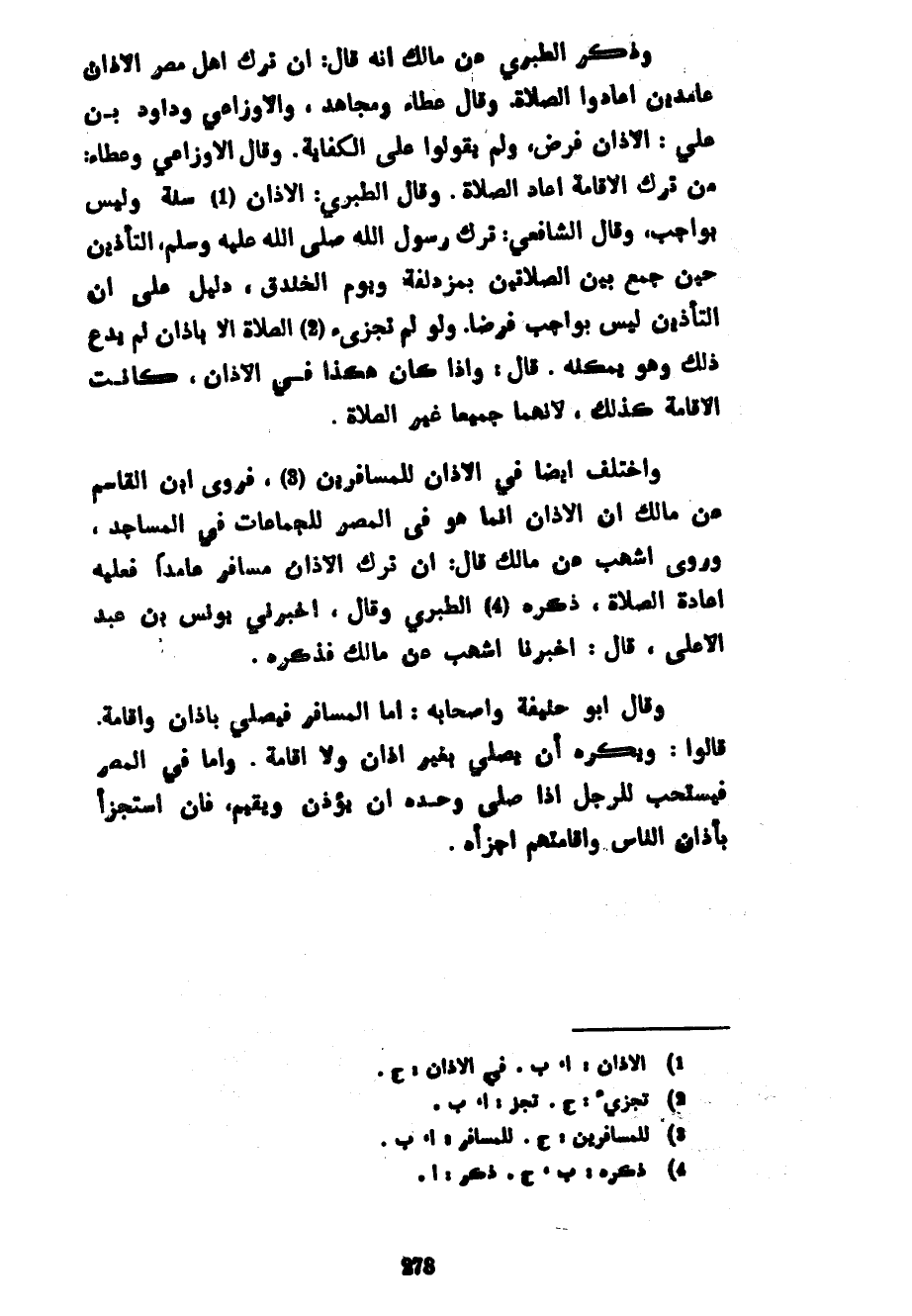 وَذَكَرَ الطَّبَرِيُّ عَنْ مَالِكٍ أَنَّهُ قَالَ إِنْ تَرَكَ أَهْلُ مِصْرٍ الْأَذَانَ عَامِدِينَ أَعَادُوا الصَّلَاةَ وَقَالَ عَطَاءٌ وَمُجَاهِدٌ وَالْأَوْزَاعِيُّ وَدَاوُدُ بْنُ عَلِيٍّ الْأَذَانُ فَرْضٌ وَلَمْ يَقُولُوا عَلَى الْكِفَايَةِ وَقَالَ الْأَوْزَاعِيُّ وَعَطَاءٌ مَنْ تَرَكَ الْإِقَامَةَ أَعَادَ الصَّلَاةَ وَقَالَ الطَّبَرِيُّ الْأَذَانُ سُنَّةٌ وَلَيْسَ بِوَاجِبٍ وَقَالَ الشَّافِعِيُّ تَرَكَ رَسُولُ اللَّهِ صَلَّى اللَّهُ عَلَيْهِ وَسَلَّمَ التَّأْذِينَ حِينَ جَمَعَ بَيْنَ الصَّلَاتَيْنِ بِمُزْدَلِفَةَ وَيَوْمَ الْخَنْدَقِ دَلِيلٌ عَلَى أَنَّ التَّأْذِينَ لَيْسَ بِوَاجِبٍ فَرْضًا وَلَوْ لَمْ تُجْزِئِ الصَّلَاةُ إِلَّا بِأَذَانٍ لَمْ يَدَعْ ذَلِكَ وَهُوَ يُمْكِنُهُ قَالَ وَإِذَا كَانَ هَكَذَا فِي الْأَذَانِ كَانَتِ الْإِقَامَةُ كَذَلِكَ لِأَنَّهُمَا جَمِيعًا غَيْرُ الصَّلَاةِ وَاخْتُلِفَ أَيْضًا فِي الْأَذَانِ لِلْمُسَافِرِينَ فَرَوَى ابْنُ الْقَاسِمِ عَنْ مَالِكٍ أَنَّ الْأَذَانَ إِنَّمَا هُوَ فِي الْمِصْرِ لِلْجَمَاعَاتِ فِي الْمَسَاجِدِ وَرَوَى أَشْهَبُ عَنْ مَالِكٍ قَالَ إِنْ تَرَكَ الْأَذَانَ مُسَافِرٌ عَامِدًا فَعَلَيْهِ إِعَادَةُ الصَّلَاةِ ذَكَرَهُ الطَّبَرِيُّ وَقَالَ أَخْبَرَنِي يُونُسُ بْنُ عَبْدِ الْأَعْلَى قَالَ أَخْبَرَنَا أَشْهَبُ عَنْ مَالِكٍ فَذَكَرَهُ وَقَالَ أَبُو حَنِيفَةَ وَأَصْحَابُهُ أَمَّا الْمُسَافِرُ فَيُصَلِّي بِأَذَانٍ وَإِقَامَةٍ قَالُوا وَيُكْرَهُ أَنْ يُصَلِّيَ بِغَيْرِ أَذَانٍ وَلَا إِقَامَةٍ وَأَمَّا فِي الْمِصْرِ فَيُسْتَحَبُّ لِلرَّجُلِ إِذَا صَلَّى وَحْدَهُ أَنْ يُؤَذِّنَ وَيُقِيمَ فَإِنِ اسْتَجْزَأَ بِأَذَانِ النَّاسِ وَإِقَامَتِهِمْ أجزأه
