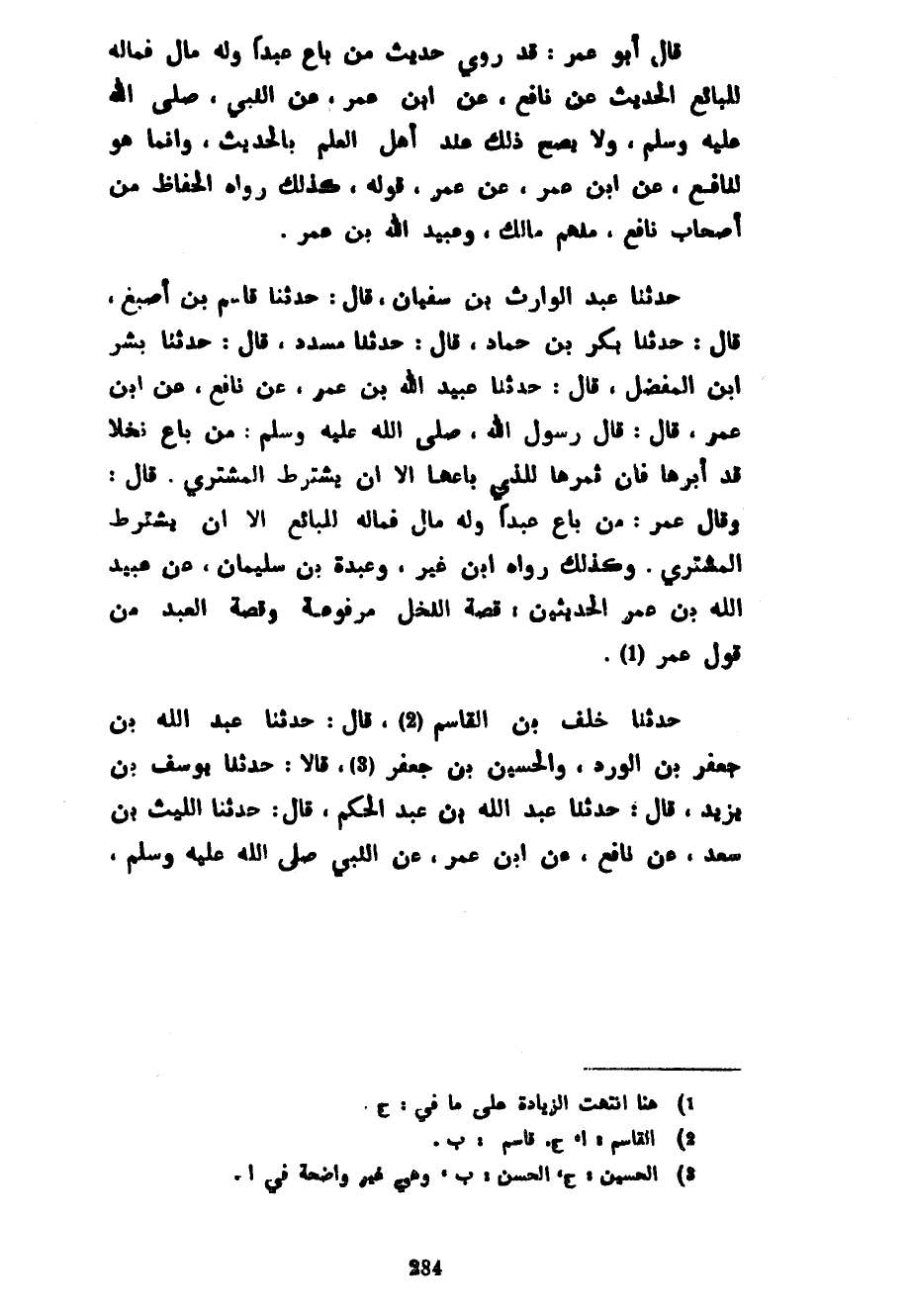 قَالَ أَبُو عُمَرَ قَدْ رُوِيَ حَدِيثُ مَنْ بَاعَ عَبْدًا وَلَهُ مَالٌ فَمَالُهُ لِلْبَائِعِ الْحَدِيثُ عَنْ نَافِعٍ عَنِ ابْنِ عُمَرَ عَنِ النَّبِيِّ صَلَّى اللَّهُ عَلَيْهِ وَسَلَّمَ وَلَا يَصِحُّ ذَلِكَ عِنْدَ أَهْلِ الْعِلْمِ بِالْحَدِيثِ وَإِنَّمَا هُوَ لِنَافِعٍ عَنِ ابْنِ عُمَرَ عَنْ عُمَرَ قَوْلُهُ كَذَلِكَ رَوَاهُ الْحُفَّاظُ مِنْ أَصْحَابِ نَافِعٍ مِنْهُمْ مَالِكٌ وَعُبَيْدُ اللَّهِ بْنُ عُمَرَ حَدَّثَنَا عَبْدُ الْوَارِثِ بْنُ سُفْيَانَ قَالَ حَدَّثَنَا قَاسِمُ بْنُ أَصْبَغَ قَالَ حَدَّثَنَا بَكْرُ بْنُ حَمَّادٍ قَالَ حَدَّثَنَا مُسَدَّدٌ قَالَ حَدَّثَنَا بِشْرُ بْنُ الْمُفَضَّلِ قَالَ حَدَّثَنَا عُبَيْدُ اللَّهِ بْنُ عُمَرَ عَنْ نَافِعٍ عَنِ ابْنِ عُمَرَ قَالَ قَالَ رَسُولُ اللَّهِ صَلَّى اللَّهُ عَلَيْهِ وَسَلَّمَ مَنْ بَاعَ نَخْلًا قَدْ أَبَّرَهَا فَإِنَّ ثَمَرَهَا لِلَّذِي بَاعَهَا إِلَّا أَنْ يَشْتَرِطَ الْمُشْتَرِي قَالَ وَقَالَ عُمَرُ مَنْ بَاعَ عَبْدًا وَلَهُ مَالٌ فَمَالُهُ لِلْبَائِعِ إِلَّا أن يشترط المشتري وكذلك رواه ابن غير وعَبْدَةُ بْنُ سُلَيْمَانَ عَنْ عُبَيْدِ اللَّهِ بْنِ عُمَرَ الْحَدِيثَيْنِ قِصَّةَ النَّخْلِ مَرْفُوعَةً وَقِصَّةَ الْعَبْدِ مِنْ قَوْلِ عُمَرَ حَدَّثَنَا خَلَفُ بْنُ الْقَاسِمِ قَالَ حَدَّثَنَا عَبْدُ اللَّهِ بْنُ جَعْفَرِ بْنِ الْوَرْدِ وَالْحُسَيْنُ بْنُ جَعْفَرٍ قَالَا حَدَّثَنَا يُوسُفُ بْنُ يَزِيدَ قَالَ حَدَّثَنَا عَبْدُ اللَّهِ بْنِ عَبْدِ الْحَكَمِ قَالَ حَدَّثَنَا اللَّيْثُ بْنُ سَعْدٍ عَنْ نَافِعٍ عَنِ ابْنِ عُمَرَ عَنِ النَّبِيِّ صَلَّى اللَّهُ عَلَيْهِ وَسَلَّمَ