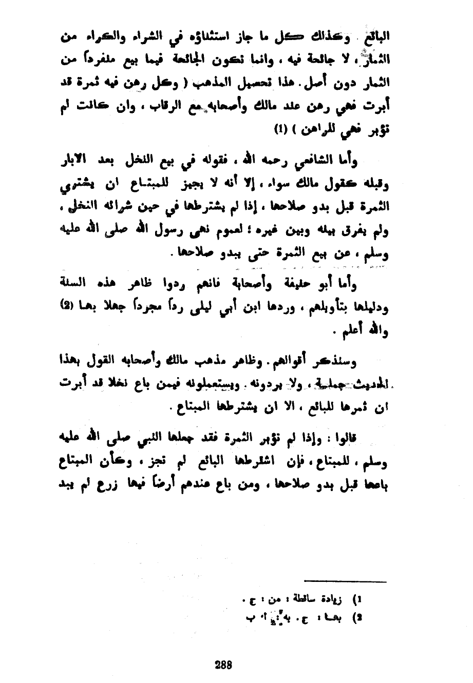 الْبَائِعِ وَكَذَلِكَ كُلُّ مَا جَازَ اسْتِثْنَاؤُهُ فِي الشِّرَاءِ وَالْكِرَاءِ مِنَ الثِّمَارِ لَا جَائِحَةَ فِيهِ وَإِنَّمَا تَكُونُ الْجَائِحَةُ فِيمَا بِيعَ مُنْفَرِدًا مِنَ الثِّمَارِ دُونَ أَصْلِ هَذَا تَحْصِيلُ الْمَذْهَبِ (وَكُلُّ رَهْنٍ فِيهِ ثَمَرَةٌ قَدْ أُبِّرَتْ فَهِيَ رَهْنٌ عِنْدَ مَالِكٍ وَأَصْحَابِهِ مَعَ الرِّقَابِ وَإِنْ كَانَتْ لَمْ تُؤَبَّرْ فَهِيَ لِلرَّاهِنِ) وَأَمَّا الشَّافِعِيُّ رَحِمَهُ اللَّهُ فَقَوْلُهُ فِي بَيْعِ النَّخْلِ بَعْدَ الْإِبَارِ وَقَبْلَهُ كَقَوْلِ مَالِكٍ سَوَاءٌ إِلَّا أَنَّهُ لَا يُجِيزُ لِلْمُبْتَاعِ أَنْ يَشْتَرِيَ الثَّمَرَةَ قَبْلَ بُدُوِّ صَلَاحِهَا إِذَا لَمْ يَشْتَرِطْهَا فِي حِينِ شِرَائِهِ النَّخْلَ وَلَمْ يُفَرِّقْ بَيْنَهُ وَبَيْنَ غَيْرِهِ لِعُمُومِ نَهَى رَسُولُ اللَّهِ صَلَّى اللَّهُ عَلَيْهِ وَسَلَّمَ عَنْ بَيْعِ الثَّمَرَةِ حَتَّى يَبْدُوَ صَلَاحُهَا وَأَمَّا أَبُو حَنِيفَةَ وَأَصْحَابُهُ فَإِنَّهُمْ رَدُّوا ظَاهِرَ هَذِهِ السُّنَّةِ وَدَلِيلُهَا بِتَأْوِيلِهِمْ وَرَدَّهَا ابْنُ أَبِي لَيْلَى رَدًّا مُجَرَّدًا جَهْلًا بِهَا وَاللَّهُ أَعْلَمُ وَسَنَذْكُرُ أَقْوَالَهُمْ وَظَاهِرُ مَذْهَبِ مَالِكٍ وَأَصْحَابِهِ الْقَوْلُ بِهَذَا الْحَدِيثِ جُمْلَةً وَلَا يَرُدُّونَهُ وَيَسْتَعْمِلُونَهُ فِيمَنْ بَاعَ نَخْلًا قَدْ أُبِّرَتْ أَنَّ ثَمَرَهَا لِلْبَائِعِ إِلَّا أَنْ يَشْتَرِطَهَا الْمُبْتَاعُ قَالُوا وَإِذَا لَمْ تُؤَبَّرِ الثَّمَرَةُ فَقَدْ جَعَلَهَا النَّبِيُّ صَلَّى اللَّهُ عَلَيْهِ وَسَلَّمَ لِلْمُبْتَاعِ فَإِنِ اشْتَرَطَهَا الْبَائِعُ لَمْ تَجُزْ وَكَأَنَّ الْمُبْتَاعَ بَاعَهَا قَبْلَ بُدُوِّ صَلَاحِهَا وَمَنْ بَاعَ عِنْدَهُمْ أَرْضًا فِيهَا زَرْعٌ لَمْ يَبْدُ