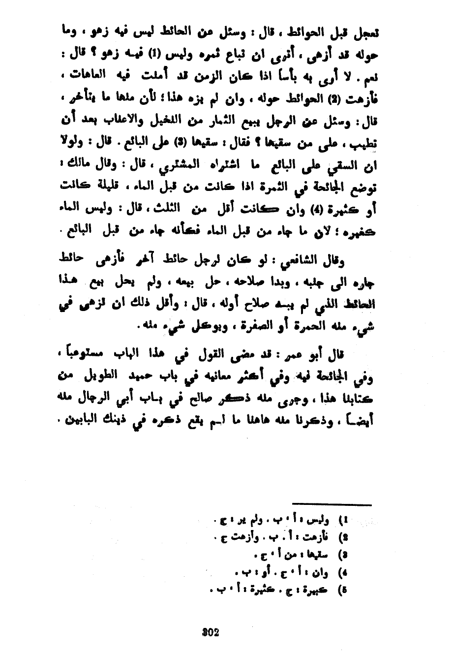 تَعَجَّلَ قَبْلَ الْحَوَائِطِ قَالَ وَسُئِلَ عَنِ الْحَائِطِ لَيْسَ فِيهِ زُهُوٌّ وَمَا حَوْلَهُ قَدْ أَزْهَى أَتَرَى أَنْ تُبَاعَ ثَمَرُهُ وَلَيْسَ فِيهِ زُهُوٌّ قَالَ نَعَمْ لَا أَرَى بِهِ بَأْسًا إِذَا كَانَ الزَّمَنُ قَدْ أُمِنَتْ فِيهِ الْعَاهَاتُ فَأَزْهَتِ الْحَوَائِطُ حَوْلَهُ وَإِنْ لَمْ يَزْهُ هَذَا لِأَنَّ مِنْهَا مَا يَتَأَخَّرُ قَالَ وَسُئِلَ عَنْ الرَّجُلِ يَبِيعُ الثِّمَارَ مِنَ النَّخِيلِ وَالْأَعْنَابِ بَعْدَ أَنْ تَطِيبَ عَلَى مَنْ سَقْيُهَا فَقَالَ سَقْيُهَا عَلَى الْبَائِعِ قَالَ وَلَوْلَا أَنَّ السَّقْيَ عَلَى الْبَائِعِ مَا اشْتَرَاهُ الْمُشْتَرِي قَالَ وَقَالَ مَالِكٌ تُوضَعُ الْجَائِحَةُ فِي الثَّمَرَةِ إِذَا كَانَتْ مِنْ قِبَلِ الْمَاءِ قَلِيلَةً كَانَتْ أَوْ كَثِيرَةً وَإِنْ كَانَتْ أَقَلَّ مِنَ الثُّلُثِ قَالَ وَلَيْسَ الْمَاءُ كَغَيْرِهِ لِأَنَّ مَا جَاءَ مِنْ قِبَلِ الْمَاءِ فَكَأَنَّهُ جَاءَ مِنْ قِبَلِ الْبَائِعِ وَقَالَ الشَّافِعِيُّ لَوْ كَانَ لِرَجُلٍ حَائِطٌ آخَرُ فَأَزْهَى حَائِطُ جَارِهِ إِلَى جَنْبِهِ وَبَدَا صَلَاحُهُ حَلَّ بَيْعُهُ وَلَمْ يَحِلَّ بَيْعُ هَذَا الْحَائِطِ الَّذِي لَمْ يَبْدُ صَلَاحُ أَوَّلِهِ قَالَ وَأَقَلُّ ذَلِكَ أَنْ تُزْهِيَ في شيء منه الحمرة أو الصفرة ويوكل شَيْءٌ مِنْهُ قَالَ أَبُو عُمَرَ قَدْ مَضَى الْقَوْلُ فِي هَذَا الْبَابِ مُسْتَوْعَبًا وَفِي الْجَائِحَةِ فِيهِ وَفِي أَكْثَرِ مَعَانِيهِ فِي بَابِ حُمَيْدٍ الطَّوِيلِ مِنْ كِتَابِنَا هَذَا وَجَرَى مِنْهُ ذِكْرٌ صَالِحٌ فِي بَابِ أَبِي الرِّجَالِ مِنْهُ أَيْضًا وَذَكَرْنَا مِنْهُ هَاهُنَا مَا لَمْ يَقَعْ ذِكْرُهُ فِي ذَيْنَكِ الْبَابَيْنِ