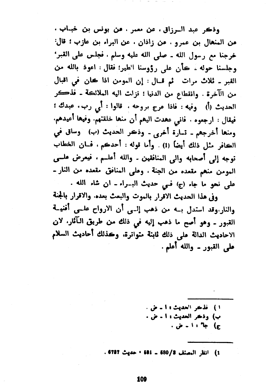 وَذَكَرَ عَبْدُ الرَّزَّاقِ عَنْ مَعْمَرٍ عَنْ يُونُسَ بْنِ خَبَّابٍ عَنِ الْمِنْهَالِ بْنِ عُمَرَ عَنْ زَاذَانَ عَنِ الْبَرَاءِ بْنِ عَازِبٍ قَالَ خَرَجْنَا مَعَ رَسُولِ اللَّهِ صَلَّى اللَّهُ عَلَيْهِ وَسَلَّمَ فَجَلَسَ عَلَى الْقَبْرِ وَجَلَسْنَا حَوْلَهُ كَأَنَّ عَلَى رؤوسنا الطَّيْرُ فَقَالَ أَعُوذُ بِاللَّهِ مِنَ الْقَبْرِ ثَلَاثَ مَرَّاتٍ ثُمَّ قَالَ إِنَّ الْمُؤْمِنَ إِذَا كَانَ فِي إِقْبَالٍ مِنَ الْآخِرَةِ وَانْقِطَاعٍ مِنَ الدُّنْيَا نَزَلَتْ إِلَيْهِ الْمَلَائِكَةُ فَذَكَرَ الْحَدِيثَ وَفِيهِ فَإِذَا عَرَجَ بِرُوحِهِ قَالُوا أَيْ رَبِّ عَبْدُكُ فَيُقَالُ أَرْجِعُوهُ فَإِنِّي عَهِدْتُ إِلَيْهِمْ أَنَّ مِنْهَا خَلَقْتُهُمْ وَفِيهَا أُعِيدُهُمْ وَمِنْهَا أُخْرِجُهُمْ تَارَةً أُخْرَى وَذَكَرَ الْحَدِيثَ وَسَاقَ فِي الْكَافِرِ مِثْلَ ذَلِكَ أَيْضًا وَأَمَّا قَوْلُهُ أَحَدُكُمْ فَإِنَّ الْخِطَابَ تَوَجَّهَ إِلَى أَصْحَابِهِ وَإِلَى الْمُنَافِقِينَ وَاللَّهُ أَعْلَمُ فَيُعْرَضُ عَلَى الْمُؤْمِنِ مِنْهُمْ مَقْعَدُهُ مِنَ الْجَنَّةِ وَعَلَى الْمُنَافِقِ مَقْعَدُهُ مِنَ النَّارِ عَلَى نَحْوِ مَا جَاءَ فِي حَدِيثِ الْبَرَاءِ إِنْ شَاءَ اللَّهُ وَفِي هَذَا الْحَدِيثِ الْإِقْرَارُ بِالْمَوْتِ وَالْبَعْثِ بَعْدَهُ وَالْإِقْرَارُ بِالْجَنَّةِ وَالنَّارِ وَقَدِ اسْتَدَلَّ بِهِ مَنْ ذَهَبَ إِلَى أَنَّ الْأَرْوَاحَ عَلَى أَفْنِيَةِ الْقُبُورِ وَهُوَ أَصَحُّ مَا ذُهِبَ إِلَيْهِ فِي ذَلِكَ مِنْ طَرِيقِ الْآثَارِ لِأَنَّ الْأَحَادِيثَ الدَّالَّةَ عَلَى ذَلِكَ ثَابِتَةٌ مُتَوَاتِرَةٌ وَكَذَلِكَ أَحَادِيثُ السَّلَامِ عَلَى الْقُبُورِ والله أعلم