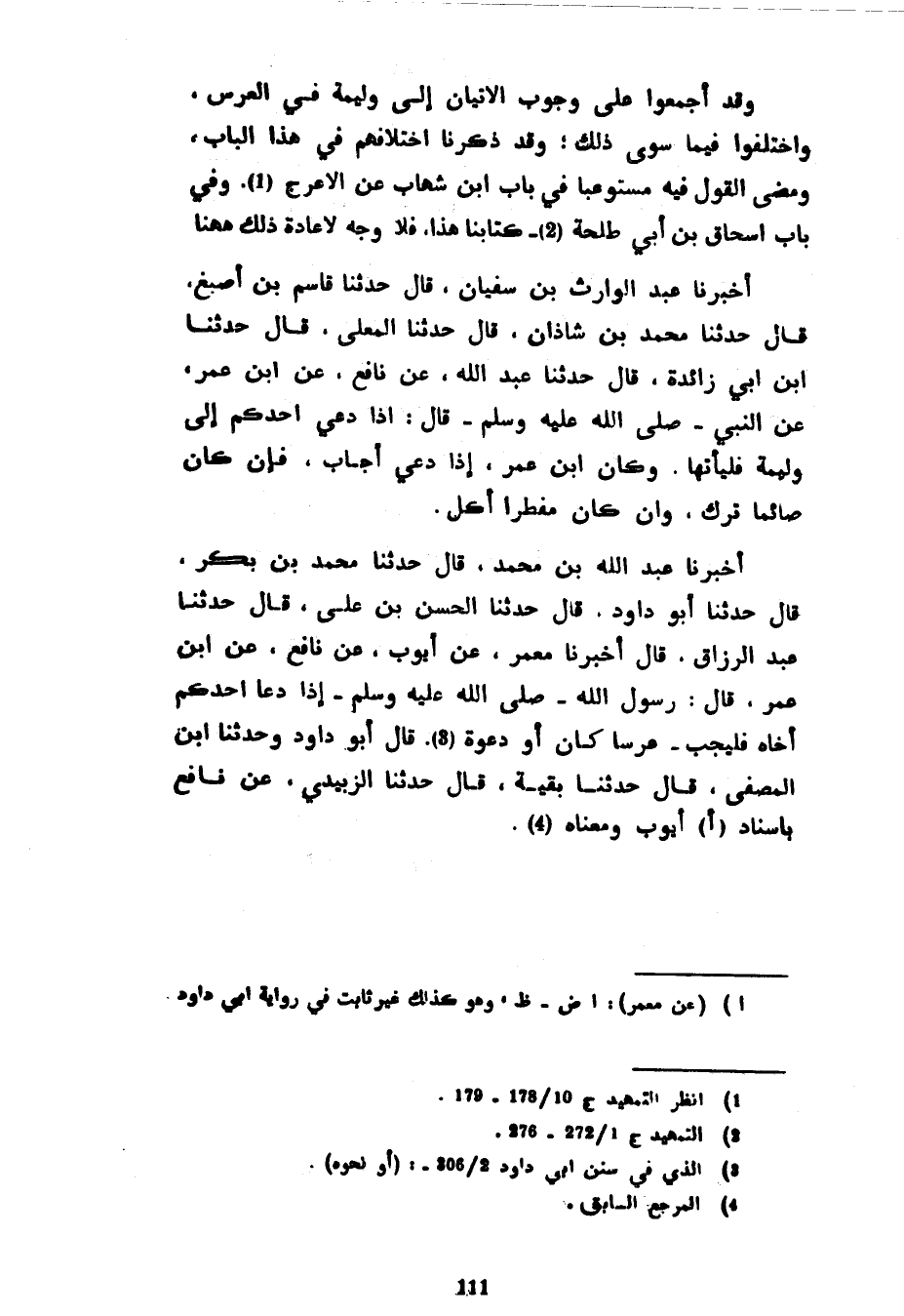 وَقَدْ أَجْمَعُوا عَلَى وُجُوبِ الْإِتْيَانِ إِلَى وَلِيمَةٍ فِي الْعُرْسِ وَاخْتَلَفُوا فِيمَا سِوَى ذَلِكَ وَقَدْ ذَكَرْنَا اخْتِلَافَهُمْ فِي هَذَا الْبَابِ وَمَضَى الْقَوْلُ فيه مستوعبا في باب ابن شهاب عن الْأَعْرَجِ وَفِي بَابِ إِسْحَاقَ بْنِ أَبِي طَلْحَةَ كتابنا هذا فلا وجه لإعادة ذلك ههنا أَخْبَرَنَا عَبْدُ الْوَارِثِ بْنُ سُفْيَانَ قَالَ حَدَّثَنَا قَاسِمُ بْنُ أَصْبَغَ قَالَ حَدَّثَنَا مُحَمَّدُ بْنُ شَاذَانَ قَالَ حَدَّثَنَا الْمُعَلَّى قَالَ حَدَّثَنَا ابْنُ أَبِي زَائِدَةَ قَالَ حَدَّثَنَا عَبْدُ اللَّهِ عَنْ نَافِعٍ عَنِ ابْنِ عُمَرَ عَنِ النَّبِيِّ صلى اللَّهُ عَلَيْهِ وَسَلَّمَ قَالَ إِذَا دُعِيَ أَحَدُكُمْ إِلَى وَلِيمَةٍ فَلْيَأْتِهَا وَكَانَ ابْنُ عُمَرَ إِذَا دُعِيَ أَجَابَ فَإِنْ كَانَ صَائِمًا تَرَكَ وَإِنْ كَانَ مُفْطِرًا أَكَلَ أَخْبَرَنَا عَبْدُ اللَّهِ بْنُ مُحَمَّدٍ قَالَ حَدَّثَنَا مُحَمَّدُ بْنُ بَكْرٍ قَالَ حَدَّثَنَا أَبُو دَاوُدَ قَالَ حَدَّثَنَا الْحَسَنُ بْنُ عَلِيٍّ قَالَ حَدَّثَنَا عَبْدُ الرَّزَّاقِ قَالَ أَخْبَرَنَا مَعْمَرٌ عَنْ أَيُّوبَ عَنْ نَافِعٍ عَنِ ابْنِ عُمَرَ قَالَ رَسُولُ اللَّهِ صَلَّى اللَّهُ عَلَيْهِ وَسَلَّمَ إِذَا دَعَا أَحَدُكُمْ أَخَاهُ فَلْيُجِبْ عُرْسًا كَانَ أَوْ دَعْوَةً قَالَ أَبُو دَاوُدَ وَحَدَّثَنَا ابْنُ الْمُصَفَّى قَالَ حَدَّثَنَا بَقِيَّةُ قَالَ حَدَّثَنَا الزُّبَيْدِيُّ عَنْ نَافِعٍ بِإِسْنَادِ أَيُّوبَ وَمَعْنَاهُ
