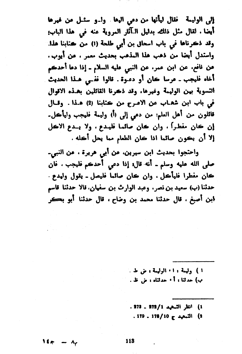 إِلَى الْوَلِيمَةِ فَقَالَ لِيَأْتِهَا مَنْ دُعِيَ إِلَيْهَا وَلَوْ سُئِلَ عَنْ غَيْرِهَا أَيْضًا لَقَالَ مِثْلَ ذَلِكَ بِدَلِيلِ الْآثَارِ الْمَرْوِيَّةِ عَنْهُ فِي هَذَا الْبَابِ وَقَدْ ذَكَرْنَاهَا فِي بَابِ إِسْحَاقَ بْنِ أَبِي طَلْحَةَ مِنْ كِتَابِنَا هَذَا وَاسْتَدَلَّ أَيْضًا مَنْ ذَهَبَ هَذَا الْمَذْهَبَ بِحَدِيثِ مَعْمَرٍ عَنْ أَيُّوبَ عَنْ نَافِعٍ عَنِ ابْنِ عُمَرَ عن النَّبِيِّ عَلَيْهِ السَّلَامُ إِذَا دَعَا أَحَدُكُمْ أَخَاهُ فَلْيُجِبْ عُرْسًا كَانَ أَوْ دَعْوَةً قَالُوا فَفِي هَذَا الْحَدِيثِ التَّسْوِيَةُ بَيْنَ الْوَلِيمَةِ وَغَيْرِهَا وَقَدْ ذَكَرْنَا الْقَائِلِينَ بِهَذِهِ الْأَقْوَالِ فِي بَابِ ابْنِ شِهَابٍ عَنِ الْأَعْرَجِ مِنْ كِتَابِنَا هَذَا وَقَالَ قَائِلُونَ مِنْ أَهْلِ الْعِلْمِ مَنْ دُعِيَ إِلَى وَلِيمَةٍ فَلْيُجِبْ وَلْيَأْكُلْ إِنْ كَانَ مُفْطِرًا وَإِنْ كَانَ صَائِمًا فَلْيَدَعْ وَلَا يَدَعِ الْأَكْلَ إِلَّا أَنْ يَكُونَ صَائِمًا إِذَا كَانَ الطَّعَامُ مِمَّا يَحِلُّ أَكْلُهُ وَاحْتَجُّوا بِحَدِيثِ ابْنِ سِيرِينَ عَنْ أَبِي هُرَيْرَةَ عَنِ النَّبِيِّ صَلَّى اللَّهُ عَلَيْهِ وَسَلَّمَ أَنَّهُ قَالَ إِذَا دُعِيَ أَحَدُكُمْ فَلْيُجِبْ فَإِنْ كَانَ مُفْطِرًا فَلْيَأْكُلْ وَإِنْ كَانَ صَائِمًا فَلْيُصَلِّ يَقُولُ وَلْيَدْعُ حَدَّثَنَا سَعِيدُ بْنُ نَصْرٍ وَعَبْدُ الْوَارِثِ بْنُ سُفْيَانَ قَالَا حَدَّثَنَا قَاسِمُ بْنُ أَصْبَغَ قَالَ حَدَّثَنَا مُحَمَّدُ بْنُ وَضَّاحٍ قَالَ حَدَّثَنَا أَبُو بكر
