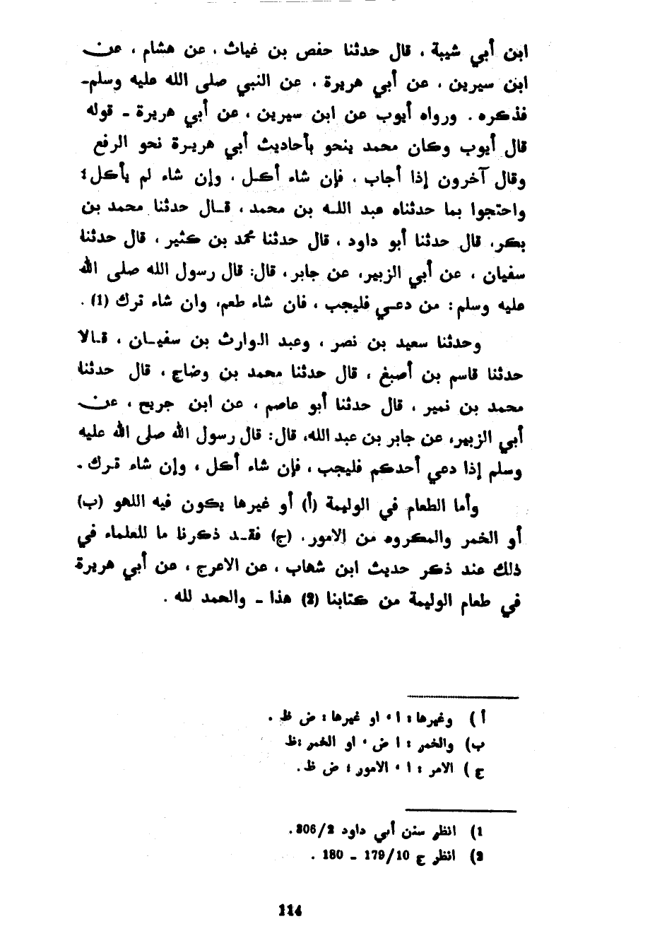 ابن أَبِي شَيْبَةَ قَالَ حَدَّثَنَا حَفْصُ بْنُ غِيَاثٍ عَنْ هِشَامٍ عَنِ ابْنِ سِيرِينَ عَنْ أَبِي هُرَيْرَةَ عَنِ النَّبِيِّ صَلَّى اللَّهُ عَلَيْهِ وَسَلَّمَ فَذَكَرَهُ وَرَوَاهُ أَيُّوبُ عَنِ ابْنِ سِيرِينَ عَنْ أَبِي هُرَيْرَةَ قَوْلُهُ قَالَ أَيُّوبُ وَكَانَ مُحَمَّدٌ يَنْحُو بِأَحَادِيثِ أَبِي هُرَيْرَةَ نَحْوَ الرَّفْعِ وَقَالَ آخَرُونَ إِذَا أَجَابَ فَإِنْ شَاءَ أَكَلَ وَإِنْ شَاءَ لَمْ يَأْكُلْ وَاحْتَجُّوا بِمَا حَدَّثَنَاهُ عَبْدُ اللَّهِ بْنُ مُحَمَّدٍ قَالَ حَدَّثَنَا مُحَمَّدُ بْنُ بَكْرٍ قَالَ حَدَّثَنَا أَبُو دَاوُدَ قَالَ حَدَّثَنَا مُحَمَّدُ بْنُ كَثِيرٍ قَالَ حَدَّثَنَا سُفْيَانُ عَنْ أَبِي الزُّبَيْرِ عَنْ جَابِرٍ قَالَ قَالَ رَسُولُ اللَّهِ صَلَّى اللَّهُ عَلَيْهِ وَسَلَّمَ مَنْ دُعِيَ فَلْيُجِبْ فَإِنْ شَاءَ طَعِمَ وَإِنْ شَاءَ تَرَكَ وَحَدَّثَنَا سَعِيدُ بْنُ نَصْرٍ وَعَبْدُ الْوَارِثِ بْنُ سُفْيَانَ قَالَا حَدَّثَنَا قَاسِمُ بْنُ أَصْبَغَ قَالَ حَدَّثَنَا مُحَمَّدُ بْنُ وَضَّاحٍ قَالَ حَدَّثَنَا مُحَمَّدُ بْنِ نُمَيْرٍ قَالَ حَدَّثَنَا أَبُو عَاصِمٍ عَنِ ابْنِ جُرَيْجٍ عَنْ أَبِي الزُّبَيْرِ عَنْ جَابِرٍ بْنِ عَبْدِ اللَّهِ قَالَ قَالَ رَسُولُ اللَّهِ صَلَّى اللَّهُ عَلَيْهِ وَسَلَّمَ إِذَا دُعِيَ أَحَدُكُمْ فَلْيُجِبْ فَإِنْ شَاءَ أَكَلَ وَإِنْ شَاءَ تَرَكَ وَأَمَّا الطَّعَامُ فِي الْوَلِيمَةِ أَوْ غَيْرِهَا يَكُونُ فِيهِ اللَّهْوُ أَوِ الْخَمْرُ وَالْمَكْرُوهُ مِنَ الْأُمُورِ فقد ذكرنا ما للعلماء فِي ذَلِكَ عِنْدَ ذِكْرِ حَدِيثِ ابْنِ شِهَابٍ عَنِ الْأَعْرَجِ عَنْ أَبِي هُرَيْرَةَ فِي طَعَامِ الْوَلِيمَةِ مِنْ كِتَابِنَا هَذَا وَالْحَمْدُ لِلَّهِ