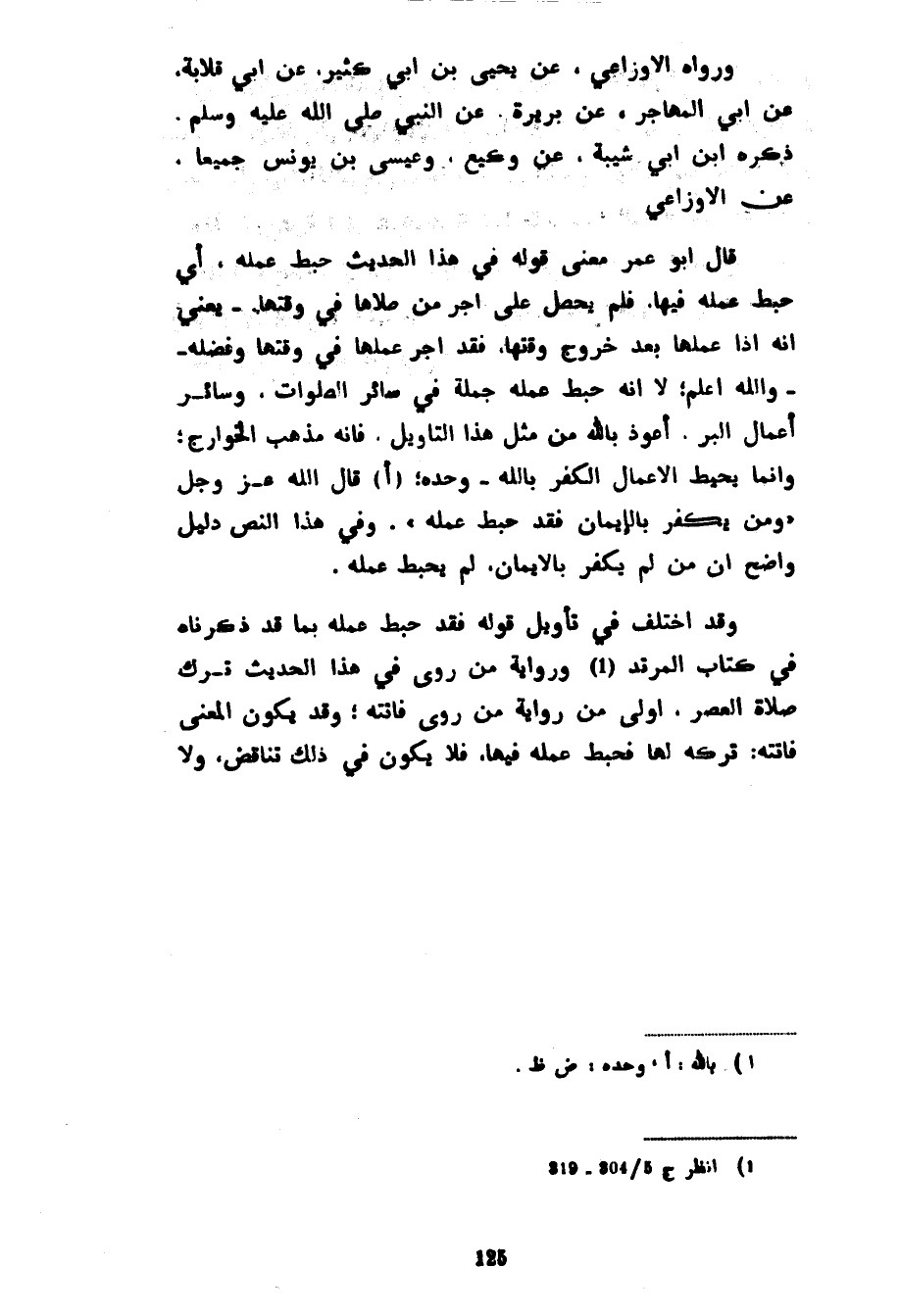 وَرَوَاهُ الْأَوْزَاعِيِّ عَنْ يَحْيَى بْنِ أَبِي كَثِيرٍ عَنْ أَبِي قِلَابَةَ عَنْ أَبِي الْمُهَاجِرِ عَنْ بُرَيْرَةَ عَنِ النَّبِيِّ صَلَّى اللَّهُ عَلَيْهِ وَسَلَّمَ ذَكَرَهُ ابْنُ أَبِي شَيْبَةَ عَنْ وَكِيعٍ وَعِيسَى بْنِ يُونُسَ جَمِيعًا عَنِ الْأَوْزَاعِيِّ قَالَ أَبُو عُمَرَ مَعْنَى قَوْلِهِ فِي هَذَا الْحَدِيثِ حَبِطَ عَمَلُهُ أَيْ حَبِطَ عَمَلُهُ فِيهَا فَلَمْ يَحْصُلْ عَلَى أَجْرِ مَنْ صَلَّاهَا فِي وَقْتِهَا يَعْنِي أَنَّهُ إِذَا عَمِلَهَا بَعْدَ خُرُوجِ وَقْتِهَا فَقَدَ أَجْرَ عَمَلِهَا فِي وَقْتِهَا وَفَضْلِهِ وَاللَّهُ أَعْلَمُ لَا أَنَّهُ حَبِطَ عَمَلُهُ جُمْلَةً فِي سَائِرِ الصَّلَوَاتِ وَسَائِرِ أَعْمَالِ الْبِرِّ أَعُوذُ بِاللَّهِ مَنْ مِثْلِ هَذَا التَّأْوِيلَ فَإِنَّهُ مَذْهَبُ الْخَوَارِجِ وَإِنَّمَا يُحْبِطُ الْأَعْمَالَ الْكُفْرُ بِاللَّهِ وَحْدَهُ قَالَ اللَّهُ عَزَّ وَجَلَّ وَمَنْ يَكْفُرْ بِالْإِيمَانِ فَقَدْ حَبِطَ عَمَلُهُ وَفِي هَذَا النَّصِّ دَلِيلٌ وَاضِحٌ أَنَّ مَنْ لَمْ يَكْفُرْ بِالْإِيمَانِ لَمْ يُحْبَطْ عَمَلُهُ وَقَدِ اخْتُلِفَ فِي تَأْوِيلِ قَوْلِهِ فَقَدَ حَبِطَ عَمَلُهُ بِمَا قَدْ ذَكَرْنَاهُ فِي كِتَابِ الْمُرْتَدِّ وَرِوَايَةُ مَنْ رَوَى فِي هَذَا الْحَدِيثِ تَرْكُ صَلَاةِ الْعَصْرِ أَوْلَى مِنْ رِوَايَةِ مَنْ رَوَى فَاتَتْهُ وَقَدْ يَكُونُ الْمَعْنَى فَاتَتْهُ تَرْكُهُ لَهَا فَحَبِطَ عَمَلُهُ فِيهَا فَلَا يَكُونُ فِي ذَلِكَ تناقض ولا