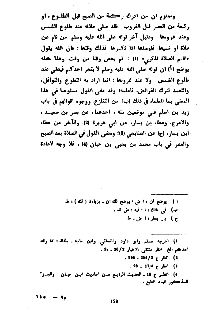 وَمَعْلُومٌ أَنَّ مَنْ أَدْرَكَ رَكْعَةً مِنَ الصُّبْحِ قَبْلَ الطُّلُوعِ أَوْ رَكْعَةً مِنَ الْعَصْرِ قَبْلَ الْغُرُوبِ فَقَدْ صَلَّى صَلَاتَهُ عِنْدَ طُلُوعِ الشَّمْسِ وَعِنْدَ غُرُوبِهَا وَدَلِيلٌ آخَرُ قَوْلُهُ صَلَّى اللَّهُ عَلَيْهِ وَسَلَّمَ مَنْ نَامَ عَنْ صَلَاةٍ أَوْ نَسِيَهَا فَلْيُصَلِّهَا إِذَا ذَكَرَهَا فَذَلِكَ وَقْتُهَا فَإِنَّ اللَّهَ يَقُولُ وَأَقِمِ الصَّلَاةَ لِذِكْرِي لَمْ يَخُصَّ وَقْتًا مِنْ وَقْتٍ وَهَذَا كُلُّهُ يُوَضِّحُ أَنَّ قَوْلَهُ صَلَّى اللَّهُ عَلَيْهِ وَسَلَّمَ لَا يَتَحَرَّ أَحَدُكُمْ فَيُصَلِّي عِنْدَ طُلُوعِ الشَّمْسِ وَلَا عِنْدَ غُرُوبِهَا إِنَّمَا أَرَادَ بِهِ التَّطَوُّعَ وَالنَّوَافِلَ وَالتَّعَمُّدَ لِتَرْكِ الْفَرَائِضِ فَاعْلَمْهُ وَقَدْ مَضَى الْقَوْلُ مُسْتَوْعَبًا فِي هَذَا الْمَعْنَى بِمَا لِلْعُلَمَاءِ فِي ذَلِكَ مِنَ التَّنَازُعِ وَوُجُوهُ أَقْوَالِهِمْ فِي بَابِ زَيْدِ بْنِ أَسْلَمَ فِي مَوْضِعَيْنِ مِنْهُ أَحَدُهُمَا عَنْ بُسْرِ بْنِ سَعِيدٍ وَالْأَعْرَجِ وَعَطَاءِ بْنِ يَسَارٍ عَنْ أَبِي هُرَيْرَةَ وَالْآخَرُ عَنْ عَطَاءِ بْنِ يَسَارٍ عَنِ الصَّنَابِحِيِّ وَمَضَى الْقَوْلُ فِي الصَّلَاةِ بَعْدَ الصُّبْحِ وَالْعَصْرِ فِي بَابِ مُحَمَّدِ بْنِ يَحْيَى بْنِ حِبَّانَ فَلَا وَجْهَ لِإِعَادَةِ