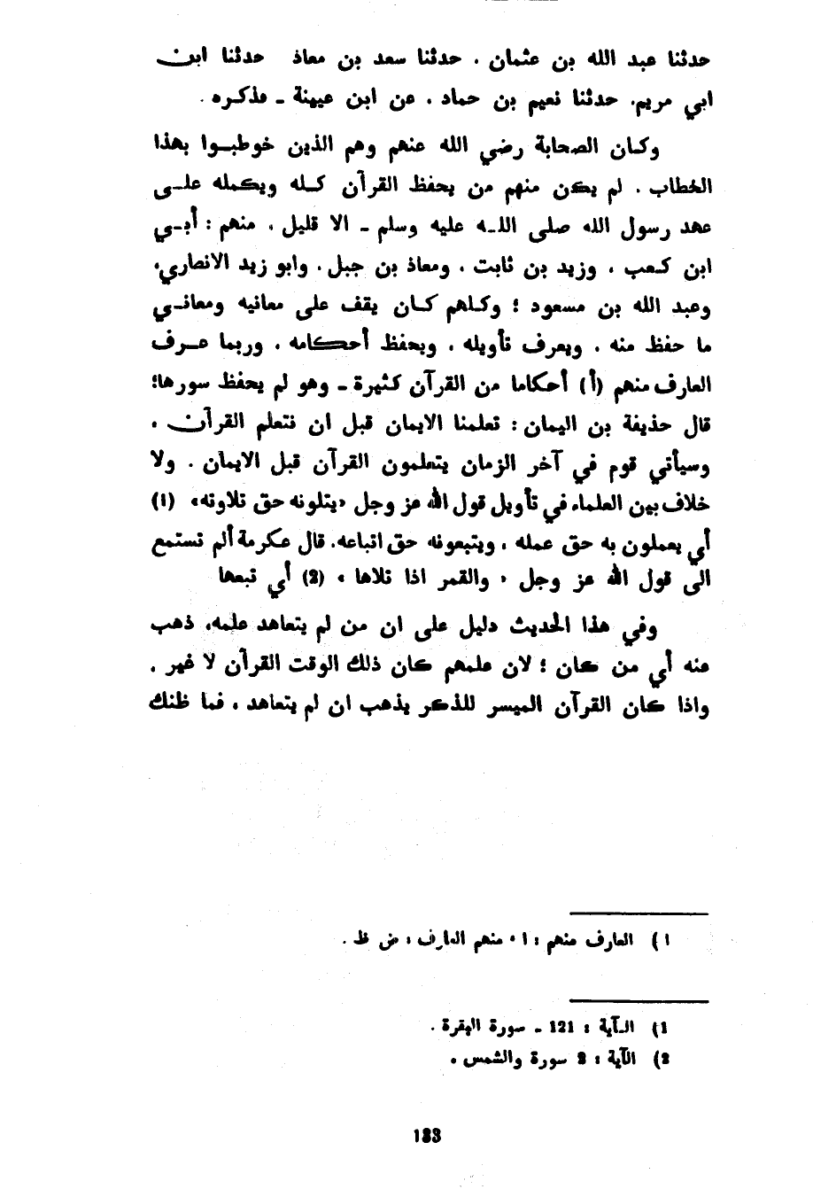 حَدَّثَنَا عَبْدُ اللَّهِ بْنُ عُثْمَانَ حَدَّثَنَا سَعِيدُ بْنُ مُعَاذٍ حَدَّثَنَا ابْنُ أَبِي مَرْيَمَ حَدَّثَنَا نُعَيْمُ بْنُ حَمَّادٍ عَنِ ابْنِ عُيَيْنَةَ فَذَكَرَهُ وَكَانَ الصَّحَابَةُ رَضِيَ اللَّهُ عَنْهُمْ وَهُمُ الَّذِينَ خُوطِبُوا بِهَذَا الْخِطَابِ لَمْ يَكُنْ مِنْهُمْ مَنْ يَحْفَظُ الْقُرْآنَ كُلَّهُ وَيُكْمِلُهُ عَلَى عَهْدِ رَسُولِ اللَّهِ صَلَّى اللَّهُ عَلَيْهِ وَسَلَّمَ إِلَّا قَلِيلٌ مِنْهُمْ أُبَيُّ بْنُ كَعْبٍ وَزَيْدُ بْنُ ثَابِتٍ وَمُعَاذُ بْنُ جَبَلٍ وَأَبُو زَيْدٍ الْأَنْصَارِيُّ وَعَبْدُ اللَّهِ بْنُ مَسْعُودٍ وَكُلُّهُمْ كَانَ يَقِفُ عَلَى مَعَانِيهِ وَمَعَانِي مَا حَفِظَ مِنْهُ وَيَعْرِفُ تَأْوِيلَهُ وَيَحْفَظُ أَحْكَامَهُ وَرُبَّمَا عَرَفَ الْعَارِفُ مِنْهُمْ أَحْكَامًا مِنَ الْقُرْآنِ كَثِيرَةً وَهُوَ لَمْ يَحْفَظْ سُوَرَهَا قَالَ حُذَيْفَةُ بْنُ الْيَمَانِ تَعَلَّمْنَا الْإِيمَانَ قَبْلَ أَنْ نَتَعَلَّمَ الْقُرْآنَ وَسَيَأْتِي قَوْمٌ فِي آخِرِ الزَّمَانِ يَتَعَلَّمُونَ الْقُرْآنَ قَبْلَ الْإِيمَانِ وَلَا خِلَافَ بَيْنِ الْعُلَمَاءُ فِي تَأْوِيلِ قَوْلِ اللَّهِ عَزَّ وَجَلَّ يَتْلُونَهُ حَقَّ تِلَاوَتِهِ أَيْ يَعْمَلُونَ بِهِ حَقَّ عَمَلِهِ وَيَتَّبِعُونَهُ حَقَّ اتِّبَاعِهِ قَالَ عِكْرِمَةُ أَلَمْ تَسْتَمِعْ إِلَى قَوْلِ اللَّهِ عَزَّ وَجَلَّ وَالْقَمَرِ إِذَا تَلَاهَا أَيْ تَبِعَهَا وَفِي هَذَا الْحَدِيثِ دَلِيلٌ عَلَى أَنَّ مَنْ لَمْ يَتَعَاهَدْ علمه ذهب عنه أي مَنْ كَانَ لِأَنَّ عِلْمَهُمْ كَانَ ذَلِكَ الْوَقْتَ الْقُرْآنُ لَا غَيْرَ وَإِذَا كَانَ الْقُرْآنُ الْمُيَسَّرُ لِلذِّكْرِ يَذْهَبُ إِنْ لَمْ يُتَعَاهَدْ فَمَا ظَنُّكُ