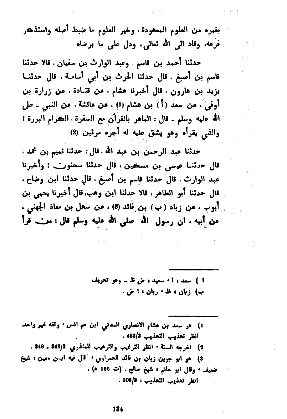 بغيره من العلوم المعهودة وخيرالعلوم مَا ضُبِطَ أَصْلُهُ وَاسْتُذْكِرَ فَرْعُهُ وَقَادَ إِلَى اللَّهِ تَعَالَى وَدَلَّ عَلَى مَا يَرْضَاهُ حَدَّثَنَا أَحْمَدُ بْنُ قَاسِمٍ وَعَبْدُ الْوَارِثِ بْنُ سُفْيَانَ قَالَا حَدَّثَنَا قَاسِمُ بْنُ أَصْبَغَ قَالَ حَدَّثَنَا الْحَرْثُ بْنُ أَبِي أُسَامَةَ قَالَ حَدَّثَنَا يَزِيدُ بْنُ هَارُونَ قَالَ أَخْبَرَنَا هِشَامٌ عَنْ قَتَادَةَ عَنْ زُرَارَةَ بْنِ أَوْفَى عَنْ سَعْدِ بْنِ هِشَامٍ عَنْ عَائِشَةَ عَنِ النَّبِيِّ صَلَّى اللَّهُ عَلَيْهِ وَسَلَّمَ قَالَ الْمَاهِرُ بِالْقُرْآنِ مَعَ السَّفَرَةِ الْكِرَامِ البررة والذي يقرأه وهو يَشُقُّ عَلَيْهِ لَهُ أَجْرُهُ مَرَّتَيْنِ حَدَّثَنَا عَبْدُ الرَّحْمَنِ بْنُ عَبْدِ اللَّهِ قَالَ حَدَّثَنَا تَمِيمُ بْنُ مُحَمَّدٍ قَالَ حَدَّثَنَا عِيسَى بْنُ مِسْكِينٍ قَالَ حَدَّثَنَا سَحْنُونُ وَأَخْبَرَنَا عَبْدُ الْوَارِثِ قَالَ حَدَّثَنَا قَاسِمُ بْنُ أَصْبَغَ قَالَ حَدَّثَنَا ابْنُ وَضَّاحٍ قَالَ حَدَّثَنَا أَبُو الطَّاهِرِ قَالَا حَدَّثَنَا ابْنُ وَهْبٍ قَالَ أَخْبَرَنَا يَحْيَى بْنُ أَيُّوبَ عَنْ زِيَادِ بْنِ فَائِدٍ عَنْ سَهْلِ بْنِ مُعَاذٍ الْجُهَنِيِّ عَنْ أَبِيهِ أَنَّ رَسُولَ اللَّهِ صَلَّى اللَّهُ عَلَيْهِ وَسَلَّمَ قَالَ مَنْ قَرَأَ