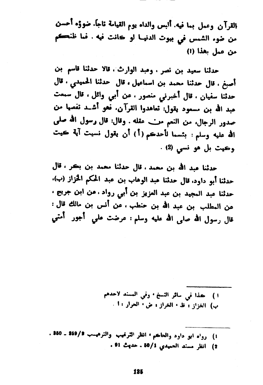 الْقُرْآنَ وَعَمِلَ بِمَا فِيهِ أَلْبَسَ وَالِدَاهُ يَوْمَ الْقِيَامَةِ تَاجًا ضَوْؤُهُ أَحْسَنُ مِنْ ضَوْءِ الشَّمْسِ في بيوت الدُّنْيَا لَوْ كَانَتْ فِيهِ فَمَا ظَنُّكُمْ مَنْ عَمِلَ بِهَذَا حَدَّثَنَا سَعِيدُ بْنُ نَصْرٍ وَعَبْدُ الْوَارِثِ قَالَا حَدَّثَنَا قَاسِمُ بْنُ أَصْبَغَ قَالَ حَدَّثَنَا مُحَمَّدُ بْنُ إِسْمَاعِيلَ قَالَ حَدَّثَنَا الْحُمَيْدِيُّ قَالَ حَدَّثَنَا سُفْيَانُ قَالَ أَخْبَرَنِي مَنْصُورٌ عَنْ أَبِي وَائِلٍ قَالَ سَمِعْتُ عَبْدَ اللَّهِ بْنَ مَسْعُودٍ يَقُولُ تَعَاهَدُوا الْقُرْآنَ فَهُوَ أَشَدُّ تَفَصِّيًا مِنْ صُدُورِ الرِّجَالِ مِنَ النَّعَمِ مِنْ عَقْلِهِ وَقَالَ قَالَ رَسُولُ اللَّهِ صَلَّى اللَّهُ عَلَيْهِ وَسَلَّمَ بِئْسَمَا لِأَحَدِكُمْ أَنْ يَقُولَ نَسِيتُ آيَةَ كَيْتَ وَكَيْتَ بَلْ هُوَ نُسِّيَ حَدَّثَنَا عَبْدُ اللَّهِ بْنُ مُحَمَّدٍ قَالَ حَدَّثَنَا مُحَمَّدُ بْنُ بَكْرٍ قَالَ حَدَّثَنَا أَبُو دَاوُدَ قال حدثنا عَبْدُ الْوَهَّابِ بْنُ عَبْدِ الْحَكَمِ الْخَزَّازُ حَدَّثَنَا عَبْدُ الْمَجِيدِ بْنُ عَبْدِ الْعَزِيزِ بْنِ أَبِي رَوَّادٍ عَنِ ابْنِ جُرَيْجٍ عَنِ الْمُطَّلِبِ بْنِ عَبْدِ اللَّهِ بْنِ حَنْطَبٍ عَنْ أَنَسِ بْنِ مَالِكٍ قَالَ قَالَ رَسُولُ اللَّهِ صَلَّى اللَّهُ عَلَيْهِ وَسَلَّمَ عُرِضَتْ عَلَيَّ أُجُورُ أُمَّتِي