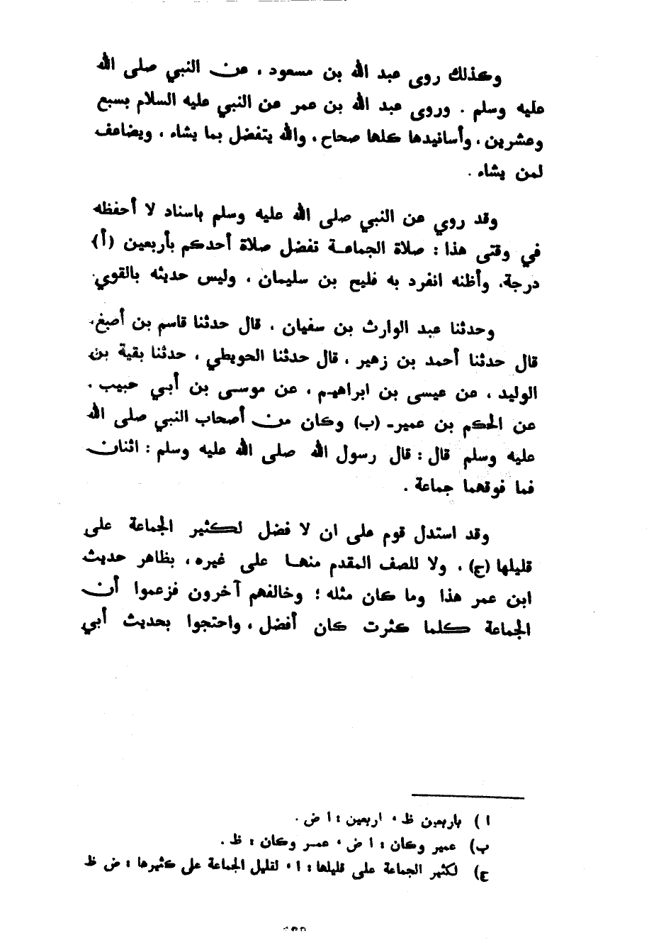 وَكَذَلِكَ رَوَى عَبْدِ اللَّهِ بْنِ مَسْعُودٍ عَنِ النَّبِيِّ صَلَّى اللَّهُ عَلَيْهِ وَسَلَّمَ وَرَى عَبْدُ اللَّهِ بْنُ عُمَرَ عَنِ النَّبِيِّ عَلَيْهِ السَّلَامُ بِسَبْعٍ وَعِشْرِينَ وَأَسَانِيدُهَا كُلُّهَا صِحَاحٌ وَاللَّهُ يَتَفَضَّلُ بِمَا يَشَاءُ وَيُضَاعِفُ لِمَنْ يَشَاءُ وَقَدْ رُوِيَ عَنِ النَّبِيِّ صَلَّى اللَّهُ عَلَيْهِ وَسَلَّمَ بِإِسْنَادٍ لَا أَحْفَظُهُ فِي وَقْتِي هَذَا صَلَاةُ الْجَمَاعَةِ تَفُضُلُ صَلَاةَ أَحَدِكُمْ بِأَرْبَعِينَ دَرَجَةً وَأَظُنُّهُ انْفَرَدَ بِهِ فُلَيْحُ بْنُ سُلَيْمَانَ وَلَيْسَ حَدِيثُهُ بِالْقَوِيِّ وَحَدَّثَنَا عَبْدُ الْوَارِثِ بْنُ سُفْيَانَ قَالَ حَدَّثَنَا قَاسِمُ بْنُ أَصْبَغَ قَالَ حَدَّثَنَا أَحْمَدُ بْنُ زُهَيْرٍ قَالَ حَدَّثَنَا الْحُوَيْطِيُّ حَدَّثَنَا بَقِيَّةُ بْنُ الْوَلِيدِ عَنْ عِيسَى بْنِ إِبْرَاهِيمَ عَنْ مُوسَى بْنِ أَبِي حَبِيبٍ عَنِ الْحَكَمِ بْنِ عُمَيْرٍ وَكَانَ مِنْ أَصْحَابِ النَّبِيِّ صَلَّى اللَّهُ عَلَيْهِ وَسَلَّمَ قَالَ قَالَ رَسُولُ اللَّهِ صَلَّى اللَّهُ عَلَيْهِ وَسَلَّمَ اثْنَانِ فَمَا فَوْقَهُمَا جَمَاعَةٌ وَقَدِ اسْتَدَلَّ قَوْمٌ عَلَى أَنْ لَا فَضْلَ لِكَثِيرِ الْجَمَاعَةِ عَلَى قَلِيلِهَا وَلَا لِلصَّفِّ الْمُقَدَّمِ مِنْهَا عَلَى غَيْرِهِ بِظَاهِرِ حَدِيثُ ابْنِ عُمَرَ هَذَا وَمَا كَانَ مِثْلُهُ وَخَالَفَهُمْ آخَرُونَ فَزَعَمُوا أَنَّ الْجَمَاعَةَ كُلَّمَا كَثُرَتْ كَانَ أَفْضَلَ وَاحْتَجُّوا بِحَدِيثِ أبي