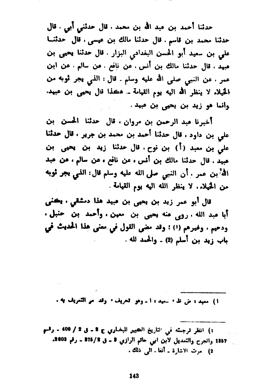حَدَّثَنَا أَحْمَدُ بْنُ عَبْدِ اللَّهِ بْنِ مُحَمَّدِ قَالَ حَدَّثَنِي أَبِي قَالَ حَدَّثَنَا مُحَمَّدُ بْنُ قَاسِمٍ قَالَ حَدَّثَنَا مَالِكُ بْنُ عِيسَى قَالَ حَدَّثَنَا عَلِيُّ بْنُ سَعِيدٍ أَبُو الْحَسَنِ الْبَغْدَادِيُّ الْبَزَّارُ قَالَ حَدَّثَنَا يَحْيَى بْنُ عُبَيْدٍ قَالَ حَدَّثَنَا مَالِكُ بْنُ أَنَسٍ عَنْ نَافِعٍ عَنِ سالم عَنِ ابْنِ عُمَرَ عَنِ النَّبِيِّ صَلَّى اللَّهُ عَلَيْهِ وَسَلَّمَ قَالَ الَّذِي يَجُرُّ ثَوْبَهُ مِنَ الْخُيَلَاءِ لَا يَنْظُرُ اللَّهُ إِلَيْهِ يَوْمَ الْقِيَامَةِ هَكَذَا قَالَ يَحْيَى بْنُ عُبَيْدٍ وَإِنَّمَا هُوَ زَيْدُ بْنُ يَحْيَى بْنِ عُبَيْدٍ أَخْبَرَنَا عَبْدُ الرَّحْمَنِ بْنُ مَرْوَانَ قَالَ حَدَّثَنَا الْحَسَنُ بْنُ عَلِيِّ بْنُ دَاوُدَ قَالَ حَدَّثَنَا أَحْمَدُ بْنُ مُحَمَّدِ بْنِ جَرِيرٍ قَالَ حَدَّثَنَا عَلِيُّ بْنُ مَعْبَدِ بْنِ نُوحٍ قَالَ حَدَّثَنَا زَيْدُ بْنُ يَحْيَى بْنِ عُبَيْدٍ قَالَ حَدَّثَنَا مَالِكُ بْنُ أَنَسٍ عَنْ نَافِعٍ عَنْ سَالِمٍ عَنْ عَبْدِ اللَّهِ بْنِ عُمَرَ أَنَّ النَّبِيَّ صَلَّى اللَّهُ عَلَيْهِ وَسَلَّمَ قَالَ الَّذِي يَجُرُّ ثَوْبَهُ مِنَ الْخُيَلَاءِ لَا يَنْظُرُ اللَّهُ إِلَيْهِ يَوْمَ الْقِيَامَةِ قَالَ أَبُو عُمَرَ زَيْدُ بْنُ يَحْيَى بْنِ عُبَيْدٍ هَذَا دِمَشْقِيٌّ يُكَنَّى أَبَا عَبْدِ اللَّهِ رَوَى عَنْهُ يَحْيَى بْنُ مَعِينٍ وَأَحْمَدُ بْنُ حَنْبَلٍ وَدُحَيْمٌ وَغَيْرُهُمْ وَقَدْ مَضَى الْقَوْلُ فِي مَعْنَى هَذَا الْحَدِيثِ فِي بَابِ زَيْدِ بْنِ أَسْلَمَ وَالْحَمْدُ لِلَّهِ