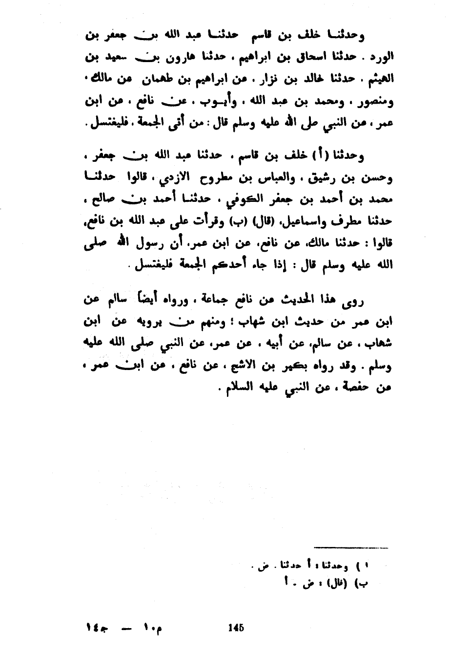وَحَدَّثَنَا خَلَفُ بْنُ قَاسِمٍ حَدَّثَنَا عَبْدُ اللَّهِ بْنُ جَعْفَرِ بْنِ الْوَرْدِ حَدَّثَنَا إِسْحَاقُ بْنُ إِبْرَاهِيمَ حَدَّثَنَا هَارُونُ بْنُ سَعِيدِ بْنِ الْهَيْثَمِ حَدَّثَنَا خَالِدُ بْنُ نِزَارٍ عَنْ إِبْرَاهِيمَ بْنِ طَهْمَانَ عَنْ مَالِكٍ وَمَنْصُورٍ وَمُحَمَّدِ بْنِ عَبْدِ اللَّهِ وَأَيُّوبَ عَنْ نَافِعٍ عَنِ ابْنِ عُمَرَ عَنِ النَّبِيِّ صَلَّى اللَّهُ عَلَيْهِ وَسَلَّمَ قَالَ مَنْ أَتَى الْجُمُعَةَ فَلْيَغْتَسِلْ وَحَدَّثَنَا خَلَفُ بْنُ قَاسِمٍ حَدَّثَنَا عَبْدُ اللَّهِ بْنُ جَعْفَرٍ وَحَسَنُ بْنُ رَشِيقٍ وَالْعَبَّاسُ بْنُ مُطَّرِحٍ الْأَزْدِيُّ قَالُوا حَدَّثَنَا مُحَمَّدُ بْنُ أَحْمَدَ بْنِ جَعْفَرٍ الْكُوفِيُّ حَدَّثَنَا أَحْمَدُ بْنُ صَالِحٍ حَدَّثَنَا مُطَرِّفٌ وَإِسْمَاعِيلُ (قال) (ب) وَقَرَأْتُ عَلَى عَبْدِ اللَّهِ بْنُ نَافِعٍ قَالُوا حَدَّثَنَا مَالِكٍ عَنْ نَافِعٍ عَنِ ابْنِ عُمَرَ أَنَّ رَسُولَ اللَّهِ صلى الله عليه وسلم قَالَ إِذَا جَاءَ أَحَدُكُمُ الْجُمُعَةَ فَلْيَغْتَسِلْ رَوَى هَذَا الْحَدِيثَ عَنْ نَافِعٍ جَمَاعَةٌ وَرَوَاهُ أَيْضًا سَالِمٌ عَنِ ابْنِ عُمَرَ مِنْ حَدِيثِ ابْنِ شِهَابٍ وَمِنْهُمْ مَنْ يَرْوِيهِ عَنِ ابْنِ شِهَابٍ عَنْ سَالِمٍ عَنْ أَبِيهِ عَنْ عُمَرَ عَنِ النَّبِيِّ صَلَّى اللَّهُ عَلَيْهِ وَسَلَّمَ وَقَدْ رَوَاهُ بُكَيْرُ بْنُ الْأَشَجِّ عَنْ نَافِعٍ عَنِ ابْنِ عُمَرَ عَنْ حَفْصَةَ عَنِ النَّبِيِّ عَلَيْهِ السَّلَامُ