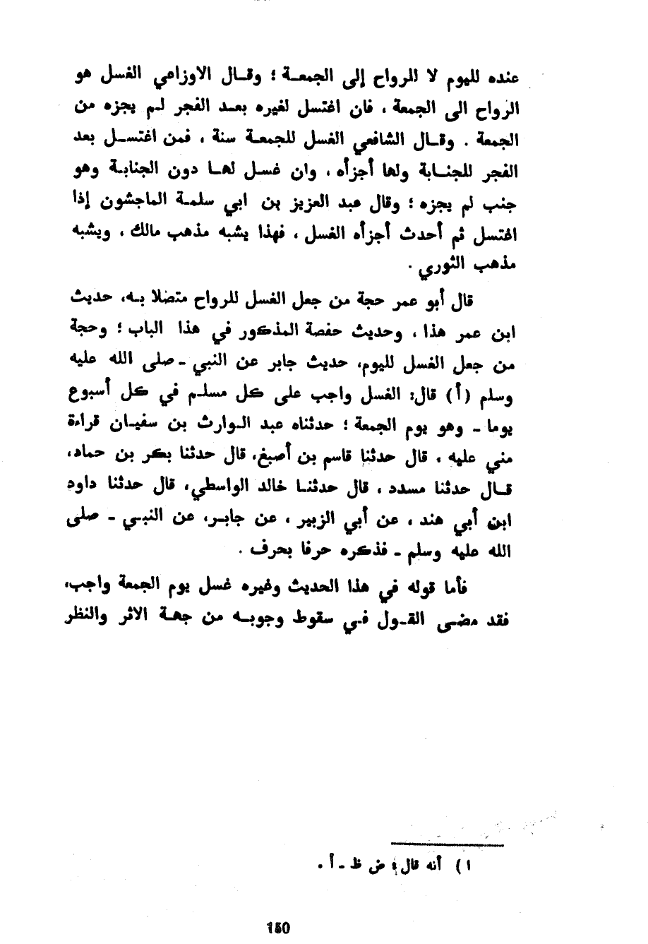 عِنْدَهُ لِلْيَوْمِ لَا لِلرَّوَاحِ إِلَى الْجُمُعَةِ وَقَالَ الْأَوْزَاعِيُّ الْغُسْلُ هُوَ الرَّوَاحُ إِلَى الْجُمُعَةِ فَإِنِ اغْتَسَلَ لِغَيْرِهِ بَعْدَ الْفَجْرِ لَمْ يُجْزِهِ مِنَ الْجُمُعَةِ وَقَالَ الشَّافِعِيُّ الْغُسْلُ لِلْجُمُعَةِ سُنَّةٌ فَمَنِ اغْتَسَلَ بَعْدَ الْفَجْرِ لِلْجَنَابَةِ وَلَهَا أَجْزَأَهُ وَإِنْ غَسَلَ لَهَا دُونَ الْجَنَابَةِ وَهُوَ جُنُبٌ لَمْ يُجْزِهِ وَقَالَ عَبْدُ الْعَزِيزِ بْنُ أَبِي سَلَمَةَ الْمَاجِشُونُ وَإِذَا اغْتَسَلَ ثُمَّ أَحْدَثَ أَجْزَأَهُ الْغُسْلُ فَهَذَا يُشْبِهُ مَذْهَبَ مَالِكٍ وَيُشْبِهُ مَذْهَبَ الثَّوْرِيِّ قَالَ أَبُو عُمَرَ حُجَّةُ مَنْ جَعَلَ الْغُسْلَ لِلرَّوَاحِ مُتَّصِلًا بِهِ حَدِيثُ ابْنِ عُمَرَ هَذَا وَحَدِيثُ حَفْصَةَ الْمَذْكُورُ فِي هَذَا الْبَابِ وَحُجَّةُ مَنْ جَعَلَ الْغُسْلَ لِلْيَوْمِ حَدِيثُ جَابِرٍ عَنِ النَّبِيِّ صَلَّى اللَّهُ عَلَيْهِ وَسَلَّمَ قَالَ الْغُسْلُ وَاجِبٌ عَلَى كُلِّ مُسْلِمٍ فِي كُلِّ أُسْبُوعٍ يَوْمًا وَهُوَ يَوْمُ الْجُمُعَةِ حَدَّثَنَاهُ عَبْدُ الْوَارِثِ بْنُ سُفْيَانَ قِرَاءَةً مِنِّي عَلَيْهِ قَالَ حَدَّثَنَا قَاسِمُ بْنُ أَصْبَغَ قَالَ حَدَّثَنَا بَكْرُ بْنُ حَمَّادٍ قَالَ حَدَّثَنَا مُسَدَّدٌ قَالَ حَدَّثَنَا خَالِدٌ الْوَاسِطِيُّ قَالَ حَدَّثَنَا دَاوُدُ بْنُ أَبِي هِنْدٍ عَنْ أَبِي الزُّبَيْرِ عَنْ جَابِرٍ عَنِ النَّبِيِّ صَلَّى اللَّهُ عَلَيْهِ وَسَلَّمَ فَذَكرَهُ حَرْفًا بِحَرْفٍ فَأَمَّا قَوْلُهُ فِي هَذَا الْحَدِيثِ وَغَيْرِهِ غُسْلُ يَوْمِ الْجُمُعَةِ وَاجِبٌ فَقَدْ مَضَى الْقَوْلُ فِي سُقُوطِ وُجُوبِهِ مِنْ جِهَةِ الْأَثَرِ وَالنَّظَرِ