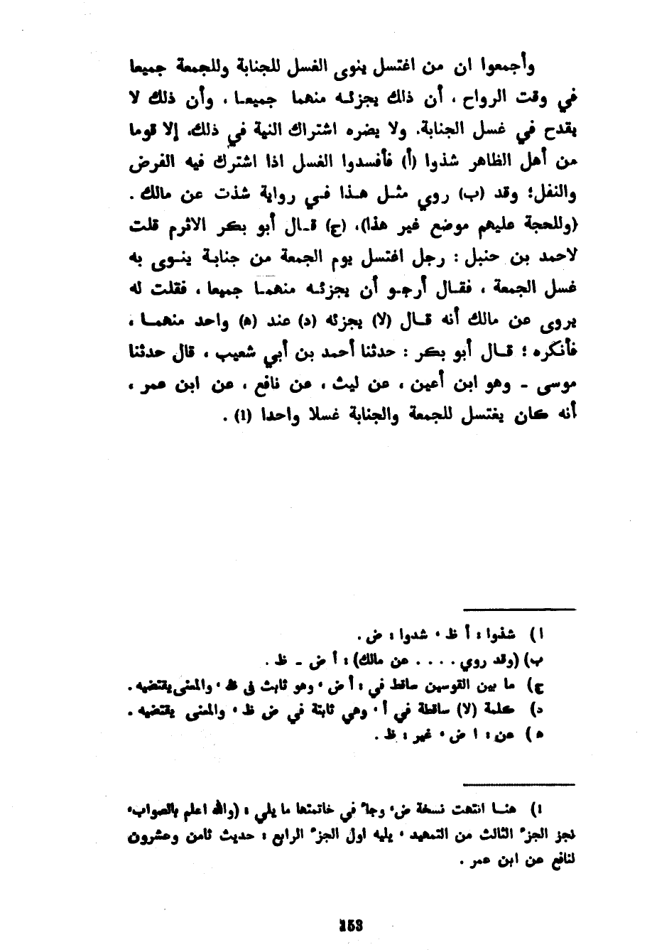 وَأَجْمَعُوا أَنَّ مَنِ اغْتَسَلَ يَنْوِي الْغُسْلَ لِلْجَنَابَةِ وَلِلْجُمُعَةِ جَمِيعًا فِي وَقْتِ الرَّوَاحِ أَنَّ ذَلِكَ يُجْزِئُهُ مِنْهُمَا جَمِيعًا وَأَنَّ ذَلِكَ لَا يَقْدَحُ فِي غُسْلِ الْجَنَابَةِ وَلَا يَضُرُّهُ اشْتِرَاكُ النِّيَّةِ فِي ذَلِكَ إِلَّا قَوْمًا مِنْ أَهْلِ الظَّاهِرِ شَذُّوا فَأَفْسَدُوا الْغُسْلَ إِذَا اشْتَرَكَ فِيهِ الْفَرْضُ وَالنَّفْلُ وَقَدْ رُوِيَ مِثْلُ هَذَا فِي رِوَايَةٍ شَذَّتْ عَنْ مَالِكٍ (وَلِلْحُجَّةِ عَلَيْهِمْ مَوْضِعٌ غَيْرُ هذا) (ج) قَالَ أَبُو بَكْرٍ الْأَثْرَمُ قُلْتُ لِأَحْمَدَ بْنِ حَنْبَلٍ رَجُلٌ اغْتَسَلَ يَوْمَ الْجُمُعَةِ مِنْ جَنَابَةٍ يَنْوِي بِهِ غُسْلَ الْجُمُعَةِ فَقَالَ أَرْجُو أَنْ يُجْزِئَهُ مِنْهُمَا جَمِيعًا فَقُلْتُ لَهُ يُرْوَى عَنْ مالك أنه قال (لا) يجزئه عند (هـ) وَاحِدٍ مِنْهُمَا فَأَنْكَرَهُ قَالَ أَبُو بَكْرٍ حَدَّثَنَا أَحْمَدُ بْنُ أَبِي شُعَيْبٍ قَالَ حَدَّثَنَا مُوسَى وَهُوَ ابْنُ أَعْيُنٍ عَنْ لَيْثٍ عَنْ نَافِعٍ عَنِ ابْنِ عُمَرَ أَنَّهُ كَانَ يَغْتَسِلُ لِلْجُمُعَةِ وَالْجَنَابَةِ غُسْلًا وَاحِدًا