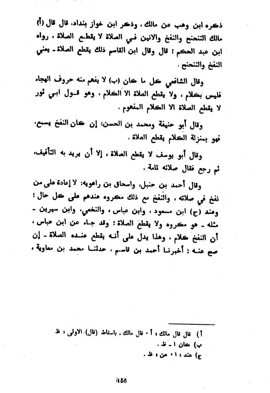 ذَكَرَهُ ابْنُ وَهْبٍ عَنْ مَالِكٍ وَذَكَرَ ابْنُ خواز بنداد قَالَ قَالَ مَالِكٌ التَّنَحْنُحُ وَالنَّفْخُ وَالْأَنِينُ فِي الصلاة لا يقطع الصلاة ورواه ابْنُ عَبْدِ الْحَكَمِ قَالَ وَقَالَ ابْنُ الْقَاسِمِ ذَلِكَ يَقْطَعُ الصَّلَاةَ يَعْنِي النَّفْخَ وَالتَّنَحْنُحَ وَقَالَ الشَّافِعِيُّ كُلُّ مَا كَانَ لَا يُفْهَمُ مِنْهُ حُرُوفُ الْهِجَاءِ فَلَيْسَ بِكَلَامٍ وَلَا يَقْطَعُ الصَّلَاةَ إِلَّا الْكَلَامُ وَهُوَ قَوْلُ أَبِي ثَوْرٍ لَا يَقْطَعُ الصَّلَاةَ إِلَّا الْكَلَامُ الْمَفْهُومُ وَقَالَ أَبُو حَنِيفَةَ وَمُحَمَّدُ بْنُ الْحَسَنِ إِنْ كَانَ النَّفْخُ يُسْمَعُ فَهُوَ بِمَنْزِلَةِ الْكَلَامِ يَقْطَعُ الصَّلَاةَ وَقَالَ أَبُو يُوسُفَ لَا يَقْطَعُ الصَّلَاةَ إِلَّا أَنْ يُرِيدَ بِهِ التَّأْفِيفَ ثُمَّ رَجَعَ فَقَالَ صِلَاتُهُ تَامَّةٌ وَقَالَ أَحْمَدُ بْنُ حَنْبَلٍ وَإِسْحَاقُ بْنُ رَاهَوَيْهِ لَا إِعَادَةَ عَلَى مَنْ نَفَخَ فِي صِلَاتِهِ وَالنَّفْخُ مَعَ ذَلِكَ مَكْرُوهٌ عِنْدَهُمْ عَلَى كُلِّ حَالٍ وَعِنْدَ ابْنِ مَسْعُودٍ وَابْنِ عَبَّاسٍ وَالنُّخَعِيِّ وَابْنِ سِيرِينَ مِثْلُهُ هُوَ مَكْرُوهٌ وَلَا يَقْطَعُ الصَّلَاةَ وَقَدْ جَاءَ عَنِ ابْنِ عَبَّاسٍ أَنَّ النَّفْخَ كَلَامٌ وَهَذَا يَدُلُّ عَلَى أَنَّهُ يقطع عند الصَّلَاةَ إِنْ صَحَّ عَنْهُ أَخْبَرَنَا أَحْمَدُ بْنُ قَاسِمٍ حَدَّثَنَا مُحَمَّدُ بْنُ مُعَاوِيَةَ