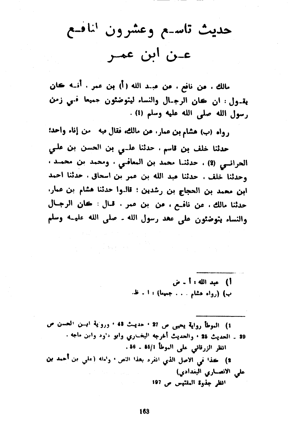 حَدِيثٌ تَاسِعٌ وَعِشْرُونَ لِنَافِعٍ عَنِ ابْنِ عُمَرَ مَالِكٌ عَنْ نَافِعٍ عَنْ عَبْدِ اللَّهِ بْنِ عُمَرَ أَنَّهُ كَانَ يَقُولُ إِنْ كَانَ الرِّجَالُ وَالنِّسَاءُ لَيَتَوَضَّئُونَ جَمِيعًا فِي زَمَنِ رَسُولِ اللَّهِ صَلَّى اللَّهُ عَلَيْهِ وَسَلَّمَ رَوَاهُ هِشَامُ بْنُ عَمَّارٍ عَنْ مَالِكٍ فَقَالَ فِيهِ مِنْ إِنَاءٍ وَاحِدٍ حَدَّثَنَا خَلَفُ بْنُ قَاسِمٍ حَدَّثَنَا عَلِيُّ بْنُ الْحَسَنِ بْنِ عَلِيٍّ الْحَرَّانِيُّ حَدَّثَنَا مُحَمَّدُ بْنُ الْمُعَافِيُّ وَمُحَمَّدُ بْنُ مُحَمَّدٍ وَحَدَّثَنَا خَلَفٌ حَدَّثَنَا عَبْدُ اللَّهِ بْنُ عُمَرَ بْنِ إِسْحَاقَ حَدَّثَنَا أَحْمَدُ بْنُ مُحَمَّدِ بْنِ الْحَجَّاجِ بْنِ رِشْدِينَ قَالُوا حَدَّثَنَا هِشَامُ بْنُ عَمَّارٍ حَدَّثَنَا مَالِكُ عَنْ نَافِعٍ عَنِ ابْنِ عُمَرَ قَالَ كَانَ الرِّجَالُ وَالنِّسَاءُ يَتَوَضَّئُونَ عَلَى عَهْدِ رَسُولِ اللَّهِ صَلَّى اللَّهُ عَلَيْهِ وَسَلَّمَ