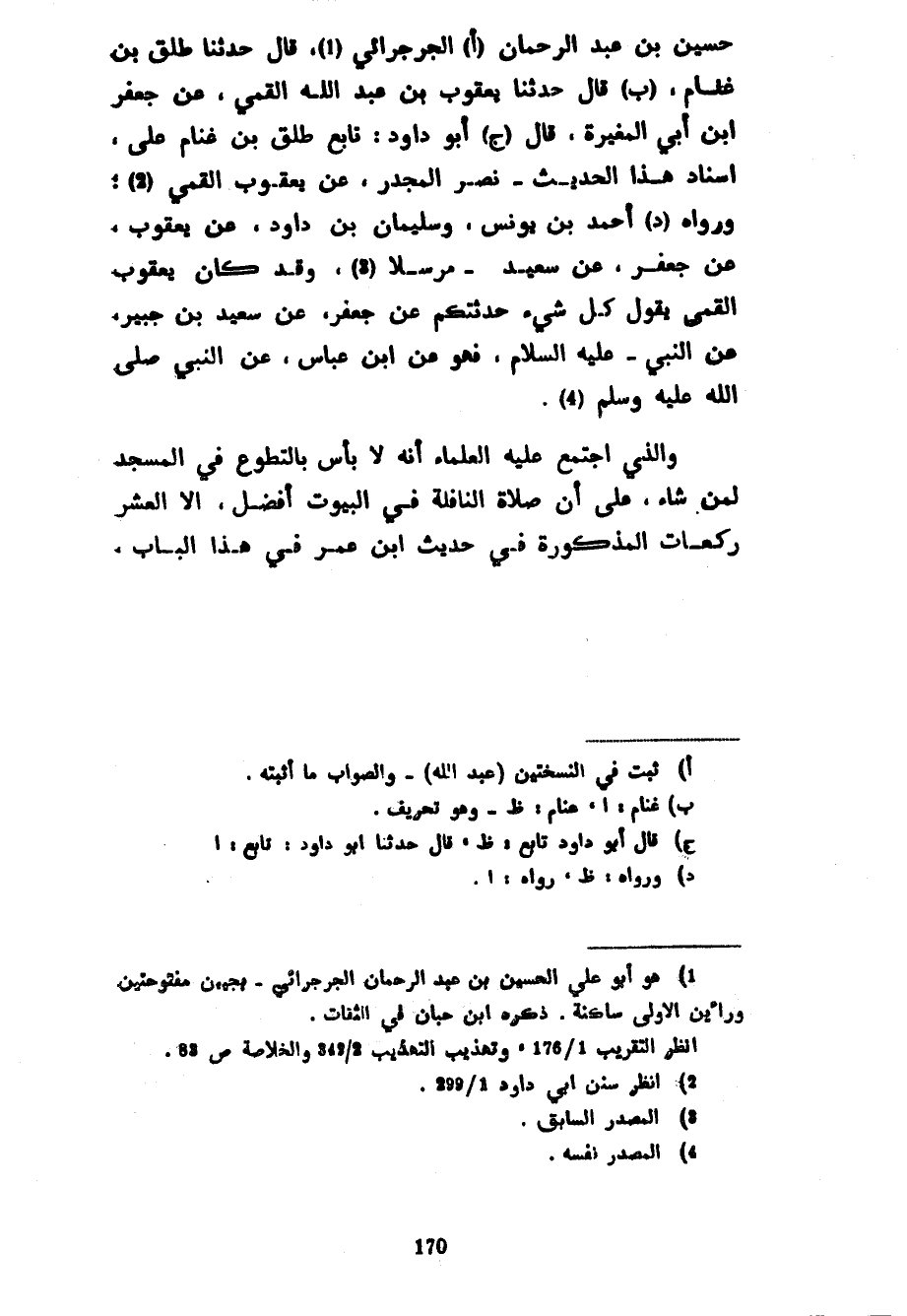حسين بن عبد الرحمان الْجَرْجَرَائِيُّ قَالَ حَدَّثَنَا طَلْقُ بْنُ غَنَّامٍ قَالَ حدثا يَعْقُوبُ بْنُ عَبْدِ اللَّهِ الْقُمِّيُّ عَنْ جَعْفَرِ بْنِ أَبِي الْمُغِيرَةِ قَالَ أَبُو دَاوُدَ تَابَعَ طَلْقَ بْنَ غَنَّامٍ عَلَى إِسْنَادِ هَذَا الْحَدِيثِ نصر المجدر عن يعقوب الْقُمِّيِّ وَرَوَاهُ أَحْمَدُ بْنُ يُونُسَ وَسُلَيْمَانُ بْنُ دَاوُدَ عَنْ يَعْقُوبَ عَنْ جَعْفَرٍ عَنْ سَعِيدٍ مرسلا وقد كان يعقوب الْقُمِّيُّ يَقُولُ كُلُّ شَيْءٍ حَدَّثْتُكُمْ عَنْ جَعْفَرٍ عَنْ سَعِيدِ بْنِ جُبَيْرٍ عَنِ النَّبِيِّ عَلَيْهِ السَّلَامُ فَهُوَ عَنِ ابْنِ عَبَّاسٍ عَنِ النَّبِيِّ صَلَّى اللَّهُ عَلَيْهِ وَسَلَّمَ وَالَّذِي اجْتَمَعَ عَلَيْهِ الْعُلَمَاءُ أَنَّهُ لَا بَأْسَ بِالتَّطَوُّعِ فِي الْمَسْجِدِ لِمَنْ شَاءَ عَلَى أَنَّ صَلَاةَ النَّافِلَةِ فِي الْبُيُوتِ أَفْضَلُ إِلَّا الْعَشْرَ رَكَعَاتِ الْمَذْكُورَةَ فِي حَدِيثِ ابْنِ عُمَرَ فِي هَذَا الْبَابِ