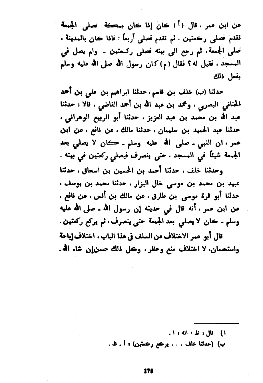 عن ابن عمر قال كَانَ إِذَا كَانَ بِمَكَّةَ فَصَلَّى الْجُمُعَةَ تَقَدَّمَ فَصَلَّى رَكْعَتَيْنِ ثُمَّ تَقَدَّمَ فَصَلَّى أَرْبَعًا فَإِذَا كَانَ بِالْمَدِينَةِ صَلَّى الْجُمُعَةَ ثُمَّ رَجَعَ إِلَى بَيْتِهِ فَصَلَّى رَكْعَتَيْنِ وَلَمْ يُصَلِّ فِي الْمَسْجِدِ فَقِيلَ لَهُ فَقَالَ كَانَ رَسُولُ اللَّهِ صَلَّى اللَّهُ عَلَيْهِ وَسَلَّمَ يَفْعَلُ ذَلِكَ حَدَّثَنَا خَلَفُ بْنُ قَاسِمٍ حَدَّثَنَا إِبْرَاهِيمُ بْنُ عَلِيِّ بْنِ أَحْمَدَ الْحَنَّانِيُّ الْبَصْرِيُّ وَمُحَمَّدُ بْنُ عَبْدِ اللَّهِ بْنِ أَحْمَدَ الْقَاضِي قَالَا حَدَّثَنَا عَبْدُ اللَّهِ بْنُ مُحَمَّدِ بْنِ عَبْدِ الْعَزِيزِ حَدَّثَنَا الرَّبِيعُ الْوَهْرَانِيُّ حَدَّثَنَا عَبْدُ الْحَمِيدِ بْنُ سُلَيْمَانَ حَدَّثَنَا مَالِكٍ عَنْ نَافِعٍ عَنِ ابْنِ عُمَرَ أَنَّ النَّبِيَّ صَلَّى اللَّهُ عَلَيْهِ وَسَلَّمَ كَانَ لَا يُصَلِّي بَعْدَ الْجُمُعَةِ شَيْئًا فِي الْمَسْجِدِ حَتَّى يَنْصَرِفَ فَيُصَلِّيَ رَكْعَتَيْنِ فِي بَيْتِهِ وَحَدَّثَنَا خَلَفٌ حَدَّثَنَا أَحْمَدُ بْنُ الْحُسَيْنِ بْنِ إِسْحَاقَ حَدَّثَنَا عُبَيْدُ بْنُ مُحَمَّدِ بْنِ مُوسَى خَالُ الْبَزَّارِ حَدَّثَنَا مُحَمَّدُ بْنُ يُوسُفَ حَدَّثَنَا أَبُو قُرَّةَ مُوسَى بْنِ طَارِقٍ عَنْ مَالِكِ بْنُ أَنَسٍ عَنْ نَافِعٍ عَنِ ابْنِ عُمَرَ أَنَّهُ قَالَ فِي حَدِيثِهِ أَنَّ رَسُولَ اللَّهِ صَلَّى اللَّهُ عليه وسلم كان لا يصلي بعد الجمعة حَتَّى يَنْصَرِفَ ثُمَّ يَرْكَعَ رَكْعَتَيْنِ قَالَ أَبُو عُمَرَ الِاخْتِلَافُ عَنِ السَّلَفِ فِي هَذَا الْبَابِ اخْتِلَافُ إِبَاحَةٍ وَاسْتِحْسَانٍ لَا اخْتِلَافَ مَنْعٍ وَحَظْرٍ وَكُلُّ ذَلِكَ حَسَنٌ إِنْ شَاءَ اللَّهُ