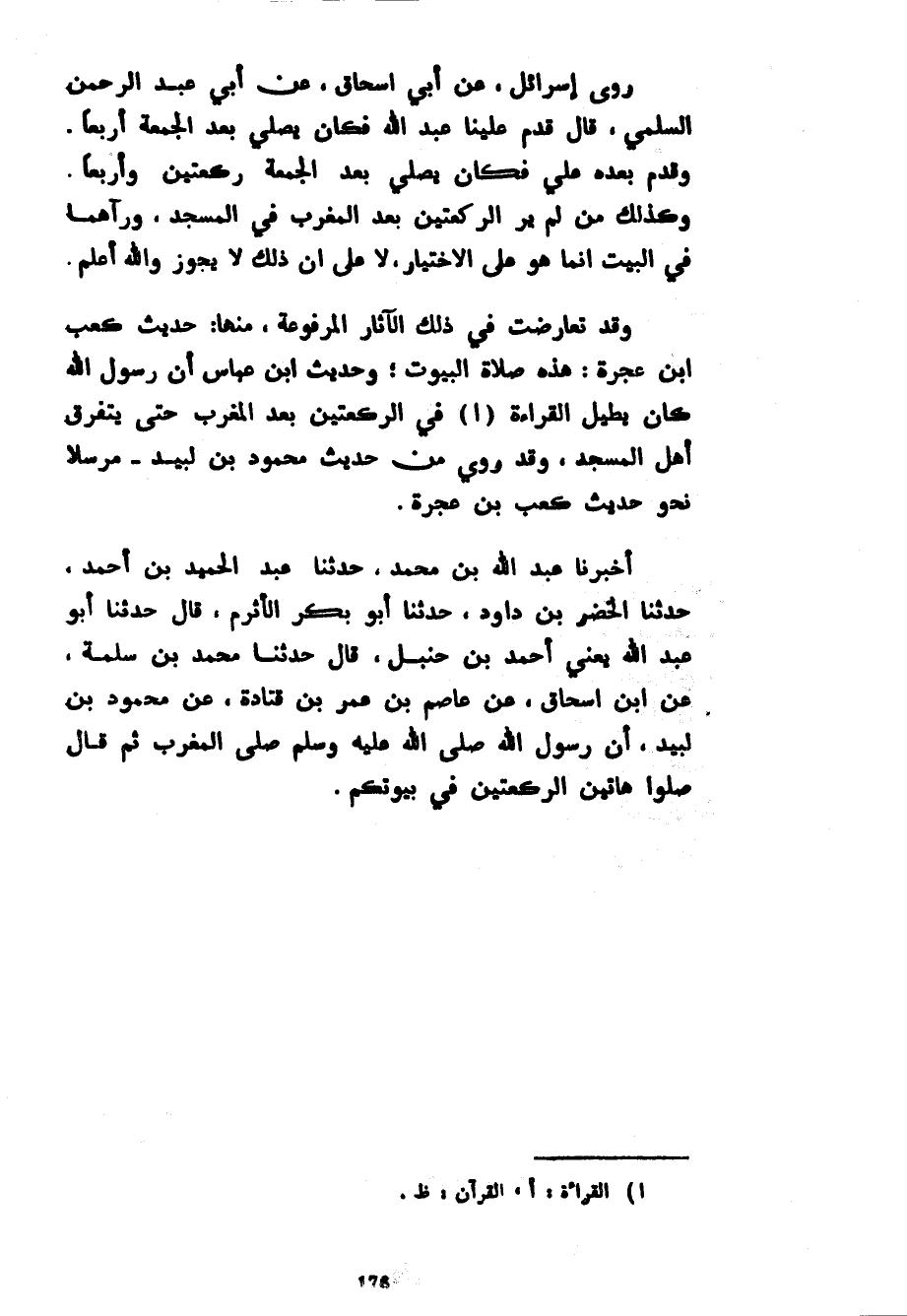 رَوَى إِسْرَائِيلُ عَنْ أَبِي إِسْحَاقَ عَنْ أَبِي عَبْدِ الرَّحْمَنِ السُّلَمِيِّ قَالَ قَدِمَ عَلَيْنَا عَبْدُ اللَّهِ فَكَانَ يُصَلِّي بَعْدَ الْجُمُعَةِ أَرْبَعًا وَقَدِمَ بَعْدَهُ عَلِيٌّ فَكَانَ يُصَلِّي بَعْدَ الْجُمُعَةِ رَكْعَتَيْنِ وَأَرْبَعًا وَكَذَلِكَ مَنْ لَمْ يَرَ الرَّكْعَتَيْنِ بَعْدَ الْمَغْرِبِ فِي الْمَسْجِدِ وَرَآهُمَا فِي الْبَيْتِ إِنَّمَا هُوَ عَلَى الِاخْتِيَارِ لَا عَلَى أَنَّ ذَلِكَ لَا يَجُوزُ وَاللَّهُ أَعْلَمُ وَقَدْ تَعَارَضَتْ فِي ذَلِكَ الْآثَارُ الْمَرْفُوعَةُ مِنْهَا حَدِيثُ كَعْبِ بْنِ عُجْرَةَ هَذِهِ صَلَاةُ الْبُيُوتِ وَحَدِيثُ ابْنِ عَبَّاسٍ أَنَّ رَسُولَ اللَّهِ كَانَ يُطِيلُ الْقِرَاءَةَ فِي الرَّكْعَتَيْنِ بَعْدَ الْمَغْرِبِ حَتَّى يَتَفَرَّقَ أَهْلُ الْمَسْجِدِ وَقَدْ رُوِيَ مِنْ حَدِيثِ مَحْمُودِ بْنِ لَبِيدٍ مُرْسَلًا نَحْوَ حَدِيثِ كَعْبِ بْنِ عُجْرَةَ أَخْبَرَنَا عَبْدُ اللَّهِ بْنُ مُحَمَّدٍ حَدَّثَنَا عَبْدُ الْحَمِيدِ بْنُ أَحْمَدَ حَدَّثَنَا الْخَضِرُ بْنُ دَاوُدَ حَدَّثَنَا أَبُو بَكْرٍ الْأَثْرَمُ قَالَ حَدَّثَنَا أَبُو عَبْدِ اللَّهِ يَعْنِي أَحْمَدُ بْنُ حَنْبَلٍ قَالَ حَدَّثَنَا مُحَمَّدُ بْنُ سَلَمَةَ عَنِ ابْنِ إِسْحَاقَ عَنْ عَاصِمُ بْنُ عُمَرَ بْنِ قَتَادَةَ عَنْ مَحْمُودِ بْنِ لَبِيدٍ أَنَّ رَسُولَ اللَّهِ صَلَّى اللَّهُ عَلَيْهِ وَسَلَّمَ صَلَّى الْمَغْرِبَ ثُمَّ قَالَ صَلُّوا هَاتَيْنِ الرَّكْعَتَيْنِ فِي بُيُوتِكُمْ