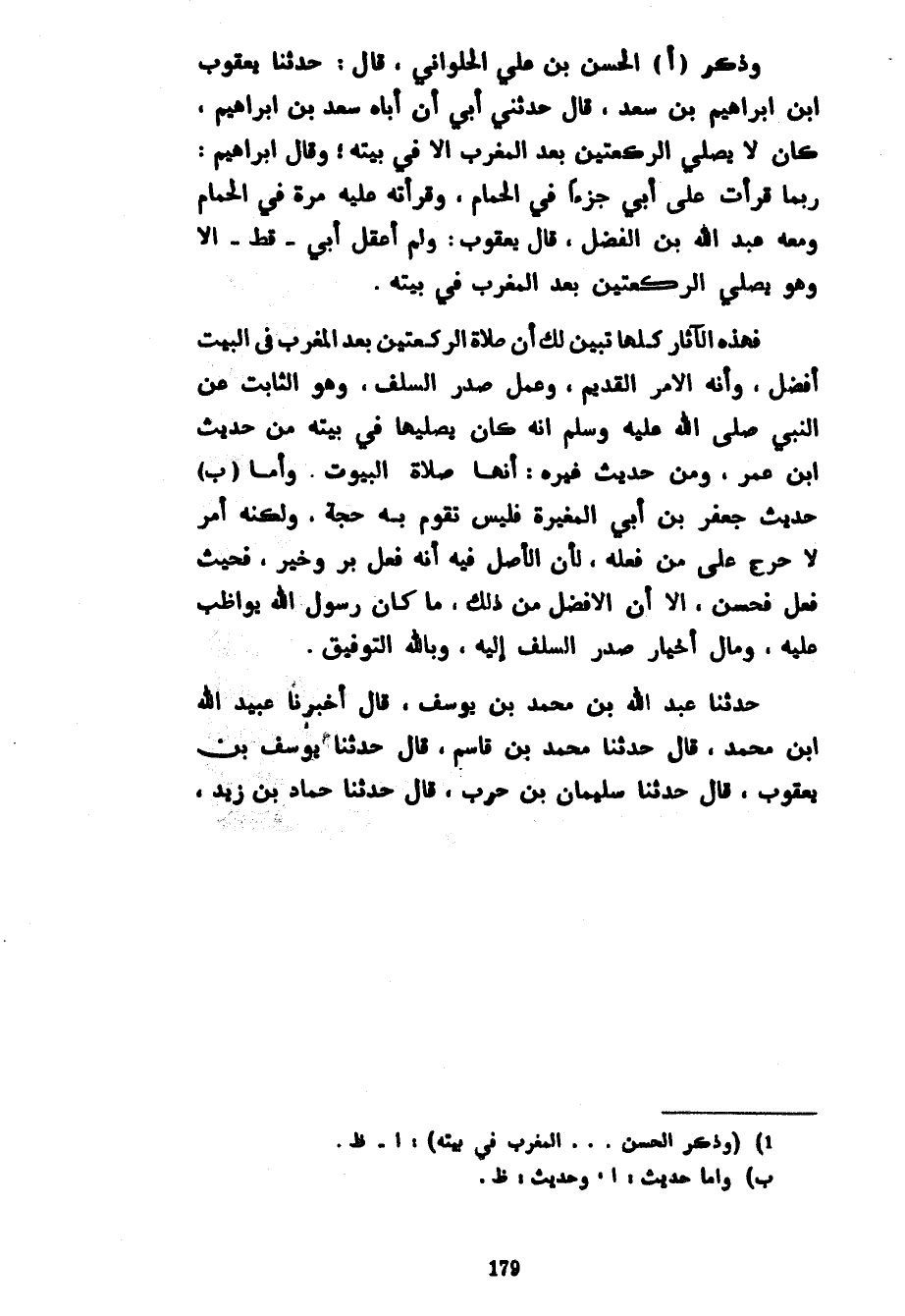 وَذَكَرَ الْحَسَنُ بْنُ عَلِيٍّ الْحُلْوَانِيُّ قَالَ حَدَّثَنَا يَعْقُوبُ بْنُ إِبْرَاهِيمَ بْنِ سَعْدٍ قَالَ حَدَّثَنِي أَبِي أَنَّ أَبَاهُ سَعْدَ بْنَ إِبْرَاهِيمَ كَانَ لَا يُصَلِّي الرَّكْعَتَيْنِ بَعْدَ الْمَغْرِبِ إِلَّا فِي بَيْتِهِ وَقَالَ إِبْرَاهِيمُ رُبَّمَا قَرَأْتُ عَلَى أَبِي جُزْءًا فِي الْحَمَّامِ وَقَرَأْتُهُ عَلَيْهِ مَرَّةً فِي الْحَمَّامِ وَمَعَهُ عَبْدُ اللَّهِ بْنُ الْفَضْلِ قَالَ يَعْقُوبُ وَلَمْ أَعْقِلْ أَبِي قَطُّ إِلَّا وَهُوَ يُصَلِّي الرَّكْعَتَيْنِ بَعْدَ الْمَغْرِبِ فِي بَيْتِهِ فَهَذِهِ الْآثَارُ كُلُّهَا تُبَيِّنُ لَكَ أَنَّ صَلَاةَ الرَّكْعَتَيْنِ بَعْدَ الْمَغْرِبِ فِي الْبَيْتِ أَفْضَلُ وَأَنَّهُ الْأَمْرُ الْقَدِيمُ وَعَمَلُ صَدْرِ السَّلَفِ وَهُوَ الثَّابِتُ عَنِ النَّبِيِّ صَلَّى اللَّهُ عَلَيْهِ وَسَلَّمَ أَنَّهُ كَانَ يُصَلِّيهَا فِي بَيْتِهِ مِنْ حَدِيثِ ابْنِ عُمَرَ وَمِنْ حَدِيثِ غَيْرِهِ أَنَّهَا صَلَاةُ الْبُيُوتِ وَأَمَّا حَدِيثُ جَعْفَرِ بْنِ أَبِي الْمُغِيرَةِ فَلَيْسَ تَقُومُ بِهِ حُجَّةٌ وَلَكِنَّهُ أَمْرٌ لَا حَرَجَ عَلَى مَنْ فَعَلَهُ لِأَنَّ الْأَصْلَ فِيهِ أَنَّهُ فِعْلُ بِرٍّ وَخَيْرٍ فَحَيْثُ فَعَلَ فَحَسُنٌ إِلَّا أَنَّ الْأَفْضَلَ مِنْ ذَلِكَ مَا كَانَ رَسُولُ اللَّهِ يُوَاظِبُ عَلَيْهِ وَمَالَ أَخْيَارُ صَدْرِ السَّلَفِ إِلَيْهِ وَبِاللَّهِ التَّوْفِيقُ حَدَّثَنَا عَبْدُ اللَّهِ بْنُ مُحَمَّدٍ بْنِ يُوسُفَ قَالَ أَخْبَرَنَا عُبَيْدُ اللَّهِ بْنُ مُحَمَّدٍ قَالَ حَدَّثَنَا مُحَمَّدُ بْنُ قَاسِمٍ قَالَ حَدَّثَنَا يُوسُفُ بْنُ يَعْقُوبَ قَالَ حَدَّثَنَا سُلَيْمَانُ بْنُ حَرْبٍ قَالَ حَدَّثَنَا حَمَّادُ بْنُ زَيْدٍ