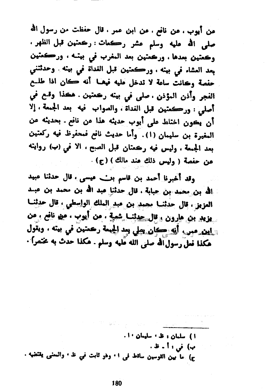 عَنْ أَيُّوبَ عَنْ نَافِعٍ عَنِ ابْنِ عُمَرَ قَالَ حَفِظْتَ مِنْ رَسُولِ اللَّهِ صَلَّى اللَّهُ عَلَيْهِ وَسَلَّمَ عَشْرَ رَكَعَاتٍ رَكْعَتَيْنِ قَبْلَ الظُّهْرِ وَرَكْعَتَيْنِ بَعْدَهَا وَرَكْعَتَيْنِ بَعْدَ الْمَغْرِبِ فِي بَيْتِهِ وَرَكْعَتَيْنِ بَعْدَ الْعِشَاءِ فِي بَيْتِهِ وَرَكْعَتَيْنِ قَبْلَ الْغَدَاةِ فِي بَيْتِهِ وَحَدَّثَتْنِي حَفْصَةُ وَكَانَتْ سَاعَةً لَا تَدْخُلُ عَلَيْهِ فِيهَا أَنَّهُ كَانَ إِذَا طَلَعَ الْفَجْرُ وَأَذَّنَ الْمُؤَذِّنُ صَلَّى فِي بَيْتِهِ رَكْعَتَيْنِ هَكَذَا وَقَعَ فِي أَصْلِي وَرَكْعَتَيْنِ قَبْلَ الْغَدَاةِ وَالصَّوَابُ فِيهِ بَعْدَ الْجُمُعَةِ إِلَّا أَنَّ يَكُونَ اخْتَلِطَ عَلَى أَيُّوبَ حَدِيثُهُ هَذَا عَنْ نَافِعٍ بِحَدِيثِهِ عَنِ الْمُغِيرَةِ بْنِ سُلَيْمَانَ وَأَمَّا حَدِيثُ نَافِعٍ فَمَحْفُوظٌ فِيهِ رَكْعَتَيْنِ بَعْدَ الْجُمُعَةِ وَلَيْسَ فِيهِ رَكْعَتَانِ قَبْلَ الصُّبْحِ إِلَّا فِي رِوَايَتِهِ عَنْ حَفْصَةَ (وَلَيْسَ ذَلِكَ عِنْدَ مَالِكٍ) (ج) وَقَدْ أَخْبَرَنَا أَحْمَدُ بْنُ قَاسِمِ بْنِ عِيسَى قَالَ حَدَّثَنَا عُبَيْدُ اللَّهِ بْنُ مُحَمَّدِ بْنِ حَبَابَةَ قَالَ حَدَّثَنَا عَبْدُ اللَّهِ بْنُ مُحَمَّدِ بْنِ عَبْدِ الْعَزِيزِ قَالَ حَدَّثَنَا مُحَمَّدُ بْنُ عَبْدِ الْمَلِكِ الْوَاسِطِيُّ قَالَ حَدَّثَنَا يَزِيدُ بْنُ هَارُونَ قَالَ حَدَّثَنَا شُعْبَةُ عَنْ أَيُّوبَ عَنْ نَافِعٍ عَنِ ابْنِ عُمَرَ أَنَّهُ كَانَ يُصَلِّي بَعْدَ الْجُمُعَةِ رَكْعَتَيْنِ فِي بَيْتِهِ وَيَقُولُ هَكَذَا فَعَلَ رَسُولُ اللَّهِ صَلَّى اللَّهُ عَلَيْهِ وَسَلَّمَ هَكَذَا حَدَّثَ بِهِ مُخْتَصَرًا