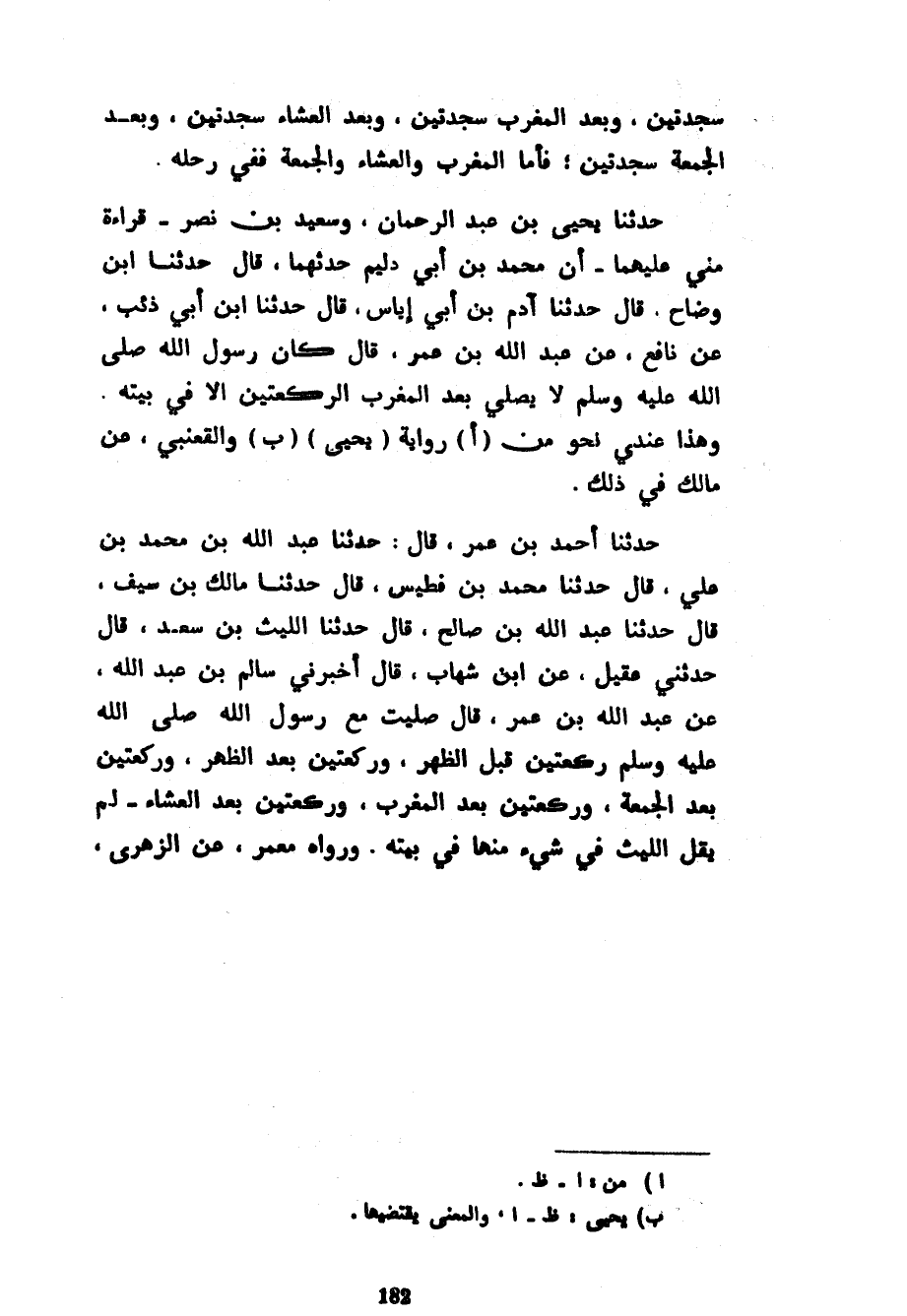 سَجْدَتَيْنِ وَبَعْدَ الْمَغْرِبِ سَجْدَتَيْنِ وَبَعْدَ الْعَشَاءِ سَجْدَتَيْنِ وَبَعْدَ الْجُمُعَةِ سَجْدَتَيْنِ فَأَمَّا الْمَغْرِبُ وَالْعَشَاءُ وَالْجُمُعَةُ ففي رحله حدثنا يحيى بن عبد الرحمان وَسَعِيدُ بْنُ نَصْرٍ قِرَاءَةً مِنِّي عَلَيْهِمَا أَنَّ مُحَمَّدَ بْنَ أَبِي دُلَيْمٍ حَدَّثَهُمَا قَالَ حَدَّثَنَا ابْنُ وَضَّاحٍ قَالَ حَدَّثَنَا آدَمُ بْنُ أَبِي إِيَاسٍ قَالَ حَدَّثَنَا ابْنُ أَبِي ذِئْبٍ عَنْ نَافِعٍ عَنْ عَبْدِ اللَّهِ بْنِ عُمَرَ قَالَ كَانَ رَسُولُ اللَّهِ صَلَّى اللَّهُ عَلَيْهِ وَسَلَّمَ لَا يُصَلِّي بَعْدَ الْمَغْرِبِ الرَّكْعَتَيْنِ إِلَّا فِي بَيْتِهِ وَهَذَا عِنْدِي نَحْوٌ مَنْ رِوَايَةِ (يَحْيَى) (ب) وَالْقَعْنَبِيِّ عَنْ مَالِكٍ فِي ذَلِكَ حَدَّثَنَا أَحْمَدُ بْنُ عُمَرَ قَالَ حَدَّثَنَا عَبْدُ اللَّهِ بْنُ مُحَمَّدِ بْنِ عَلِيٍّ قَالَ حَدَّثَنَا مُحَمَّدُ بْنُ فُطَيْسٍ قَالَ حَدَّثَنَا مَالِكُ بْنُ سَيْفٍ قَالَ حَدَّثَنَا عَبْدُ اللَّهِ بْنُ صَالِحٍ قَالَ حَدَّثَنَا اللَّيْثُ بْنُ سَعْدٍ قَالَ حَدَّثَنِي عُقَيْلٌ عَنِ ابْنِ شِهَابٍ قَالَ أَخْبَرَنِي سَالِمِ بْنِ عَبْدِ اللَّهِ عَنْ عَبْدِ اللَّهِ بْنِ عُمَرَ قَالَ صَلَّيْتُ مَعَ رَسُولِ اللَّهِ صَلَّى اللَّهُ عَلَيْهِ وَسَلَّمَ رَكْعَتَيْنِ قَبْلَ الظُّهْرِ وَرَكْعَتَيْنِ بَعْدَ الظُّهْرِ وَرَكْعَتَيْنِ بَعْدَ الْجُمُعَةِ وَرَكْعَتَيْنِ بَعْدَ الْمَغْرِبِ وَرَكْعَتَيْنِ بَعْدَ الْعَشَاءِ لَمْ يَقُلِ اللَّيْثُ فِي شَيْءٍ مِنْهَا فِي بَيْتِهِ وَرَوَاهُ مَعْمَرٌ عَنِ الزُّهْرِيِّ