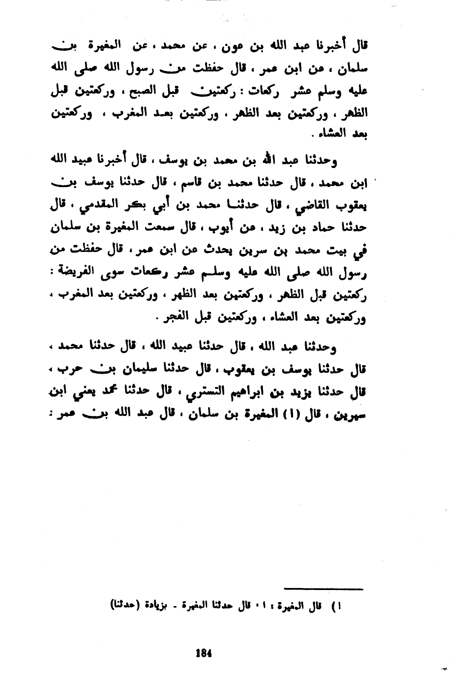 قَالَ أَخْبَرَنَا عَبْدُ اللَّهِ بْنُ عَوْنٍ عَنْ مُحَمَّدٍ عَنْ الْمُغِيرَةِ بْنِ سَلْمَانَ عَنِ ابْنِ عُمَرَ قَالَ حَفِظْتَ مِنْ رَسُولِ اللَّهِ صَلَّى اللَّهُ عَلَيْهِ وَسَلَّمَ عَشْرَ رَكَعَاتٍ رَكْعَتَيْنِ قَبْلَ الصُّبْحِ وَرَكْعَتَيْنِ قَبْلَ الظُّهْرِ وَرَكْعَتَيْنِ بَعْدَ الظُّهْرِ وَرَكْعَتَيْنِ بَعْدَ الْمَغْرِبِ وَرَكْعَتَيْنِ بَعْدَ الْعَشَاءِ وَحَدَّثَنَا عَبْدُ اللَّهِ بْنُ مُحَمَّدِ بْنِ يُوسُفَ قَالَ أَخْبَرَنَا عُبَيْدُ اللَّهِ بْنُ مُحَمَّدٍ قَالَ حَدَّثَنَا مُحَمَّدُ بْنُ قَاسِمٍ قَالَ حَدَّثَنَا يُوسُفُ بْنُ يَعْقُوبَ الْقَاضِي قَالَ حَدَّثَنَا مُحَمَّدُ بْنُ أَبِي بَكْرٍ الْمُقَدَّمِيُّ قَالَ حَدَّثَنَا حَمَّادُ بْنُ زَيْدٍ عَنْ أَيُّوبَ قَالَ سَمِعْتُ الْمُغِيرَةَ بْنَ سَلْمَانَ فِي بَيْتِ مُحَمَّدِ بْنِ سِرِينَ يُحَدِّثُ عَنِ ابْنِ عُمَرَ قَالَ حَفِظْتَ مِنْ رَسُولِ اللَّهِ صَلَّى اللَّهُ عَلَيْهِ وَسَلَّمَ عَشْرَ رَكَعَاتٍ سِوَى الْفَرِيضَةِ رَكْعَتَيْنِ قَبْلَ الظُّهْرِ وَرَكْعَتَيْنِ بَعْدَ الظُّهْرِ وَرَكْعَتَيْنِ بَعْدَ الْمَغْرِبِ وَرَكْعَتَيْنِ بَعْدَ الْعَشَاءِ وَرَكْعَتَيْنِ قَبْلَ الْفَجْرِ وَحَدَّثَنَا عَبْدُ اللَّهِ قَالَ حَدَّثَنَا عُبَيْدُ اللَّهِ قَالَ حَدَّثَنَا مُحَمَّدٌ قَالَ حَدَّثَنَا يُوسُفُ بْنُ يَعْقُوبَ قَالَ حَدَّثَنَا سُلَيْمَانُ بْنُ حَرْبٍ قَالَ حَدَّثَنَا يَزِيدُ بْنُ إِبْرَاهِيمَ التُّسْتَرِيُّ قَالَ حَدَّثَنَا مُحَمَّدٌ يَعْنِي ابْنَ سِيرِينَ قَالَ الْمُغِيرَةُ بْنُ سَلْمَانَ قَالَ عَبْدُ اللَّهِ بْنُ عمر