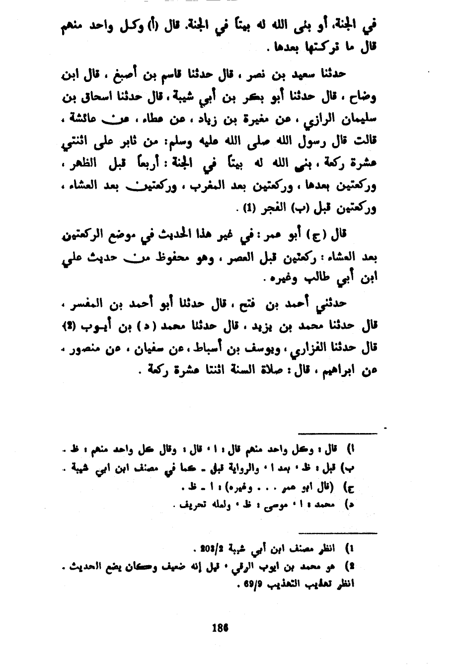 فِي الْجَنَّةِ أَوْ بَنَى اللَّهُ لَهُ بَيْتًا فِي الْجَنَّةِ قَالَ وَكُلُّ وَاحِدٍ مِنْهُمْ قَالَ مَا تَرَكْتُهَا بَعْدَهَا حَدَّثَنَا سَعِيدُ بْنُ نَصْرٍ قَالَ حَدَّثَنَا قَاسِمُ بْنُ أَصْبَغَ قَالَ ابْنُ وَضَّاحٍ قَالَ حَدَّثَنَا أَبُو بَكْرِ بْنُ أَبِي شَيْبَةَ قَالَ حَدَّثَنَا إِسْحَاقُ بْنُ سُلَيْمَانَ الرَّازِيُّ عَنْ مُغِيرَةَ بْنِ زِيَادٍ عَنْ عَطَاءٍ عَنْ عَائِشَةَ قَالَتْ قَالَ رَسُولُ اللَّهِ صَلَّى اللَّهُ عَلَيْهِ وَسَلَّمَ مَنْ ثَابَرَ عَلَى اثْنَتَيْ عَشْرَةَ رَكْعَةً بَنَى اللَّهُ لَهُ بَيْتًا فِي الْجَنَّةِ أَرْبَعًا قَبْلَ الظُّهْرِ وَرَكْعَتَيْنِ بَعْدَهَا وَرَكْعَتَيْنِ بَعْدَ الْمَغْرِبِ وَرَكْعَتَيْنِ بَعْدَ الْعَشَاءِ وَرَكْعَتَيْنِ قَبْلَ الْفَجْرِ قال أبو عمر في غير هَذَا الْحَدِيثُ فِي مَوْضِعِ الرَّكْعَتَيْنِ بَعْدَ الْعَشَاءِ رَكْعَتَيْنِ قَبْلَ الْعَصْرِ وَهُوَ مَحْفُوظٌ مِنْ حَدِيثِ عَلِيِّ بْنِ أَبِي طَالِبٍ وَغَيْرِهِ حَدَّثَنِي أَحْمَدُ بْنُ فَتْحٍ قَالَ حَدَّثَنَا أَبُو أَحْمَدَ بْنُ الْمُفَسِّرِ قَالَ حَدَّثَنَا مُحَمَّدُ بْنُ يَزِيدَ قَالَ حَدَّثَنَا مُحَمَّدُ بْنُ أَيُّوبَ قَالَ حَدَّثَنَا الْفَزَارِيُّ وَيُوسُفُ بْنُ أَسْبَاطٍ عَنْ سُفْيَانَ عَنْ مَنْصُورٍ عَنْ إِبْرَاهِيمَ قَالَ صَلَاةُ السُّنَّةِ اثْنَتَا عَشْرَةَ ركعة