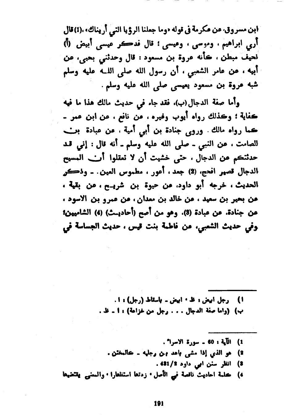 ابْنِ مَسْرُوقٍ عَنْ عِكْرِمَةَ فِي قَوْلِهِ وَمَا جَعَلْنَا الرُّؤْيَا الَّتِي أَرَيْنَاكَ قَالَ أُرِيَ إِبْرَاهِيمَ وموسى وعيسى قال فذكر عيسى أبيض نحيف مبطن كَأَنَّهُ عُرْوَةُ بْنُ مَسْعُودٍ قَالَ وَحَدَّثَنِي يَحْيَى عَنْ أَبِيهِ عَنْ عَامِرٍ الشَّعْبِيِّ أَنَّ رَسُولَ اللَّهِ صَلَّى اللَّهُ عَلَيْهِ وَسَلَّمَ شَبَّهَ عُرْوَةَ بْنَ مَسْعُودٍ بِعِيسَى صَلَّى اللَّهُ عَلَيْهِ وَسَلَّمَ وَأَمَّا صِفَةُ الدَّجَّالِ فَقَدْ جَاءَ فِي حَدِيثِ مَالِكٍ هَذَا مَا فِيهِ كِفَايَةٌ وَكَذَلِكَ رَوَاهُ أَيُّوبُ وَغَيْرُهُ عَنْ نَافِعٍ عَنِ ابْنِ عُمَرَ كَمَا رَوَاهُ مَالِكٌ وَرَوَى جُنَادَةُ بْنُ أَبِي أُمَيَّةَ عَنْ عُبَادَةَ بْنِ الصَّامِتِ عَنِ النَّبِيِّ صَلَّى اللَّهُ عَلَيْهِ وَسَلَّمَ أَنَّهُ قَالَ إِنِّي قَدْ حَدَّثْتُكُمْ عَنِ الدَّجَّالِ حَتَّى خَشِيتُ أَنْ لَا تَعْقِلُوا أَنَّ الْمَسِيحَ الدَّجَّالَ قَصِيرٌ أَفْحَجُ جَعْدٌ أَعْوَرُ مَطْمُوسُ الْعَيْنِ وَذَكَرَ الْحَدِيثَ خَرَّجَهُ أَبُو دَاوُدَ عَنْ حَيْوَةَ بْنِ شُرَيْحٍ عَنْ بَقِيَّةَ عَنْ بَحِيرِ بْنِ سَعِيدٍ عَنْ خَالِدِ بْنِ مَعْدَانَ عَنْ عَمْرِو بْنِ الْأَسْوَدِ عَنْ جُنَادَةَ عَنْ عُبَادَةَ وَهُوَ مِنْ أَصَحِّ (أَحَادِيثِ) الشَّامِيِّينَ وَفِي حَدِيثِ الشَّعْبِيِّ عَنْ فَاطِمَةَ بِنْتِ قَيْسٍ حَدِيثُ الْجَسَّاسَةِ فِي