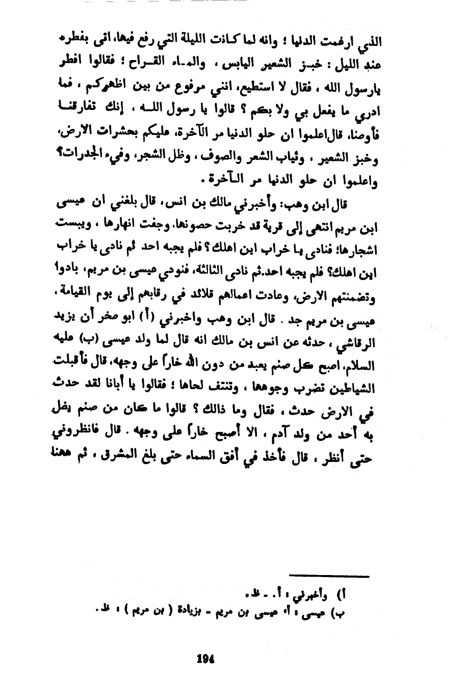 الذي أرغمت الدنيا وإنه لما كانت اللَّيْلَةُ الَّتِي رُفِعَ فِيهَا أَتَى بِفِطْرِهِ عِنْدَ اللَّيْلِ خُبْزُ الشَّعِيرِ الْيَابِسِ وَالْمَاءُ الْقِرَاحِ فَقَالُوا افْطِرْ يَا رَسُولَ اللَّهِ فَقَالَ لَا أَسْتَطِيعُ إنني مرفوع من بين أظهركم فيما أَدْرِي مَا يَفْعَلُ بِي وَلَا بِكُمْ قَالُوا يَا رَسُولَ اللَّهِ إِنَّكَ تُفَارِقُنَا فَأَوْصِنَا قَالَ اعْلَمُوا أَنَّ حُلْوَ الدُّنْيَا مُرَّ الْآخِرَةِ عَلَيْكُمْ بِحَشَرَاتِ الْأَرْضِ وَخُبْزِ الشَّعِيرِ وَثِيَابِ الشَّعْرِ وَالصُّوفِ وَظِلِّ الشَّجَرِ وَفَيْءِ الْجَدَرَاتِ وَاعْلَمُوا أَنَّ حُلْوَ الدُّنْيَا مُرُّ الْآخِرَةِ قَالَ ابْنُ وَهْبٍ وَأَخْبَرَنِي مَالِكُ بْنُ أَنَسٍ قَالَ بَلَغَنِي أَنَّ عِيسَى بْنَ مَرْيَمَ انْتَهَى إِلَى قَرْيَةٍ قَدْ خَرِبَتْ حُصُونُهَا وَجَفَّتْ أَنْهَارُهَا وَيَبِسَتْ أَشْجَارُهَا فَنَادَى يَا خراب أين أهلك فلم يجبه أحد ثم نَادَى يَا خَرَابُ أَيْنَ أَهْلُكَ فَلَمْ يُجِبْهُ أَحَدٌ ثُمَّ نَادَى الثَّالِثَةَ فَنُودِيَ عِيسَى بْنُ مَرْيَمَ بَادُوا وَتَضَمَّنَتْهُمُ الْأَرْضُ وَعَادَتْ أَعْمَالُهُمْ قَلَائِدَ فِي رِقَابِهِمْ إِلَى يَوْمِ الْقِيَامَةِ عِيسَى بْنُ مَرْيَمَ جدٌّ قَالَ ابْنُ وَهْبٍ وَأَخْبَرَنِي أَبُو صَخْرٍ أَنَّ يَزِيدَ الرَّقَاشِيَّ حَدَّثَهُ عَنْ أَنَسِ بْنِ مَالِكٍ أَنَّهُ قَالَ لَمَّا وُلِدَ عِيسَى عَلَيْهِ السَّلَامُ أَصْبَحَ كُلُّ صَنَمٍ يُعْبَدُ مِنْ دُونِ اللَّهِ خَارًّا عَلَى وَجْهِهِ قَالَ فَأَقْبَلَتِ الشَّيَاطِينُ تَضْرِبُ وُجُوهَهَا وَتَنْتِفُ لِحَاهَا فَقَالُوا يَا أَبَانَا لَقَدْ حَدَثَ فِي الْأَرْضِ حَدَثٌ فَقَالَ وَمَا ذَلِكَ قَالُوا مَا كَانَ مِنْ صَنَمٍ يُضَلُّ بِهِ أَحَدٌ مِنْ وَلَدِ آدَمَ إِلَّا أَصْبَحَ خَارًّا عَلَى وَجْهِهِ قَالَ فَانْظُرُونِي حَتَّى أَنْظُرَ قَالَ فَأَخَذَ فِي أُفُقِ السَّمَاءِ حَتَّى بلغ المشرق ثم ههنا